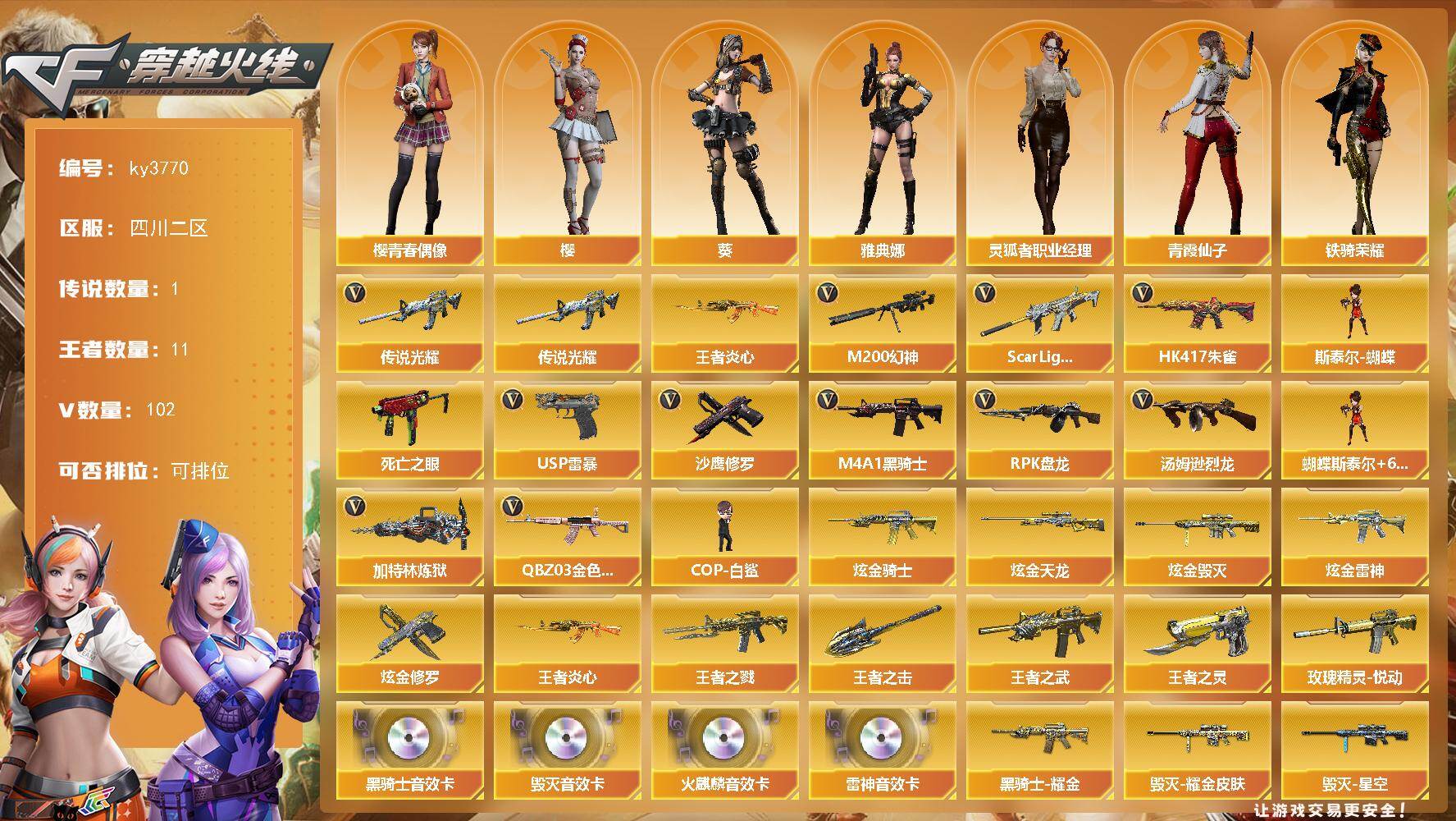 [14074478]四川二区-102V-11王者-8炫金 【传说武器】:传说光耀 【热门武器】:传说光耀,QBZ03-金色蔷薇,Scar Light-白虎,HK417-朱雀*2,M200-幻神,死亡之眼,王者炎心*2,M4A1-黑骑士,汤姆逊-烈龙*10,RPK-盘龙*6,加特林-炼狱*3,斯泰尔-蝴蝶,COP-白鲨,USP-雷暴,沙鹰-修罗*6 【王者炫金武器】:王者炎心*2,王者之戮,王者之武,玫瑰精灵-悦动,王者之灵*2,王者之击,炫金骑士*2,炫金雷神,炫金毁灭*2,炫金天龙*2,炫金修罗 【音效卡】:AK47-火麒麟音效卡,M4A1-雷神音效卡,M4A1-黑骑士音效卡,Barrett-毁灭音效卡*2 【皮肤】:雷神-暗月,雷神-能量核心,雷神-虎将,火麒麟-华夏之心*3,AK47-火麒麟-传奇EVEN,毁灭耀金皮肤*2,毁灭-星空,毁灭-黑大圣皮肤,黑骑士耀金皮肤,无影-能量核心,AWM-天龙-传奇白鲨,修罗-星空 【角色】:葵,樱,娟娟,灵狐者-黄金海岸,灵狐者-职业经理,潘多拉-X,青霞仙子,铁骑荣耀,樱-青春偶像,雅典娜 【人偶武器】:COP-白鲨,火麒麟-灵狐*2,斯泰尔-蝴蝶,迷你生化手雷 【暴走生化】:死亡之眼 【挑战大师】:神圣爆裂者III*2,激光毁灭者III,KAC-圣炎切割者III 【英雄级武器】:AK47-火麒麟*2,M4A1-雷神*4,M4A1-黑骑士,AK47-无影,AK12-天启*4,AK47-黑鲨*2,M4A1-龙血*3,AK47-雷暴,HK417-朱雀*2,Scar Light-白虎,QBZ03-金色蔷薇,王者之魄-觉醒版,王者之势-觉醒版,AK-47-猩红传说,AWM-天龙*8,Barrett-毁灭*2,Barrett-极光,AWM-裁决*2,M200-幻神,Barrett-金色蔷薇,RPK-盘龙*6,加特林-炼狱*3,汤姆逊-烈龙*10,AA-12-雷霆*2,沙鹰-修罗*6,沙鹰-天神*2,USP-雷暴,柯尔特-电竞装甲,屠龙,龙啸*2,擎天*4,麒麟刺*2,斩神刀-雷暴,高爆手雷-雷暴*5,闪光弹-雷暴*5,烟雾弹-雷暴*5 【道具】:BS战队炫彩背包,Q9战队炫彩背包,XROCK炫彩背包,战舰背包,炫彩背包,变异宝贝,夺命之镰,防化服,星辰流光-枪王排位,枪王排位28赛季金色流光,防弹头盔,防弹衣,C4工具钳,手雷包 【特殊枪械】:蝴