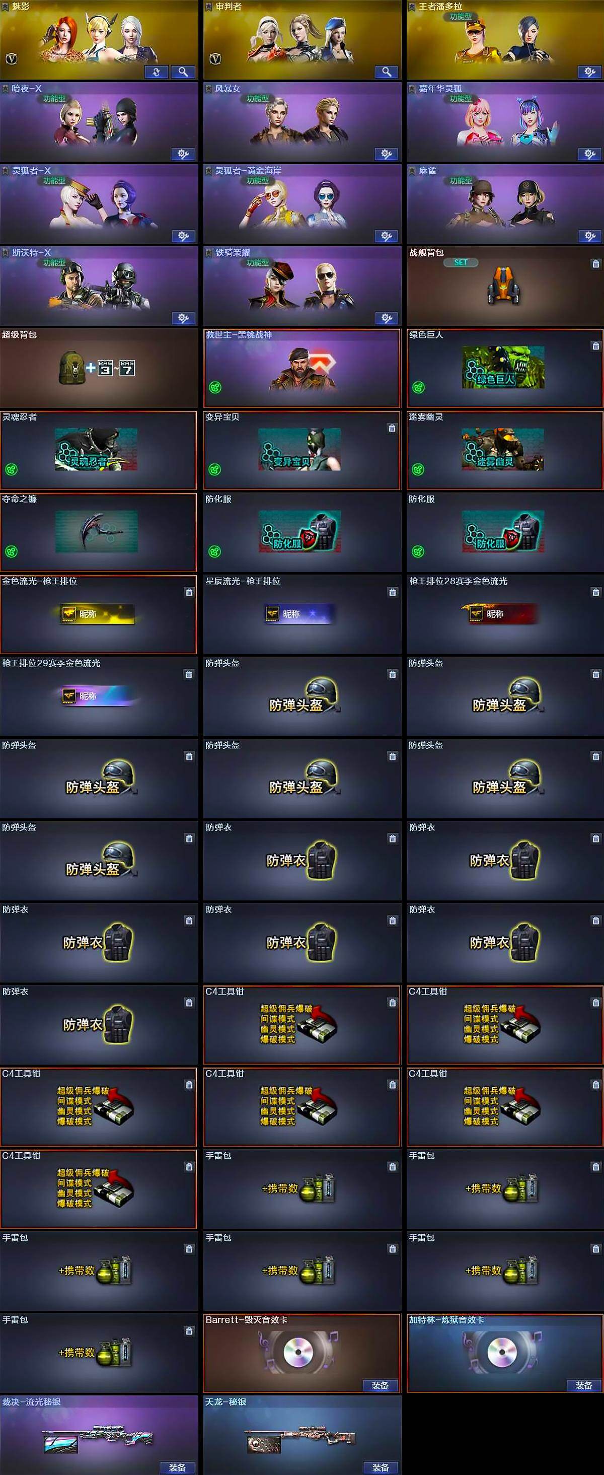 【道具】:战舰背包,超级背包,救世主-黑桃战神,绿色巨人,灵魂忍者,变异宝贝,迷雾幽灵,夺命之镰,防化服*2,金色流光-枪王排位,星辰流光-枪王排位,枪王排位28赛季金色流光,枪王排位29赛季金色流光,防弹头盔*6,防弹衣*6,C4工具钳*6,手雷包*6