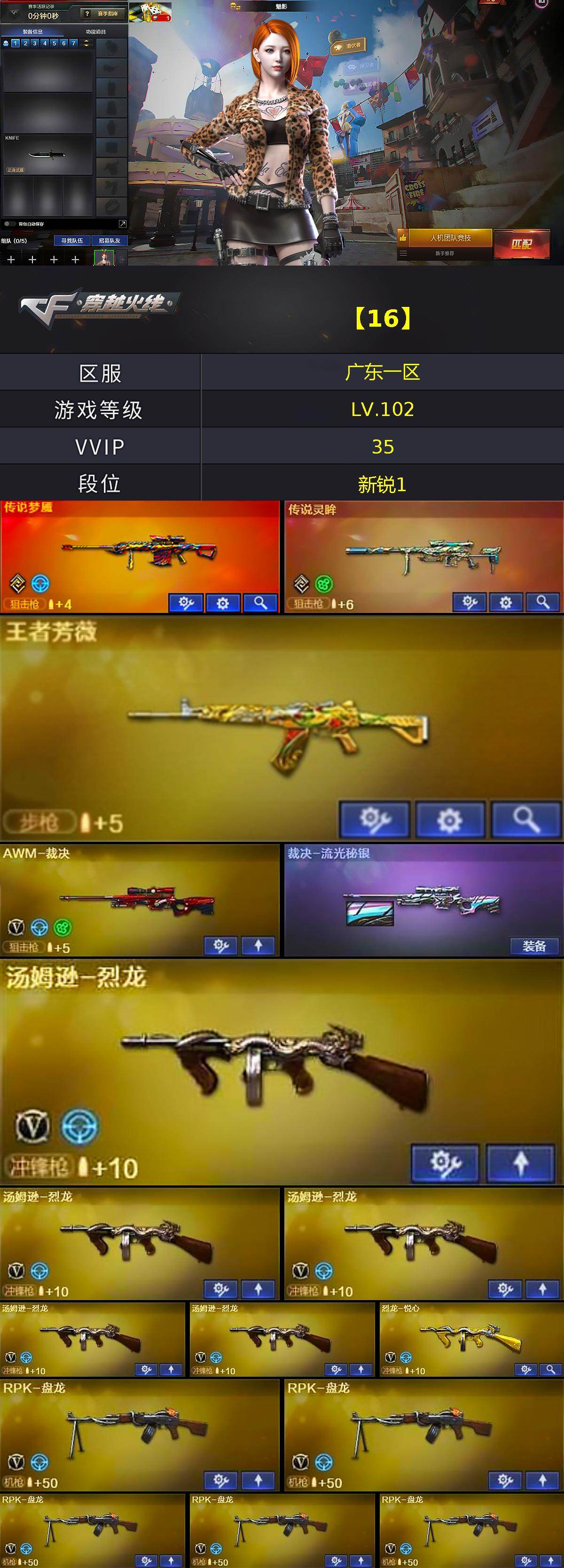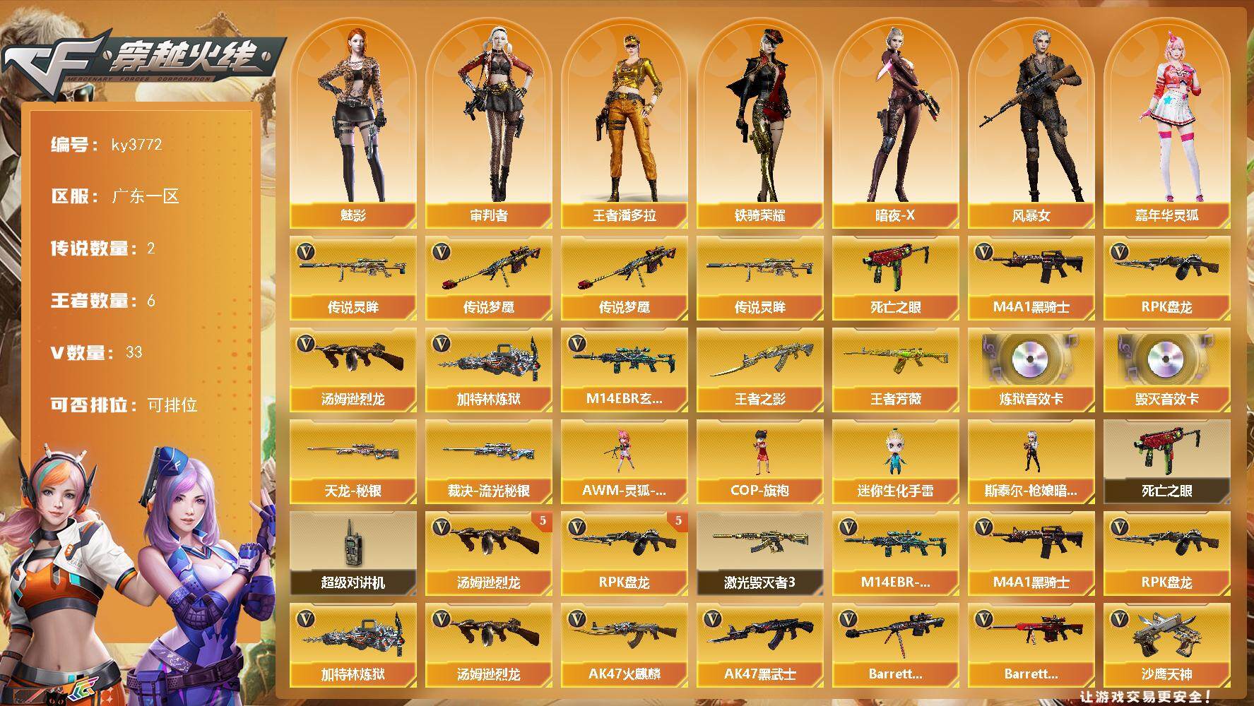 [14074620]广东一区-33V-6王者-0炫金 【传说武器】:传说梦魇,传说灵眸 【热门武器】:传说梦魇,传说灵眸,M14EBR-玄武,死亡之眼*3,M4A1-黑骑士,汤姆逊-烈龙*5,RPK-盘龙*5,加特林-炼狱*2 【王者炫金武器】:王者之影,王者芳薇 【音效卡】:Barrett-毁灭音效卡,加特林-炼狱音效卡 【皮肤】:裁决-流光秘银,天龙-秘银 【角色】:魅影,审判者,王者潘多拉,暗夜-X,风暴女,嘉年华灵狐,灵狐者-X,灵狐者-黄金海岸,麻雀,斯沃特-X,铁骑荣耀 【人偶武器】:斯泰尔-枪娘暗刃,AWM-灵狐-15周年嘉年华,COP-旗袍,迷你生化手雷*3 【暴走生化】:死亡之眼*3,超级对讲机 【挑战大师】:激光毁灭者III 【英雄级武器】:AK47-火麒麟,M4A1-黑骑士,AK47-黑武士,M4A1-龙血,M14EBR-玄武,Barrett-毁灭,Barrett-极光,AWM-裁决,王者之光-觉醒版,RPK-盘龙*5,加特林-炼狱*2,悦蓝-惊涛骇浪-觉醒版,汤姆逊-烈龙*5,烈龙-悦心-觉醒版,AA-12-雷霆*2,沙鹰-天神,屠龙*2,龙啸,擎天,麒麟刺*4 【道具】:战舰背包,超级背包,救世主-黑桃战神,绿色巨人,灵魂忍者,变异宝贝,迷雾幽灵,夺命之镰,防化服*2,金色流光-枪王排位,星辰流光-枪王排位,枪王排位28赛季金色流光,枪王排位29赛季金色流光,防弹头盔*6,防弹衣*6,C4工具钳*6,手雷包*6 【特殊枪械】:1黑骑士,5烈龙,5盘龙,2炼狱