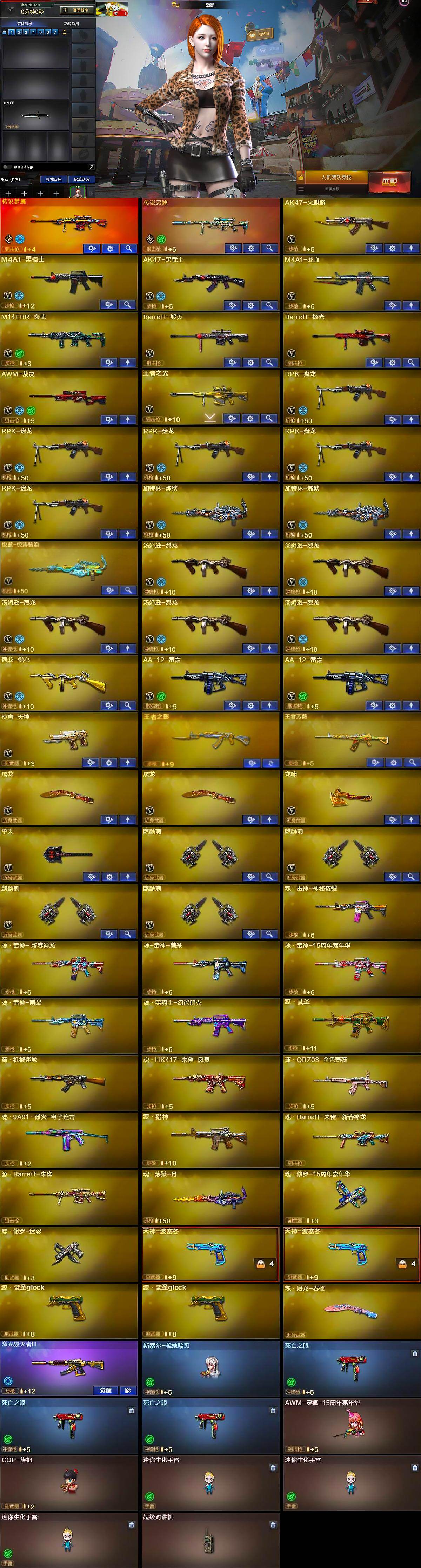 【英雄级武器】:AK47-火麒麟,M4A1-黑骑士,AK47-黑武士,M4A1-龙血,M14EBR-玄武,Barrett-毁灭,Barrett-极光,AWM-裁决,王者之光-觉醒版,RPK-盘龙*5,加特林-炼狱*2,悦蓝-惊涛骇浪-觉醒版,汤姆逊-烈龙*5,烈龙-悦心-觉醒版,AA-12-雷霆*2,沙鹰-天神,屠龙*2,龙啸,擎天,麒麟刺*4