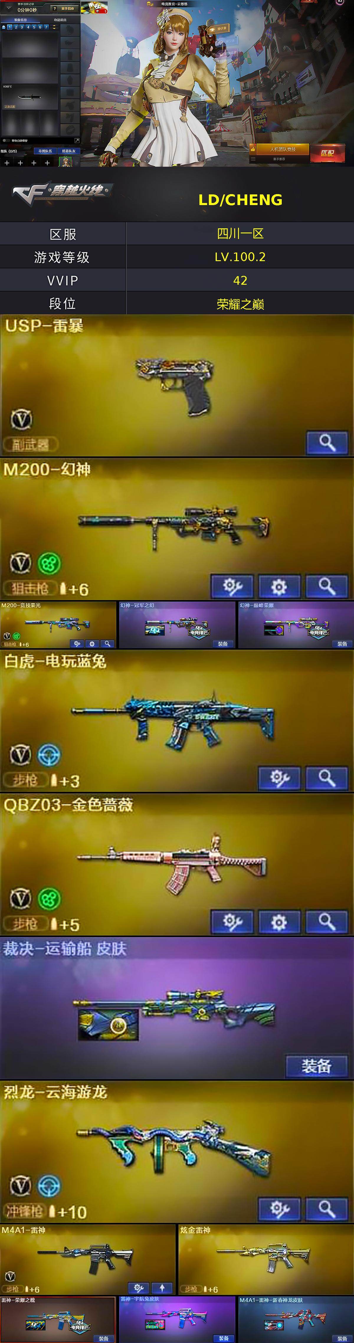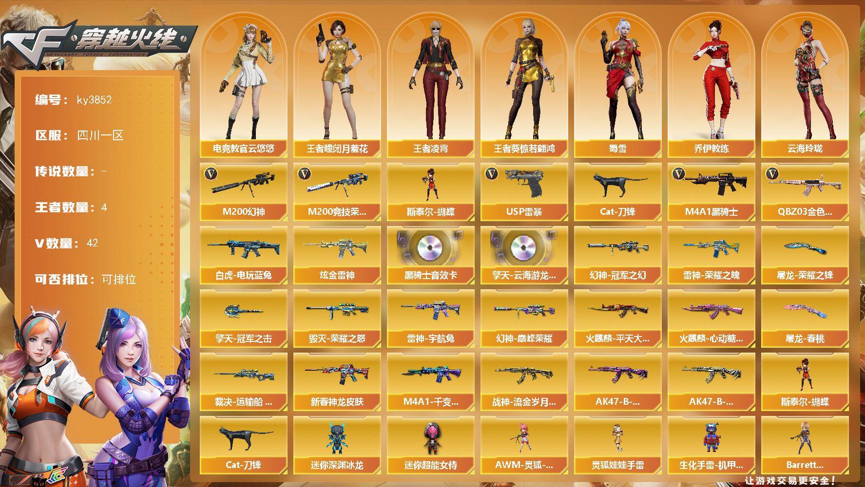 [14074655]四川一区-42V-4王者-1炫金 【热门武器】:QBZ03-金色蔷薇,M200-幻神,M200-竞技荣光,白虎-电玩蓝兔,Cat-刀锋,M4A1-黑骑士,斯泰尔-蝴蝶,USP-雷暴 【王者炫金武器】:炫金雷神 【音效卡】:擎天-云海游龙音效卡,M4A1-黑骑士音效卡 【皮肤】:幻神-冠军之幻,幻神-巅峰荣耀,裁决-运输船 皮肤,雷神-荣耀之魄,雷神-宇航兔皮肤,M4A1-雷神-新春神龙皮肤,火麒麟-平天大圣,火麒麟-心动糖果,毁灭-荣耀之怒,M4A1-千变-孔明皮肤,战神-流金岁月皮肤*2,AK47-B-常胜将军-曹操*2,AK47-B-常胜将军-刘备,屠龙-荣耀之锋,屠龙-春桃 皮肤,擎天-冠军之击 【角色】:电竞教官-云悠悠,王者-瞳-闭月羞花,王者葵-惊若翩鸿,王者凌霄,乔伊教练,云海玲珑,暗夜-X,初恋灵狐,芳心审判者,娟娟,兰-新年限定,猎狐者-追月,灵狐-花神,龙儿-小淘气,麻雀,潘多拉-X,潘多拉-甜心教官,蜀雪,兔囡囡,夜玫瑰-幻能朋克,樱-战斗天使 【人偶武器】:斯泰尔-蝴蝶,Barrett-云海玲珑,AWM-灵狐-15周年嘉年华,Cat-刀锋,迷你深渊冰龙,生化手雷-机甲核心,迷你超能女侍,灵狐娃娃手雷*2 【暴走生化】:超级对讲机 【挑战大师】:冰龙粉碎者-白马银枪*2,激光毁灭者III-白马银枪*2 【英雄级武器】:AK47-火麒麟*2,M4A1-黑龙,M4A1-雷神,M4A1-黑骑士,AN94-超新星,无影-神兵利器,QBZ03-金色蔷薇,烈火-动感闪耀,白虎-电玩蓝兔,Barrett-毁灭,M200-幻神,M200-竞技荣光,烈龙-云海游龙,USP-雷暴,天神-动感闪耀,修罗-云海游龙,屠龙,擎天,屠龙-动感闪耀,擎天-云海游龙,斩神刀-雷暴,高爆手雷-雷暴*4,高爆手雷-竞技荣光,手雷-动感闪耀,手雷-云海游龙,闪光弹-雷暴*4,闪光弹-竞技荣光,烟雾弹-雷暴*4,烟雾弹-竞技荣光 【道具】:BS战队炫彩背包,XROCK炫彩背包,云山科技背包,云海游龙炫彩背包,炫彩背包,虎牙炫彩背包,超级背包,女皇终结者-魔龙之吻,绿色巨人,灵魂忍者,迷雾幽灵,夺命之镰*2,防化服*4,金色流光-枪王排位*2,枪王排位28赛季金色流光,枪王排位29赛季金色流光,电玩兔兔表情,动感闪耀表情,云海游龙表情,EP战队名片,防弹头盔*6,防弹衣*6,C4工具