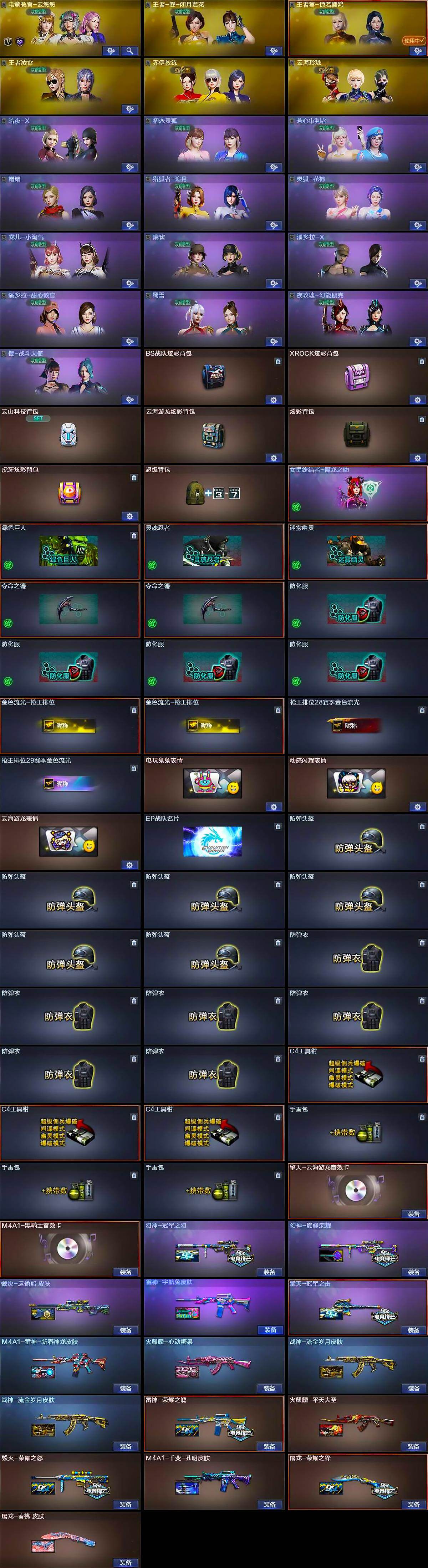 【道具】:BS战队炫彩背包,XROCK炫彩背包,云山科技背包,云海游龙炫彩背包,炫彩背包,虎牙炫彩背包,超级背包,女皇终结者-魔龙之吻,绿色巨人,灵魂忍者,迷雾幽灵,夺命之镰*2,防化服*4,金色流光-枪王排位*2,枪王排位28赛季金色流光,枪王排位29赛季金色流光,电玩兔兔表情,动感闪耀表情,云海游龙表情,EP战队名片,防弹头盔*6,防弹衣*6,C4工具
