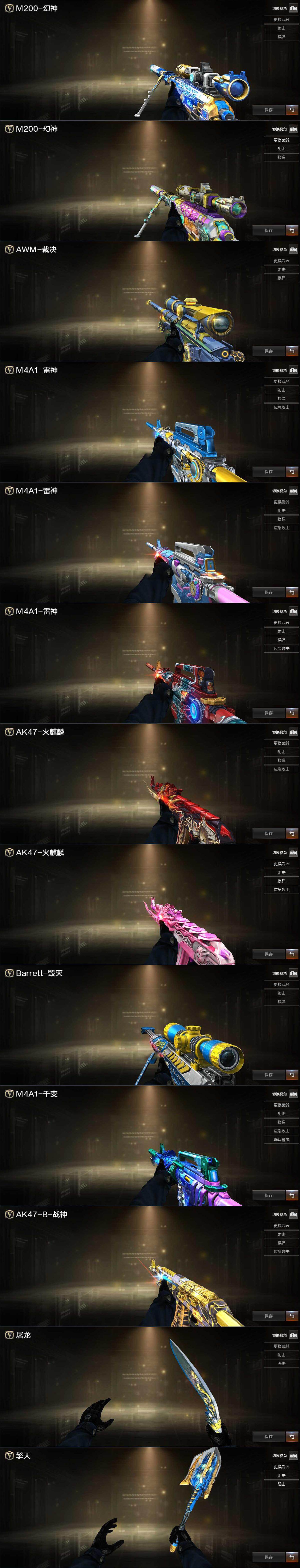【皮肤】:幻神-冠军之幻,幻神-巅峰荣耀,裁决-运输船 皮肤,雷神-荣耀之魄,雷神-宇航兔皮肤,M4A1-雷神-新春神龙皮肤,火麒麟-平天大圣,火麒麟-心动糖果,毁灭-荣耀之怒,M4A1-千变-孔明皮肤,战神-流金岁月皮肤*2,AK47-B-常胜将军-曹操*2,AK47-B-常胜将军-刘备,屠龙-荣耀之锋,屠龙-春桃 皮肤,擎天-冠军之击