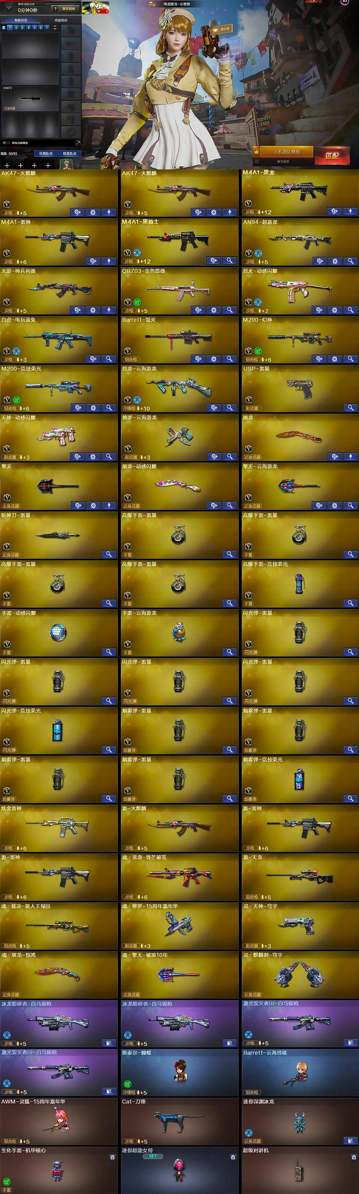 【英雄级武器】:AK47-火麒麟*2,M4A1-黑龙,M4A1-雷神,M4A1-黑骑士,AN94-超新星,无影-神兵利器,QBZ03-金色蔷薇,烈火-动感闪耀,白虎-电玩蓝兔,Barrett-毁灭,M200-幻神,M200-竞技荣光,烈龙-云海游龙,USP-雷暴,天神-动感闪耀,修罗-云海游龙,屠龙,擎天,屠龙-动感闪耀,擎天-云海游龙,斩神刀-雷暴,高爆手雷-雷暴*4,高爆手雷-竞技荣光,手雷-动感闪耀,手雷-云海游龙,闪光弹-雷暴*4,闪光弹-竞技荣光,烟雾弹-雷暴*4,烟雾弹-竞技荣光