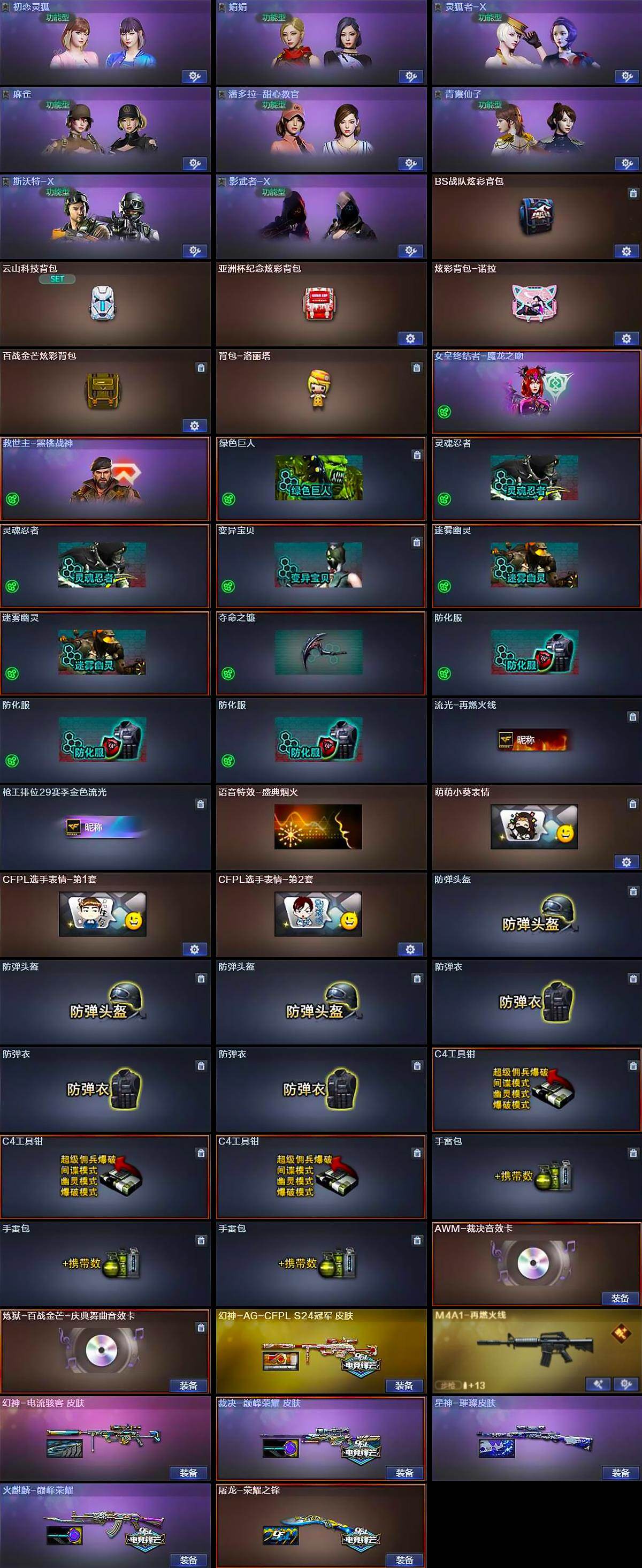 【道具】:BS战队炫彩背包,云山科技背包,亚洲杯纪念炫彩背包,炫彩背包-诺拉,百战金芒炫彩背包,背包-洛丽塔,女皇终结者-魔龙之吻,救世主-黑桃战神,绿色巨人,灵魂忍者*2,变异宝贝,迷雾幽灵*2,夺命之镰,防化服*3,流光-再燃火线,枪王排位29赛季金色流光,语音特效-盛典烟火,萌萌小葵表情,CFPL选手表情-第1套,CFPL选手表情-第2套,防弹头盔*3,防弹衣*3,C4工具钳*3,手雷包*3