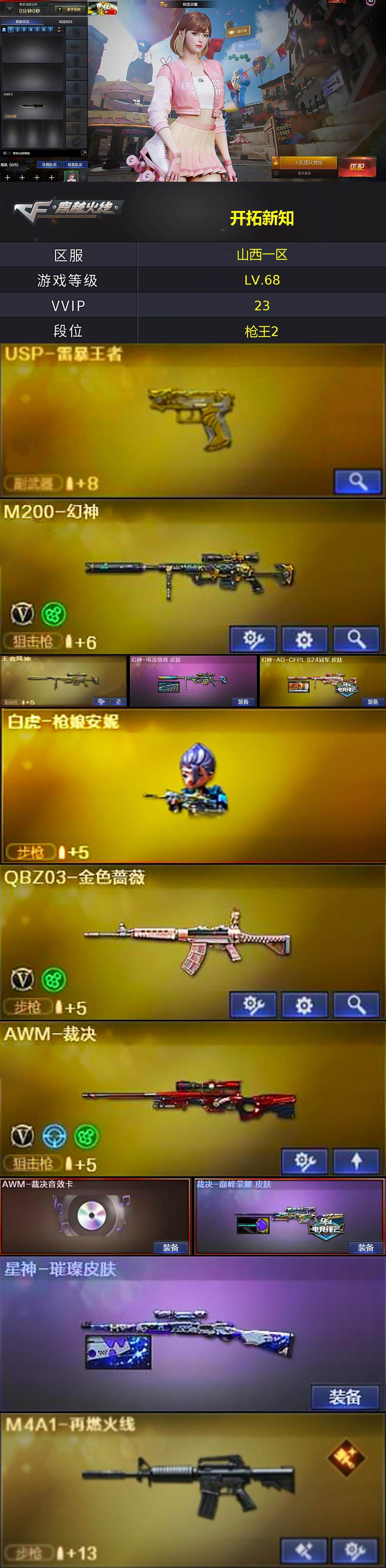 [14075533]山西一区-22V-3王者-0炫金 【热门武器】:QBZ03-金色蔷薇,M200-幻神,荣耀世冠-火麒麟,白虎-枪娘安妮 【王者炫金武器】:王者风神,USP-雷暴王者 【音效卡】:AWM-裁决音效卡,炼狱-百战金芒-庆典舞曲音效卡 【皮肤】:幻神-电流骇客 皮肤,幻神-AG-CFPL S24冠军 皮肤,裁决-巅峰荣耀 皮肤,星神-璀璨皮肤,M4A1-再燃火线,火麒麟-巅峰荣耀,屠龙-荣耀之锋,轻型军用手斧-再燃火线 【角色】:初恋灵狐,娟娟,灵狐者-X,麻雀,潘多拉-甜心教官,青霞仙子,斯沃特-X,影武者-X,智影 【人偶武器】:白虎-枪娘安妮,HK417-朱雀-枪娘菲,金色蔷薇-枪娘阿敏,星神-枪娘默 【暴走生化】:超级对讲机 【挑战大师】:冰龙粉碎者-白马银枪 【英雄级武器】:AK47-火麒麟,QBZ03-金色蔷薇,荣耀世冠-火麒麟,AWM-裁决,M200-幻神,炼狱-百战金芒,AA-12-雷霆,麒麟刺-百战金芒,丛林匕首-玄豹*2,高爆手雷-玄豹*2,闪光弹-玄豹*4,烟雾弹-玄豹*2,M4A1-赤狱骑士,M4A1-苍鸣雷神 【道具】:BS战队炫彩背包,云山科技背包,亚洲杯纪念炫彩背包,炫彩背包-诺拉,百战金芒炫彩背包,背包-洛丽塔,女皇终结者-魔龙之吻,救世主-黑桃战神,绿色巨人,灵魂忍者*2,变异宝贝,迷雾幽灵*2,夺命之镰,防化服*3,流光-再燃火线,枪王排位29赛季金色流光,语音特效-盛典烟火,萌萌小葵表情,CFPL选手表情-第1套,CFPL选手表情-第2套,防弹头盔*3,防弹衣*3,C4工具钳*3,手雷包*3 【特殊枪械】: