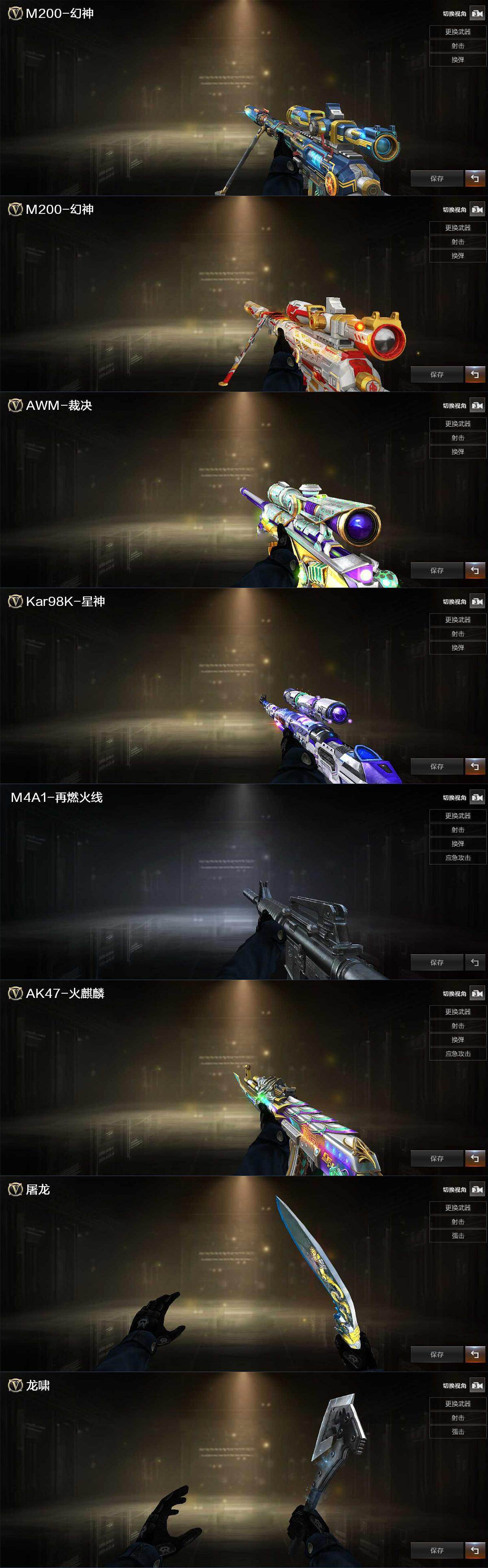 【英雄级武器】:AK47-火麒麟,QBZ03-金色蔷薇,荣耀世冠-火麒麟,AWM-裁决,M200-幻神,炼狱-百战金芒,AA-12-雷霆,麒麟刺-百战金芒,丛林匕首-玄豹*2,高爆手雷-玄豹*2,闪光弹-玄豹*4,烟雾弹-玄豹*2,M4A1-赤狱骑士,M4A1-苍鸣雷神