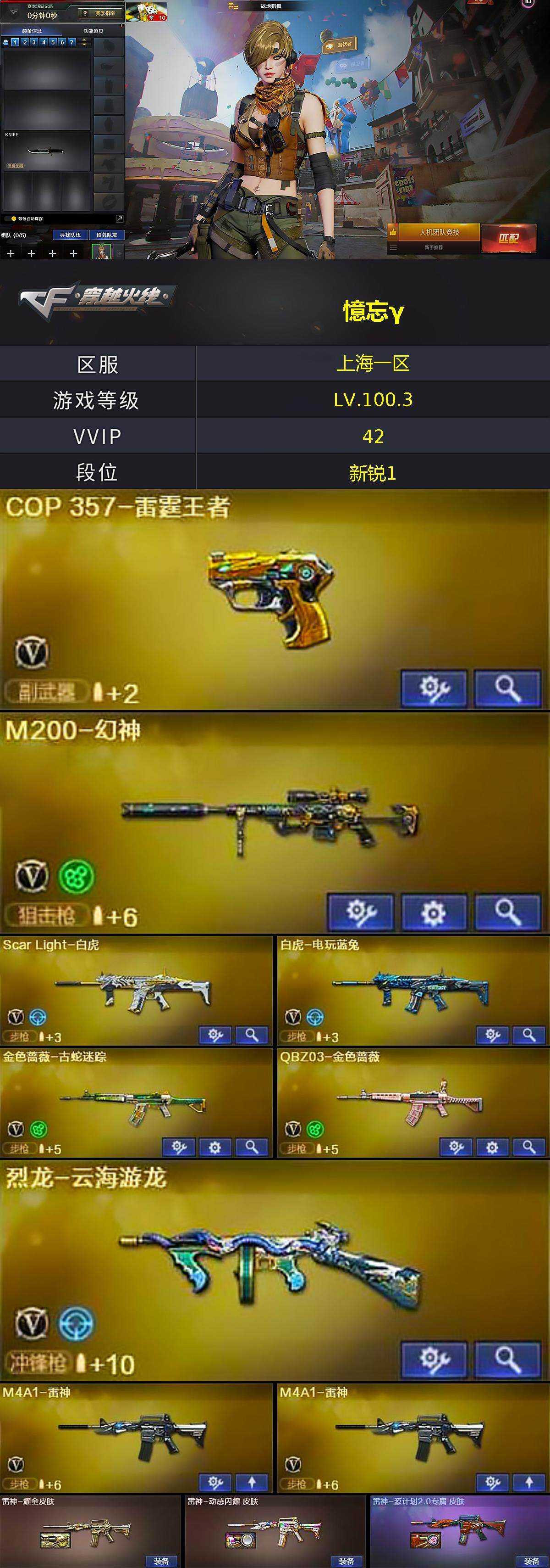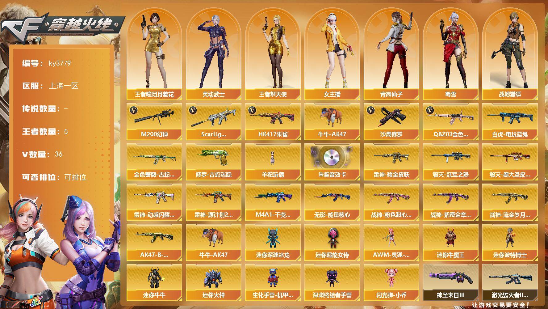 [14076548]上海一区-36V-5王者-0炫金 【热门武器】:QBZ03-金色蔷薇,Scar Light-白虎,HK417-朱雀,M200-幻神,金色蔷薇-古蛇迷踪,修罗-古蛇迷踪,白虎-电玩蓝兔,牛牛-AK47,羊驼玩偶,沙鹰-修罗*2 【音效卡】:HK417-朱雀音效卡 【皮肤】:雷神-耀金皮肤,雷神-动感闪耀 皮肤,雷神-源计划2.0专属 皮肤,毁灭-冠军之怒,毁灭-黑大圣皮肤,M4A1-千变-孔明皮肤,无影-能量核心,战神-粉色甜心皮肤*2,战神-紫绶金章皮肤,战神-流金岁月皮肤,AK47-B-常胜将军-孙权 【角色】:战地猎狐,王者-瞳-闭月羞花,王者炽天使,蛇隐宗,奇洋探员,乔伊教练,云海玲珑,暗夜-X,初恋灵狐,芳心审判者,飞虎队-X,风暴女*2,虎妞,嘉年华灵狐,娟娟,灵动武士,灵狐-花神,灵狐者-X,灵狐者-黄金海岸,灵狐者-七夕宝贝,龙儿,龙儿-小淘气,麻雀,曼陀罗-X,曼陀罗-礼服,萌儿,女主播,潘多拉-X,潘多拉-甜心教官,潜龙队-X,青霞仙子,蛇姬,斯沃特-X,蜀雪,兔囡囡,新娜塔莎,雪莉杨-摸金校尉,游珑儿 【人偶武器】:AWM-灵狐-15周年嘉年华,牛牛-AK47,迷你深渊冰龙,迷你牛魔王,迷你波特博士,迷你牛牛,迷你火种,生化手雷-机甲核心,深渊终结者手雷,闪光弹-小乔,迷你超能女侍 【挑战大师】:AK47-冰龙粉碎者,激光毁灭者III-白马银枪*2,激光毁灭者III,神圣爆裂者-末日III 【英雄级武器】:AK47-火麒麟,M4A1-雷神*2,HK417-朱雀,Scar Light-白虎,QBZ03-天罚,无影-神兵利器,黑武士-锦绣游龙,超新星-热带奇洋,金色蔷薇-古蛇迷踪,QBZ03-金色蔷薇,烈火-动感闪耀,王者之武-觉醒版,王者之势-觉醒版,AK-47-猩红传说*3,AK47-B-战神,黑骑士-海王,白虎-电玩蓝兔,Barrett-毁灭,M200-幻神,烈龙-云海游龙,沙鹰-修罗*2,COP 357-雷霆王者-觉醒版,天神-动感闪耀,修罗-古蛇迷踪,麒麟刺,幻灵之锋,屠龙-动感闪耀,擎天-云海游龙,龙啸-热带奇洋,手雷-动感闪耀,手雷-云海游龙,手雷-热带奇洋,高爆手雷-古蛇迷踪,闪光弹-云龙,烟雾弹-神工天巧*2,烟雾弹-古蛇迷踪 【道具】:CFS限定背包,云海游龙炫彩背包,亚洲杯纪念炫彩背包,全能枪王背包,冰冰企鹅背包,古蛇迷踪炫彩