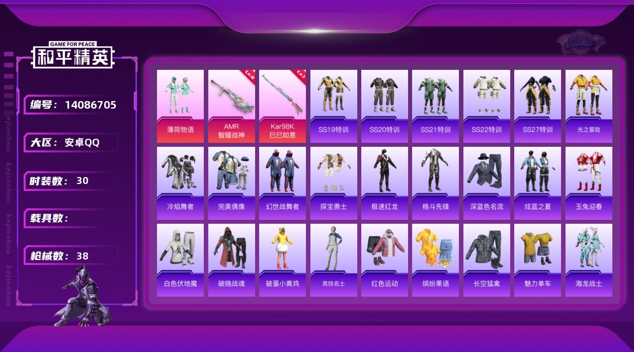 [14086705]【特价急出/详情看图】:安卓 手Q-1粉装-2特效枪-1粉色飞行器-1w热力值-1王牌印记-30套装-38枪皮【粉色套装】:粉装-薄荷物语【粉色枪皮等级】:Kar98K-巳巳如意(一级),AMR-智耀战神(四级)【粉色飞行器】:闪光银龙飞行器
