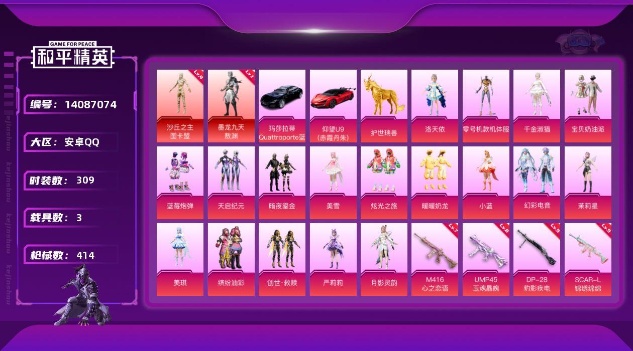 - [15147871]素材身法号/沙丘之主-图卡盟(六级)/绝世印记13/无敌战神框2 苹果 微信-无敌战神框-3神装-19粉装-22特效枪-10载具-14粉色飞行器-14.1w热力值-24王牌印记-218套装-318枪皮【红色神装等级】:魔童闹海-哪吒(一级),墨龙九天-敖渊(一级),沙丘之主-图卡盟(六级)【热门品类】:粉装-梦幻火箭,套装-暗夜行者,套装-SS1特训,套装-龟仙人,套装-粉红小猪,角色-8号机,角色-Mark.06,熔岩游骑兵连帽夹克【粉色套装】:粉装-宝贝奶油派,粉装-天使彩虹糖,粉装-水曜玄武,粉装-梦幻火箭,粉装-金属狂野,粉装-彗云及圣,粉装-星之彼岸,粉装-烈焰拳霸,粉装-蜜桃特工,角色-洛天依,角色-初号机款机体服,粉装-庄周梦蝶,粉装-千面幻镜,粉装-盖世英雄,角色-初号机 觉醒Ver.,角色-狂花道·不知火舞,粉装-幻彩电音,角色-狂魅哈莉,角色-冷漠罗丽【粉色枪皮等级】:AKM-魔法神域(三级),SCAR-L-天蓬元帅(七级),M416-五爪金龙(七级),M416-墨龙九天(三级),GROZA-玉面桃花(八级),AUG-星之彼岸(七级),AUG-星梦奇缘(三级),M762-青锋波束(五级),UMP45-恐龙拽拽(七级),Vector-最终圣卫者(三级),AKS-74U-信仰神谕(三级),AKS-74U-无垠阁(三级),P90-魔童闹海 敖丙(三级),Kar98K-巳巳如意(五级),M24-镜域双华(一级),Mk14-甜梦熊击(五级),AMR-智耀战神(一级),M200-梦海之灵(二级),DP-28-豹影疾电(五级),MG3-洛神天依(一级),MG-36-沧焰双生(五级),破片手榴弹-瓶中星球(七级)【粉色载具】:特斯拉Model X(珍珠白),兰博基尼Estoque(银翼灰),玛莎拉蒂Ghibli(金),宾利欧陆GT敞篷(火焰橘),迈凯伦570S(天际蓝),合金龙骨(蓝),僚机-萌兔起飞,星梦玉骢,晶梦灵驹,冰绡玉鳞【粉色飞行器】:梦幻火箭飞行器,绮梦青鸾飞行器,庄周梦蝶飞行器,千面幻镜飞行器,变形金刚飞行器,沙丘之主天马,镜域双华-灵镜之阶,龙翔九天飞行器,幻海精灵飞行器,深渊漩涡飞行器,灵猫魔法师飞行器,灵珠游龙飞行器