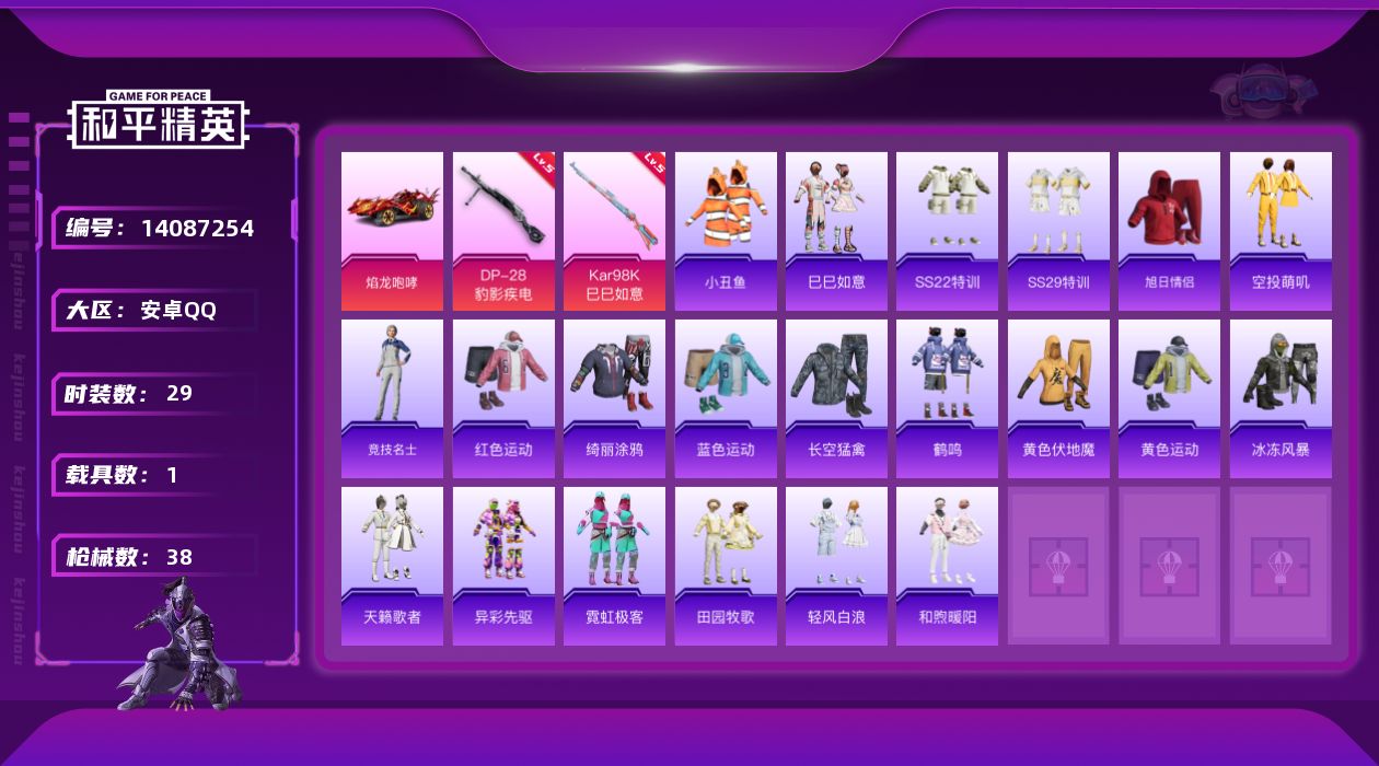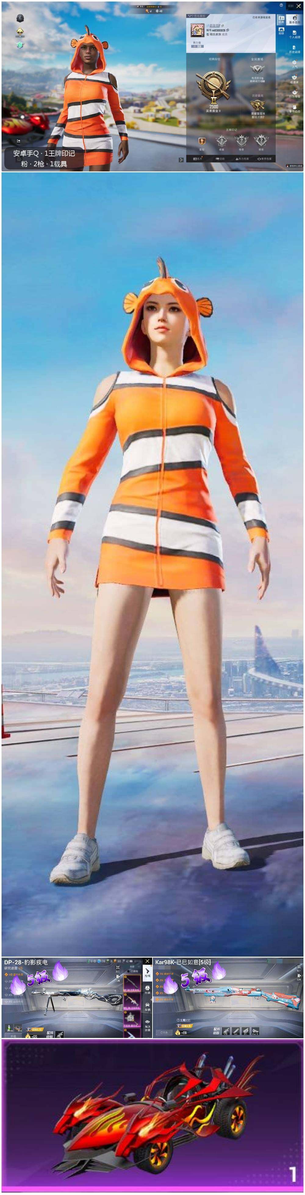 [14087254]可二次【店主推荐捡漏号!可直接换绑】 安卓 手Q-2特效枪-1载具-1.2w热力值-1王牌印记-29套装-38枪皮【热门品类】:套装-小丑鱼【粉色载具】:焰龙咆哮【粉色枪皮等级】:Kar98K-巳巳如意(五级),DP-28-豹影疾电(五级)