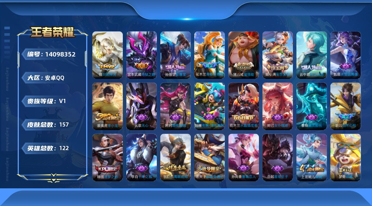 - PX_2089501-【白菜价怪盗基德号 逐花归海 时之恋人 孙行者】:安卓Q-V6-永恒钻石II段位-122英雄-155皮肤-0典藏-0珍品无双-0无双-1珍品传说-5传说-42史诗 【珍品传说】:马可波罗怪盗基德 【传说皮肤】:刘备时之恋人,孙悟空齐天大圣,澜逐花归海,桑启鸣野蒿,云缨幻光神枪 【限定皮肤】:蒙犽顽岩魄,姜子牙天穹之誓,李白谪仙醉月,狄仁杰阴阳师,赵云皇家上将,元歌无心,典韦岱