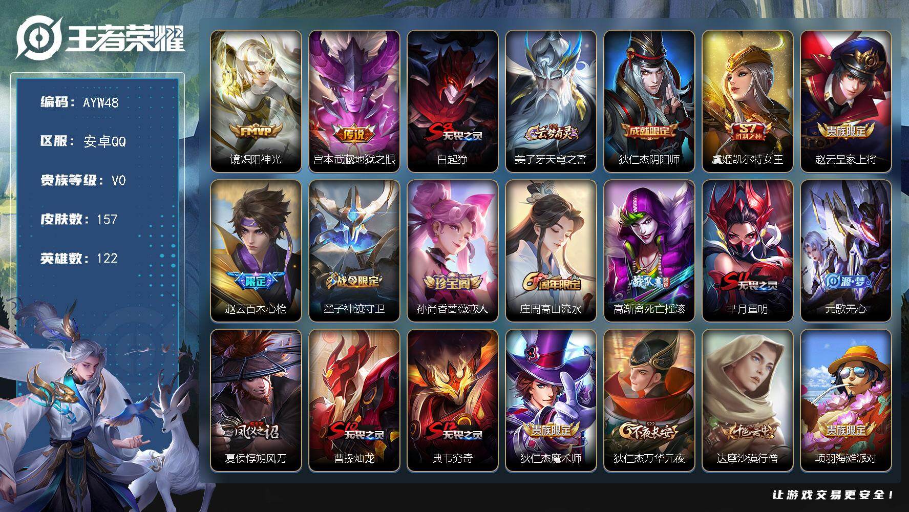 [14098352]可二次【店主推荐捡漏号!可直接换绑】安卓Q-V0-永恒钻石II段位-122英雄-157皮肤-2传说-41史诗 【传说皮肤】:镜炽阳神光,宫本武藏地狱之眼 【限定皮肤】:白起狰,姜子牙天穹之誓,狄仁杰阴阳师,虞姬凯尔特女王,赵云皇家上将,赵云百木心枪,墨子神迹守卫,孙尚香蔷薇恋人,庄周高山流水,高渐离死亡摇滚,芈月重明,元歌无心,夏侯惇朔风刀,曹操烛龙,典韦穷奇,狄仁杰魔术师,狄仁杰万华元夜,达摩沙漠行僧,项羽海滩派对,老夫子醍醐杖,老夫子航海奇遇记,程咬金演武夺筹,韩信逐梦之影,兰陵王金庭之子,花木兰青春决赛季,孙悟空至尊宝,牛魔御旌,后羿圣弓游侠,李元芳云中旅人,钟馗驱傩正仪,干将莫邪真爱魔法,雅典娜黎明之约,太乙真人饕餮,鬼谷子原初探秘者,苏烈千军破阵,百里玄策原初追逐者,弈星混沌棋,梦奇顽趣,沈梦溪大漠名商,明世隐疑决卦,裴擒虎李小龙,裴擒虎擒涛扼浪,狂铁御狮,米莱狄御霄,云中君时之祈愿,盾山御銮,猪八戒猪悟能,上官婉儿梁祝,鲁班大师探海日志,桑启海盐诗旅,张良古海寻踪,蒙恬荣光圣徽,鬼谷子天穹祈灯,姬小满妄想食味,刘邦剑破天穹 【赛季限定】:白起狰,芈月重明,夏侯惇朔风刀,曹操烛龙,典韦穷奇,狄仁杰万华元夜,达摩沙漠行僧,老夫子醍醐杖,程咬金演武夺筹,兰陵王金庭之子,张良古海寻踪,牛魔御旌,李元芳云中旅人,虞姬凯尔特女王,钟馗驱傩正仪,雅典娜黎明之约,太乙真人饕餮,鬼谷子原初探秘者,苏烈千军破阵,百里玄策原初追逐者,弈星混沌棋,梦奇顽趣,沈梦溪大漠名商,明世隐疑决卦,裴擒虎擒涛扼浪,狂铁御狮,米莱狄御霄,盾山御銮,鲁班大师探海日志,桑启海盐诗旅,鬼谷子天穹祈灯,蒙恬荣光圣徽,刘邦剑破天穹,姜子牙天穹之誓 【战令限定】:墨子神迹守卫,老夫子航海奇遇记,后羿圣弓游侠,干将莫邪真爱魔法 【史诗皮肤】:阿轲暗夜猫娘,赵云皇家上将,赵云未来纪元,甄姬冰雪圆舞曲,狄仁杰魔术师,宫本武藏鬼剑武藏,孙尚香蔷薇恋人,孙尚香水果甜心,妲己魅力维加斯,妲己女仆咖啡,墨子金属风暴,吕布圣诞狂欢,曹操幽灵船长,李白千年之狐,孙悟空至尊宝,花木兰水晶猎龙者,刘邦德古拉伯爵,韩信逐梦之影,兰陵王暗隐猎兽者,花木兰青春决赛季,刘禅天才门将,李元芳逐浪之夏,程咬金功夫厨神,白起星夜王子,狄仁杰鹰眼统帅,上官婉儿梁祝,百里玄策原初追逐者,裴擒虎李小龙,老夫子航海奇遇记,干将莫邪真爱魔法,猪八