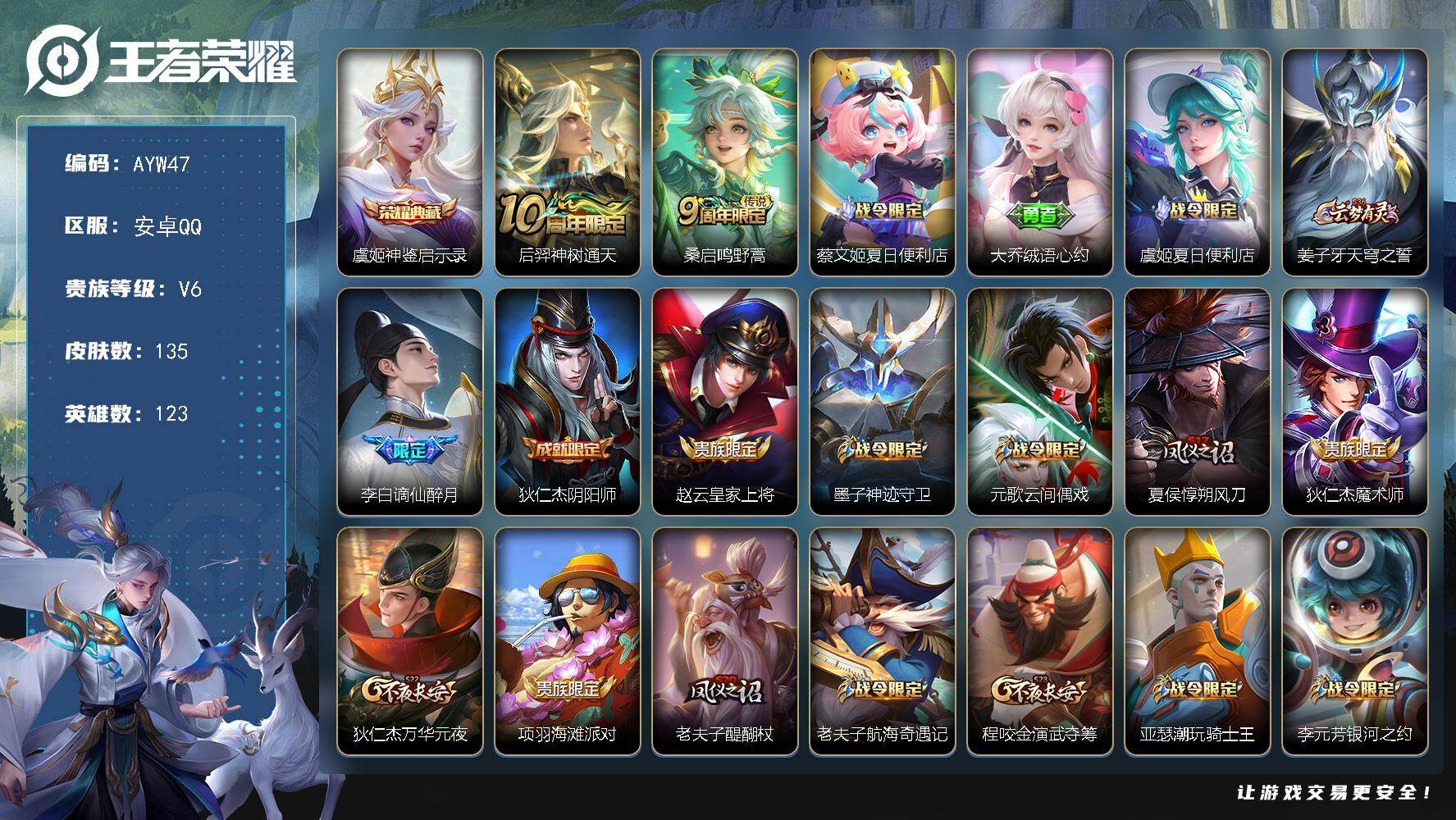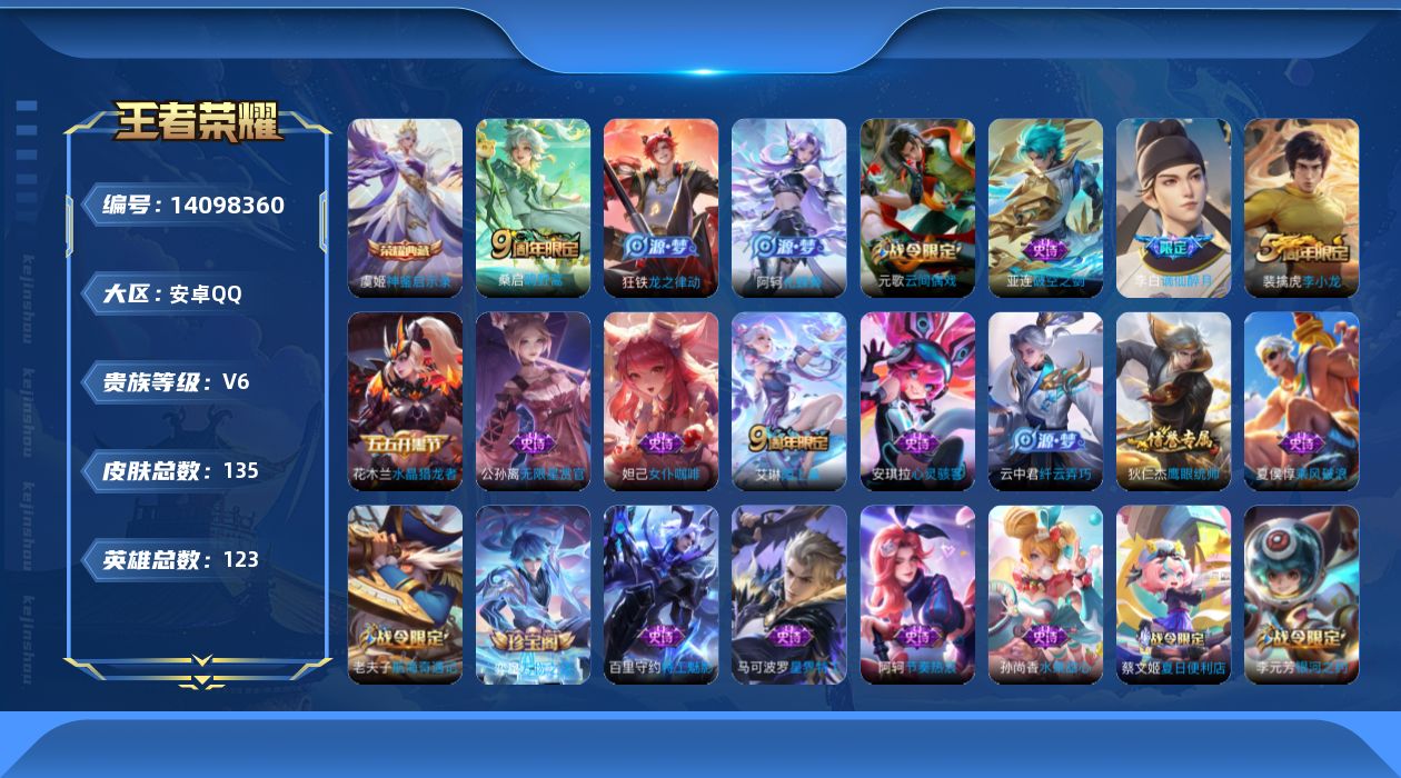 [14098360]可二次【店主推荐捡漏号!可直接换绑】安卓Q-V6-尊贵铂金III段位-123英雄-135皮肤-1典藏-2传说-39史诗 【荣耀典藏】:虞姬神鉴启示录 【传说皮肤】:后羿神树通天,桑启鸣野蒿 【限定皮肤】:蔡文姬夏日便利店,大乔绒语心约,虞姬夏日便利店,姜子牙天穹之誓,李白谪仙醉月,狄仁杰阴阳师,赵云皇家上将,墨子神迹守卫,元歌云间偶戏,夏侯惇朔风刀,狄仁杰魔术师,狄仁杰万华元夜,项羽海滩派对,老夫子醍醐杖,老夫子航海奇遇记,程咬金演武夺筹,亚瑟潮玩骑士王,李元芳银河之约,钟馗驱傩正仪,雅典娜单词大作战,鬼谷子原初探秘者,弈星混沌棋,明世隐疑决卦,裴擒虎李小龙,云中君纤云弄巧,盾山御銮,猪八戒西部大镖客,蒙犽狂想玩偶喵,沈梦溪龙舞盛年,刘邦剑破天穹,周瑜熔金海岸 【赛季限定】:夏侯惇朔风刀,狄仁杰万华元夜,老夫子醍醐杖,程咬金演武夺筹,钟馗驱傩正仪,鬼谷子原初探秘者,弈星混沌棋,明世隐疑决卦,盾山御銮,刘邦剑破天穹,姜子牙天穹之誓 【战令限定】:墨子神迹守卫,蔡文姬夏日便利店,虞姬夏日便利店,元歌云间偶戏,老夫子航海奇遇记,亚瑟潮玩骑士王,李元芳银河之约,雅典娜单词大作战,猪八戒西部大镖客,蒙犽狂想玩偶喵 【史诗皮肤】:赵云皇家上将,貂蝉圣诞恋歌,王昭君偶像歌手,狄仁杰魔术师,宫本武藏鬼剑武藏,孙尚香水果甜心,嬴政摇滚巨星,妲己女仆咖啡,刘禅绅士熊喵,花木兰水晶猎龙者,刘邦德古拉伯爵,夏侯惇乘风破浪,小乔缤纷独角兽,雅典娜冰冠公主,安琪拉心灵骇客,百里守约特工魅影,蔡文姬舞动绿茵,李元芳逐浪之夏,程咬金功夫厨神,阿轲节奏热浪,狄仁杰鹰眼统帅,公孙离无限星赏官,李元芳银河之约,蒙犽狂想玩偶喵,裴擒虎李小龙,云中君纤云弄巧,元歌云间偶戏,老夫子航海奇遇记,阿古朵顽趣,蔡文姬夏日便利店,姬小满战舞者,亚连破空之剑,马可波罗星界特工,李白谪仙醉月,艾琳陌上桑,弈星万物之道,阿轲化蝶舞,狂铁龙之律动,少司缘巫礼祀神 【其他皮肤】:项羽海滩派对,韩信教廷特使,韩信街头霸王,露娜哥特玫瑰,达摩大发明家,赵云忍炎影,白起白色死神,牛魔西部大镖客,扁鹊化身博士,宫本武藏未来纪元,妲己少女阿狸,典韦黄金武士,亚瑟死亡骑士,花木兰兔女郎,张飞五福同心,甄姬花好人间,刘备万事如意,狄仁杰阴阳师,李元芳黑猫爱糖果,钟无艳海滩丽影,王昭君幻想奇妙夜,项羽科学大爆炸,庄周奇妙博物学,小乔丁香结,