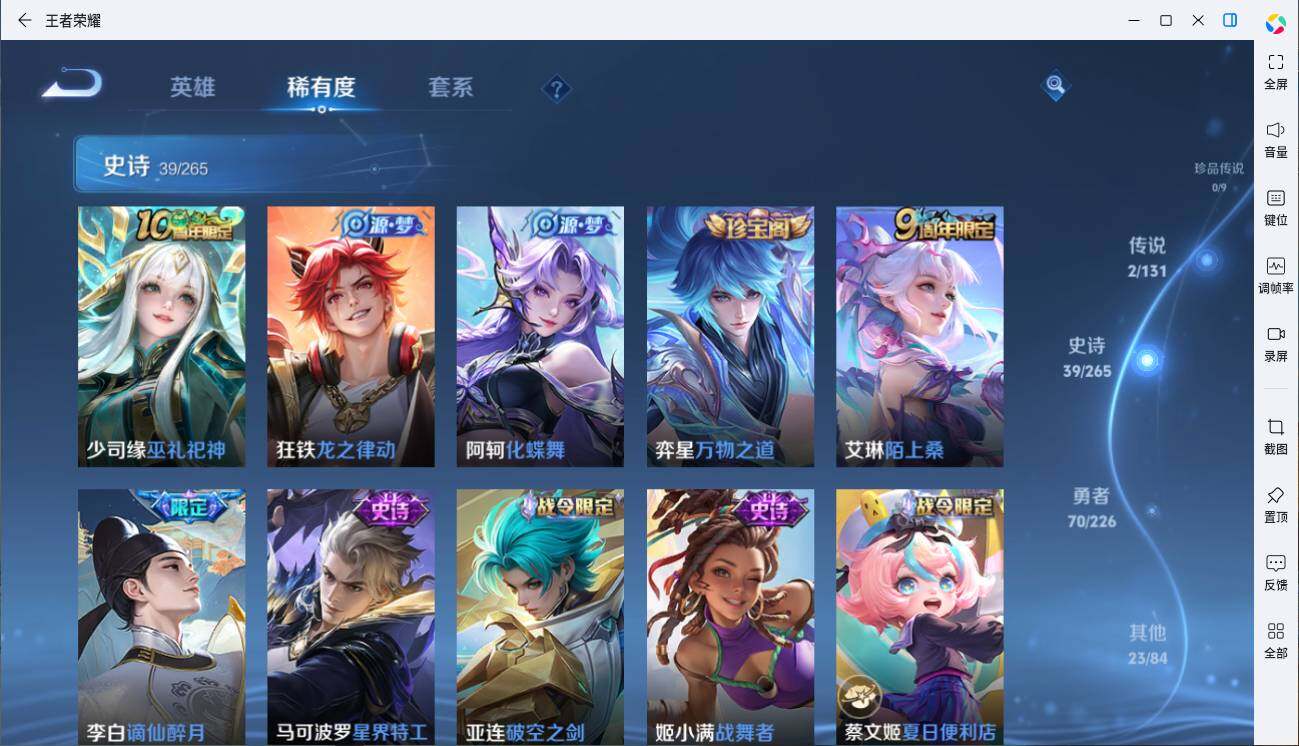 - PX_2094665-62 安卓QQ/至尊星耀/92皮肤/120英雄/0典藏/0珍品无双/0无双/0珍品传说/2传说/20史诗/6稀有英雄 【2 传说皮肤】无限倾心 项羽,至美·化雀舞 甄姬, 【20 史诗皮肤】百解令 蒙犽,雪夜绮愿 周瑜,鬼剑武藏 宫本武藏,地狱燃心 司空震,拒霜思 嫦娥,魅力维加斯 妲己,完美假期 米莱狄,舞动绿茵 蔡文姬,鹰眼统帅 狄仁杰,金属风暴 墨子,匿光侦查者 李元芳