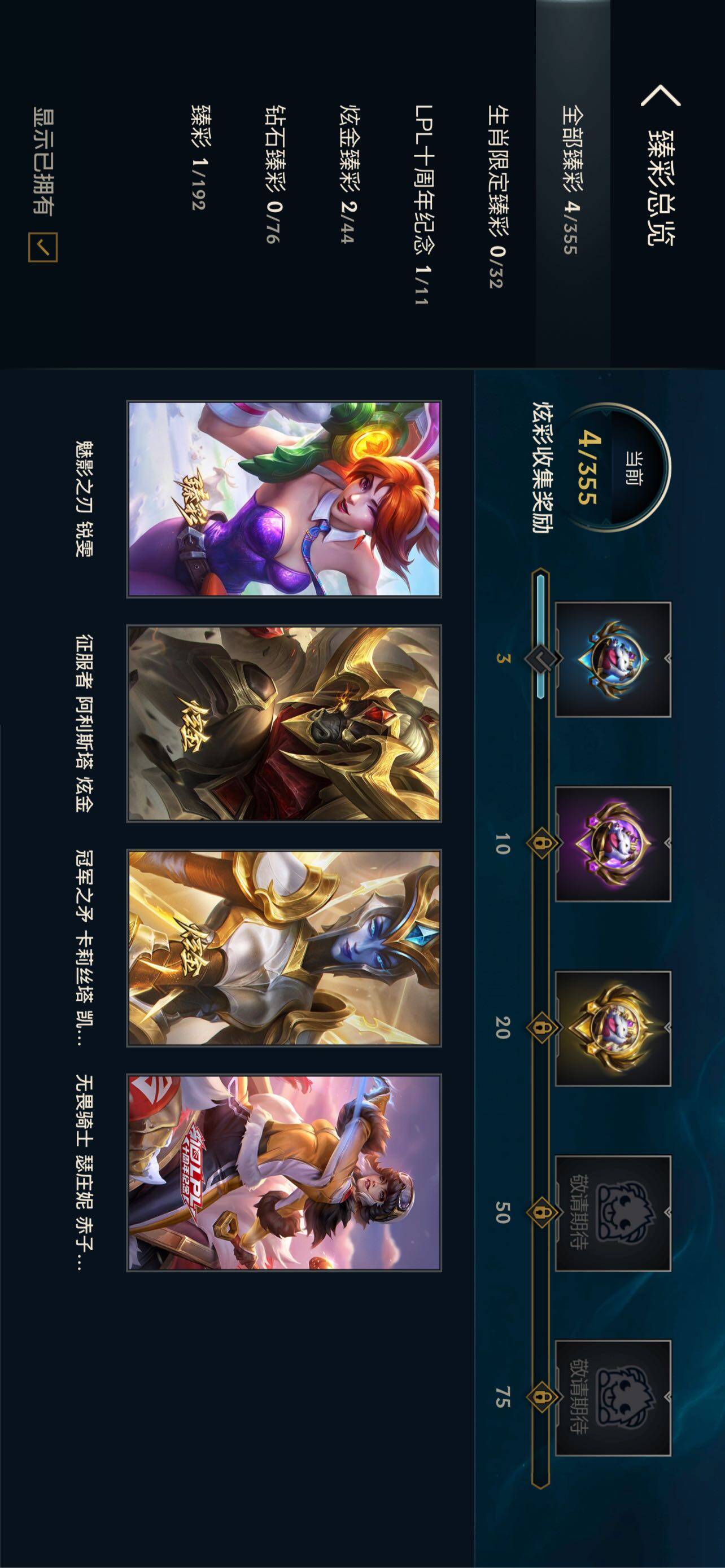【臻彩皮肤】:无畏骑士瑟庄妮赤子初心,征服者阿利斯塔炫金,冠军之矛卡莉丝塔凯旋圣装