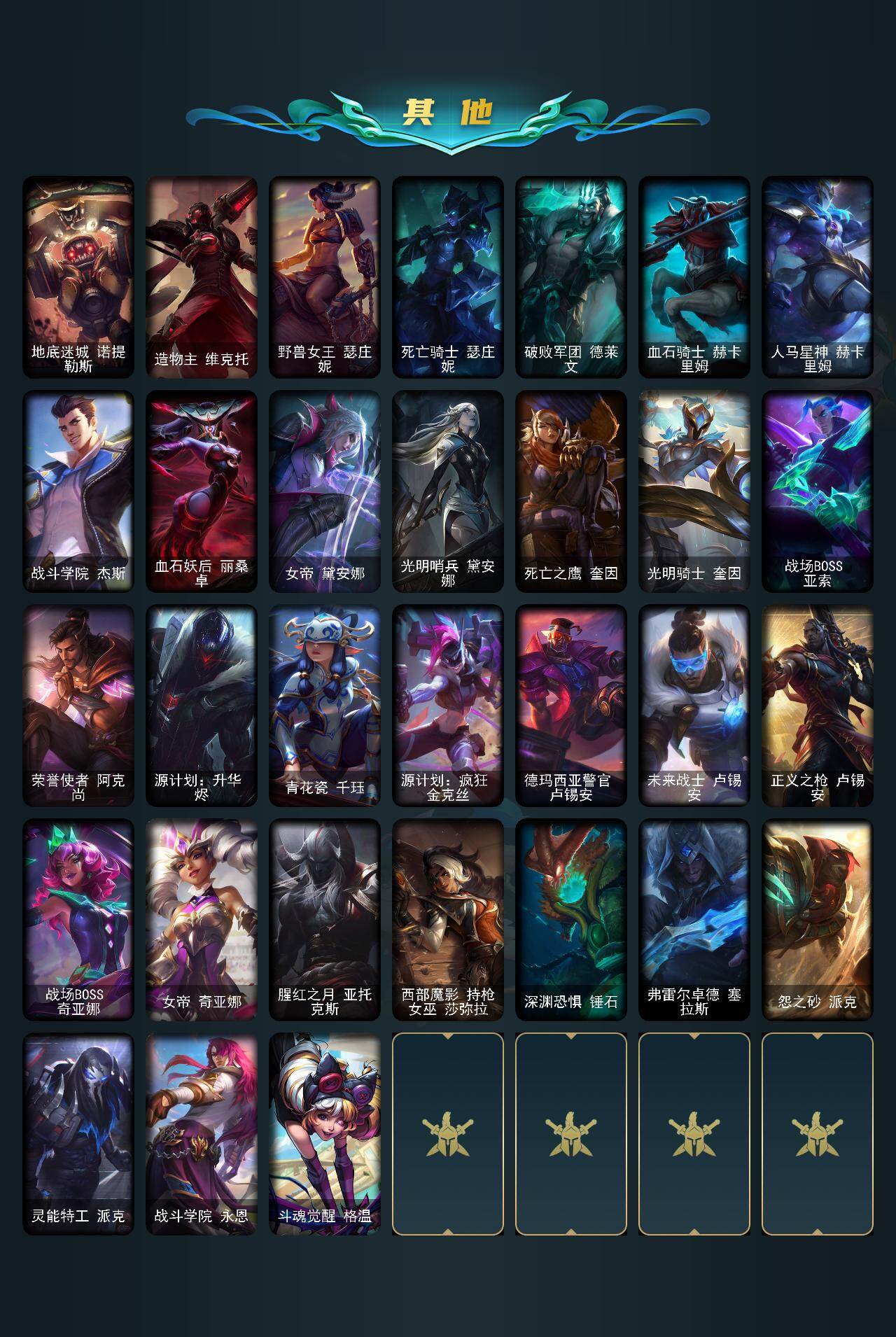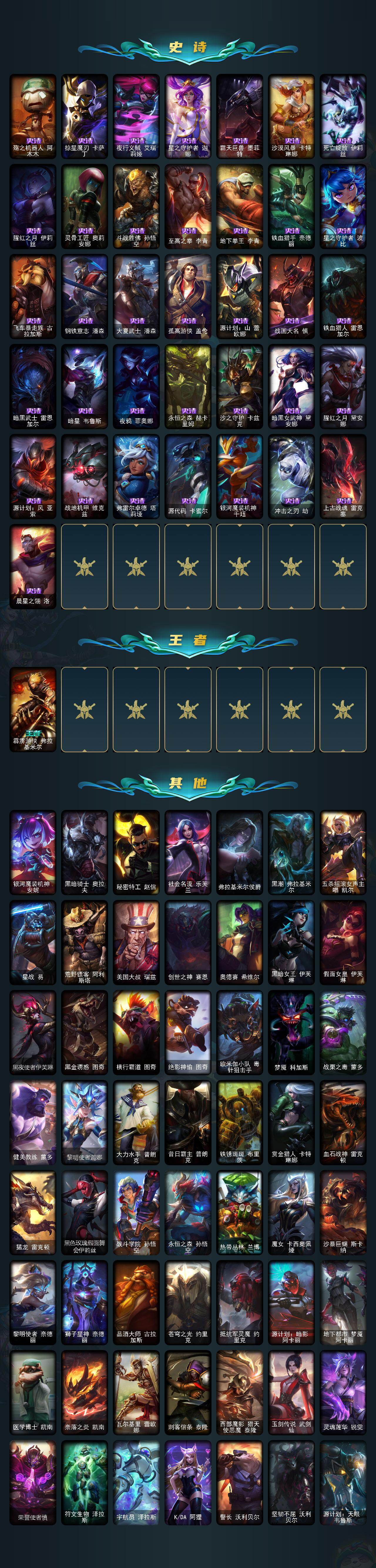 【史诗皮肤】:皇家火枪手崔斯特,重生之沙费德提克,圣光审判凯尔,源代码索拉卡,国王泰达米尔,炼金狂士辛吉德,死神卡尔萨斯,殇之机器人阿木木,掠星魔刃卡萨丁,夜行义贼艾瑞莉娅,星之守护者迦娜,霸天巨兽墨菲特,沙漠风暴卡特琳娜,死亡绽放伊莉丝,腥红之月伊莉丝,灵骨工匠奥莉安娜,斗战胜佛孙悟空,至高之拳李青,地下拳王李青,铁血猎手奈德丽,星之守护者波比,飞车暴走族古拉加斯,钢铁意志潘森,大夏武士潘森,孤高游侠盖伦,源计划山蕾欧娜,战国大名慎,铁血猎人雷恩加尔,暗黑武士雷恩加尔,暗星韦鲁斯,夜鸦菲奥娜,永恒之森赫卡里姆,沙之守护卡兹克,暗黑女武神黛安娜,腥红之月黛安娜,源计划风亚索,战地机甲维克兹,弗雷尔卓德塔莉垭