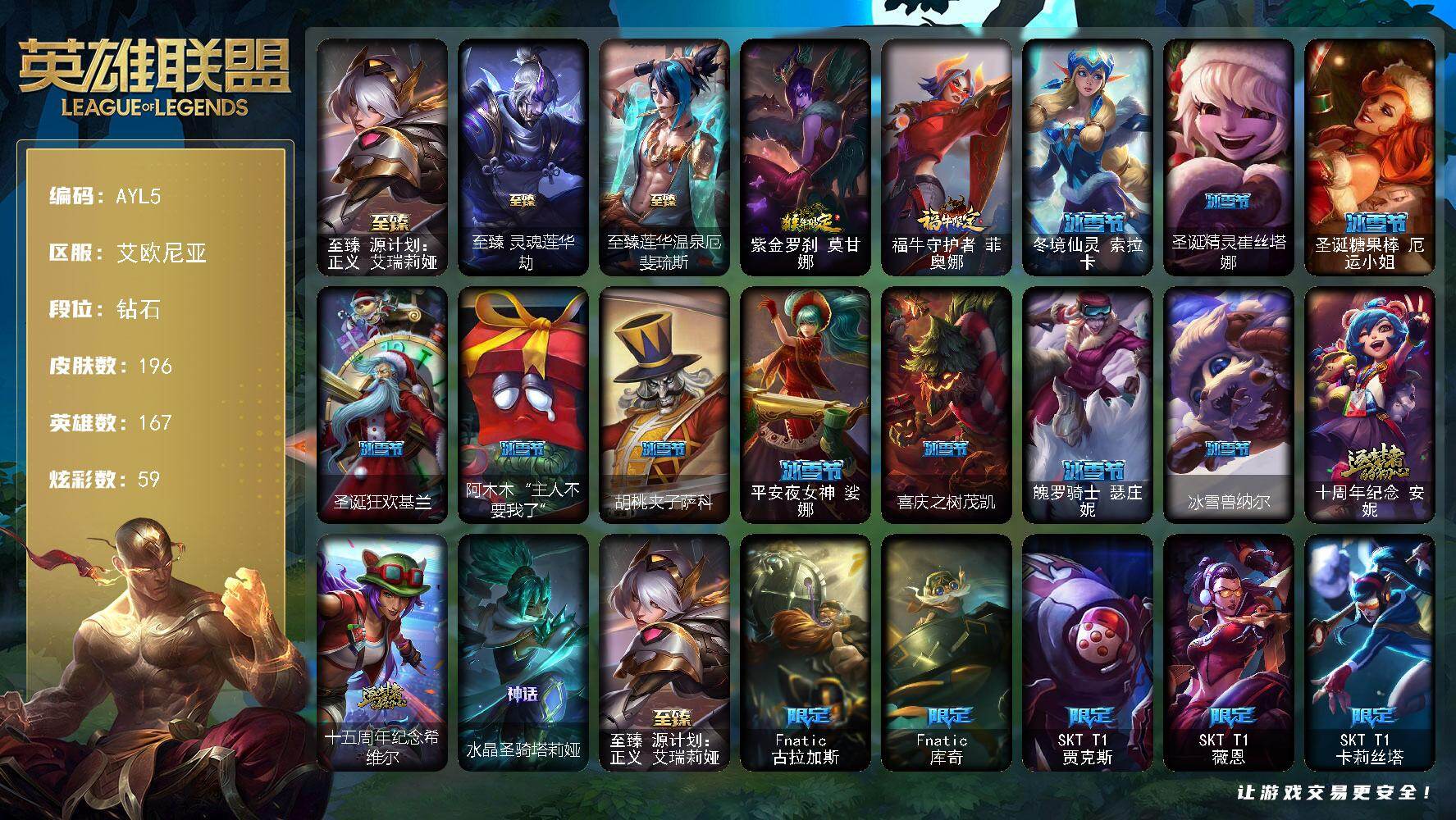 [14098475]可二次【店主推荐捡漏号!可直接换绑】钻石段位-167英雄-196皮肤-59炫-6神话-36限定-23传说-43史诗 【至臻皮肤】:至臻源计划正义艾瑞莉娅,至臻灵魂莲华劫,至臻莲华温泉厄斐琉斯 【臻彩皮肤】:无畏骑士瑟庄妮赤子初心,征服者阿利斯塔炫金,冠军之矛卡莉丝塔凯旋圣装 【年限皮肤】:紫金罗刹莫甘娜,福牛守护者菲奥娜 【冰雪限定】:冬境仙灵索拉卡,圣诞精灵崔丝塔娜,圣诞糖果棒厄运小姐,圣诞狂欢基兰,阿木木“主人不要我了”,胡桃夹子萨科,平安夜女神娑娜,喜庆之树茂凯,魄罗骑士瑟庄妮,冰雪兽纳尔 【神话皮肤】:十周年纪念安妮,十五周年纪念希维尔,水晶圣骑塔莉娅,至臻源计划正义艾瑞莉娅 【限定皮肤】:Fnatic古拉加斯,Fnatic库奇,SKTT1贾克斯,SKTT1薇恩,SKTT1卡莉丝塔,SKTT1雷克顿,玉剑传说无影,星之守护者佐伊,玉剑传说神机花火,暗裔英雄盖伦,胜利枪神卢锡安,胜利机器人布里茨,胜利凤凰艾尼维亚,胜利之王泰达米尔,胜利巨口克格莫,胜利女神娑娜,胜利剑圣易,胜利之运崔斯特,鬼影森森茂凯,野兽猎人瑟庄妮,野兽猎人泰达米尔,波比的巧克力工坊,都铎王朝图奇,防暴天使凯尔 【传说皮肤】:战场女武神凯尔,霸天零式赛恩,提莫约德尔人的一大步,合金巨兽努努和威朗普,电玩女神娑娜,地狱行者孙悟空,神拳李青,神龙尊者圣龙李青,炼狱魔犬内瑟斯,腥红之月鬼武姬阿卡丽,钢铁军团盖伦,星之守护者拉克丝,枯萎之壤泽拉斯,冰霜亚龙希瓦娜,光明哨兵格雷福斯,符文战熊沃利贝尔,宇航员诺提勒斯,泳池派对吉格斯,金牌主播德莱文,奥德赛凯隐,黑夜使者亚索,真实伤害艾克,暗星锤石 【史诗皮肤】:皇家火枪手崔斯特,重生之沙费德提克,圣光审判凯尔,源代码索拉卡,国王泰达米尔,炼金狂士辛吉德,死神卡尔萨斯,殇之机器人阿木木,掠星魔刃卡萨丁,夜行义贼艾瑞莉娅,星之守护者迦娜,霸天巨兽墨菲特,沙漠风暴卡特琳娜,死亡绽放伊莉丝,腥红之月伊莉丝,灵骨工匠奥莉安娜,斗战胜佛孙悟空,至高之拳李青,地下拳王李青,铁血猎手奈德丽,星之守护者波比,飞车暴走族古拉加斯,钢铁意志潘森,大夏武士潘森,孤高游侠盖伦,源计划山蕾欧娜,战国大名慎,铁血猎人雷恩加尔,暗黑武士雷恩加尔,暗星韦鲁斯,夜鸦菲奥娜,永恒之森赫卡里姆,沙之守护卡兹克,暗黑女武神黛安娜,腥红之月黛安娜,源计划风亚索,战地机甲维克兹,弗雷尔卓德塔莉垭