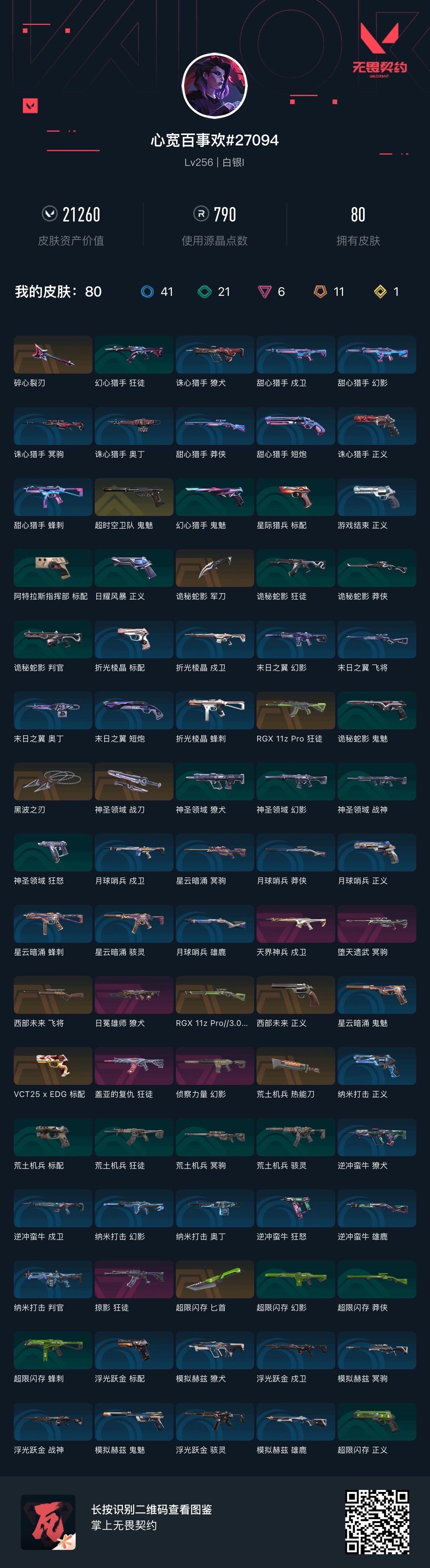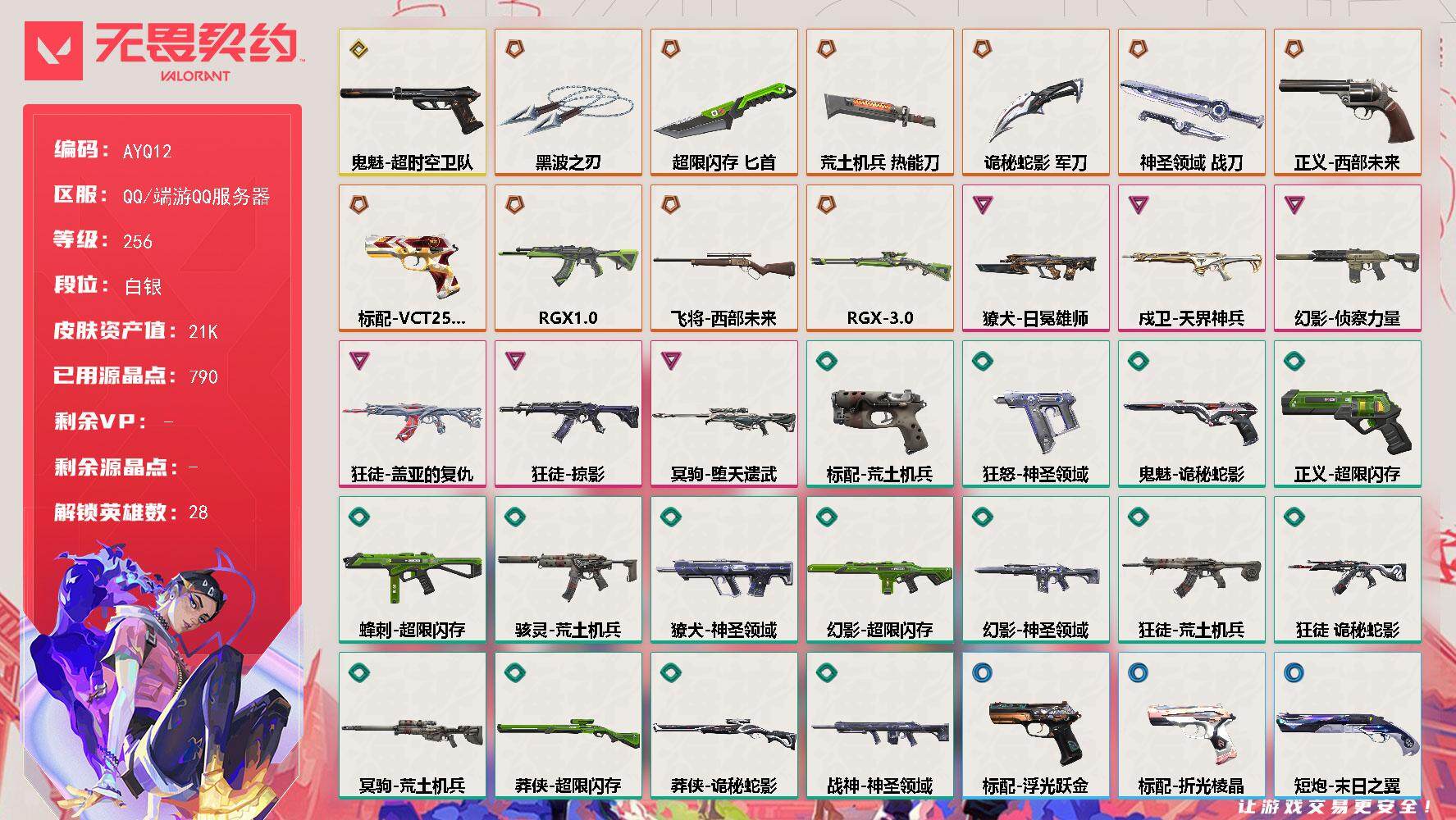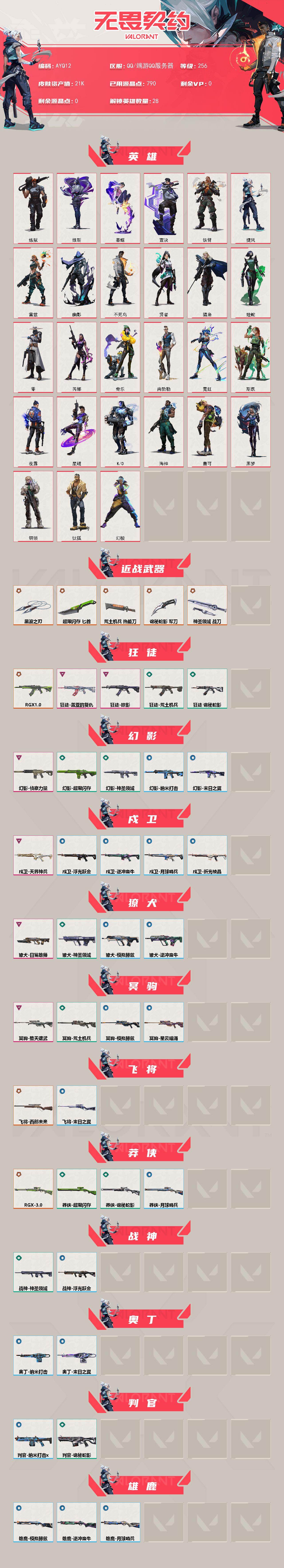 [14098630]【店主推荐捡漏号!可直接换绑】【英雄】:幻棱,炼狱,维斯,暮蝶,钛狐,壹决,铁臂,捷风,雷兹,幽影,不死鸟,贤者,猎枭,蝰蛇,零,芮娜,奇乐,尚勃勒,霓虹,斯凯,夜露,星礈,K/O,海神,盖可,黑梦,钢锁 【近战 武器】:近战武器-黑波之刃,近战武器-超限闪存 匕首,近战武器-荒土机兵 热能刀,近战武器-诡秘蛇影 军刀,近战武器-神圣领域 战刀 【狂徒】:狂徒-RGX 11z Pro,狂徒-掠影,狂徒-盖亚的复仇,狂徒-荒土机兵,狂徒-诡秘蛇影 【幻影】:幻影-侦察力量,幻影-超限闪存,幻影-神圣领域,幻影-纳米打击,幻影-末日之翼 【戍卫】:戍卫-天界神兵,戍卫-浮光跃金,戍卫-逆冲蛮牛,戍卫-月球哨兵,戍卫-折光棱晶 【獠犬】:獠犬-日冕雄师,獠犬-神圣领域,獠犬-模拟赫兹,獠犬-逆冲蛮牛 【冥驹】:冥驹-堕天遗武,冥驹-荒土机兵,冥驹-模拟赫兹,冥驹-星云暗涌 【飞将】:飞将-西部未来,飞将-末日之翼 【莽侠】:莽侠-RGX 11z Pro//3.0,莽侠-超限闪存,莽侠-诡秘蛇影,莽侠-月球哨兵 【战神】:战神-神圣领域,战神-浮光跃金 【奥丁】:奥丁-纳米打击,奥丁-末日之翼 【判官】:判官-诡秘蛇影,判官-纳米打击x 【雄鹿】:雄鹿-模拟赫兹,雄鹿-逆冲蛮牛,雄鹿-月球哨兵 【骇灵】:骇灵-荒土机兵,骇灵-浮光跃金,骇灵-星云暗涌 【蜂刺】:蜂刺-超限闪存,蜂刺-星云暗涌,蜂刺-折光棱晶 【标配】:标配-荒土机兵,标配-浮光跃金,标配-折光棱晶 【VCT手枪】:标配-VCT25 x EDG 【正义】:正义-西部未来,正义-超限闪存,正义-纳米打击,正义-游戏结束,正义-月球哨兵 【鬼魅】:鬼魅-超时空卫队,鬼魅-诡秘蛇影,鬼魅-模拟赫兹,鬼魅-星云暗涌 【狂怒】:狂怒-神圣领域,狂怒-逆冲蛮牛 【短炮】:短炮-末日之翼 【卡面】:终章:激斗汉堡 卡面,进入射程 卡面,分崩离析 卡面,纳米打击 卡面,抑制技术 卡面,激斗汉堡 卡面,瓦娃脸雪糕 P2 卡面,从黄昏到黎明 卡面,荒土机兵 卡面,银弹猎手 卡面,逆冲蛮牛 卡面,《双城之战》拥抱 卡面,精灵大战 卡面,欢迎来到底城 卡面,南瓜盛典 卡面,唱片的故事 卡面,钢弓与箭弦 卡面,无畏契约:暮蝶 卡面,排除故障 卡面,战术桌游 卡面,悠享食光 卡面,修车达人 卡面,模拟赫兹 卡面,浮光跃金 卡面,超限闪