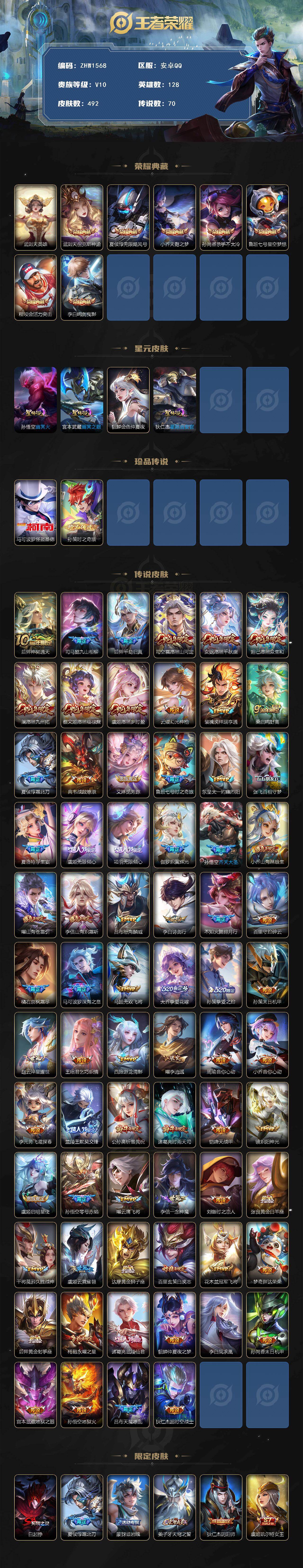 [14098843]可二次,【店主推荐捡漏号!可直接换绑】,安卓Q-V10-尊贵铂金III段位-128英雄-492皮肤-7典藏-2珍品传说-70传说-153史诗 【英雄全皮】:刘禅全皮,阿轲全皮,达摩全皮,司马懿全皮,刘邦全皮,橘右京全皮,钟馗全皮,鬼谷子全皮,苏烈全皮,狂铁全皮,李信全皮,猪八戒全皮,蒙犽全皮,夏洛特全皮,空空儿全皮,影全皮 【荣耀典藏】:武则天英雄,武则天倪克斯神谕,夏侯惇无限飓风号,小乔天鹅之梦,孙尚香杀手不太冷,鲁班七号星空梦想,程咬金活力突击,李白鸣剑曳影 【珍品传说】:马可波罗怪盗基德,孙策时之奇旅 【传说皮肤】:后羿神树通天,司马懿九山相柳,后羿千劫归真,司空震愿照山河定,女娲愿照千秋盛,妲己愿照众生和,澜愿照九州拓,蔡文姬愿照福禄聚,虞姬愿照岁时盈,云缨幻光神枪,裴擒虎祥瑞亨通,桑启鸣野蒿,夏侯惇霜北刀,典韦战鼓燎原,艾琳觅芳踪,鲁班七号时之奇旅,东皇太一灼幽烈阳,张飞百相守梦,夏洛特浮生妄,虞姬无限倾心,项羽无限倾心,伽罗炽翼辉光,孙悟空齐天大圣,小乔山海琳琅生,曜山海苍雷引,李信山海炽霜斩,吕布怒海麟威,李白诗剑行,不知火舞绯月行,百里守约碎云,橘右京枫霜尽,马可波罗深海之息,马超无双飞将,大乔挚爱花嫁,孙策挚爱之约,孙策末日机甲,赵云淬星耀世,王昭君乞巧织情,西施游龙清影,曜李逍遥 ,周瑜音你心动,小乔音你心动,李元芳飞鸢探春,兰陵王默契交锋,公孙离祈雪灵祝,诸葛亮时雨天司,铠绛天战甲,镜炽阳神光,虞姬启明星使,孙悟空零号赤焰,曜云鹰飞将,李信一念神魔,刘备时之恋人,张良黄金白羊座,干将莫邪久胜战神,虞姬云霓雀翎,达摩黄金狮子座,百里玄策白虎志,花木兰冠军飞将,梦奇胖达荣荣,后羿黄金射手座,杨戬永曜之星,诸葛亮武陵仙君,貂蝉仲夏夜之梦,李白凤求凰,孙尚香末日机甲,宫本武藏地狱之眼,孙悟空地狱火,吕布天魔缭乱,狄仁杰超时空战士 【限定皮肤】:白起狰,夏侯惇霜北刀,蒙犽顽岩魄,姜子牙天穹之誓,狄仁杰阴阳师,虞姬凯尔特女王,小乔山海琳琅生,赵云皇家上将,墨子神迹守卫,嬴政白昼王子,孙尚香蔷薇恋人,鲁班七号狮舞东方,鲁班七号乒乒小将,鲁班七号时之奇旅,庄周云端筑梦师,庄周高山流水,高渐离死亡摇滚,高渐离玩趣恶龙,阿轲迷踪丽影,钟无艳超时空战士,孙膑妖精王,扁鹊炼金王,扁鹊奇幻香踪,白起夜都怪侠,芈月重明,芈月白晶晶,芈月幻夜卜梦,吕布天魔缭乱,吕布猎兽之
