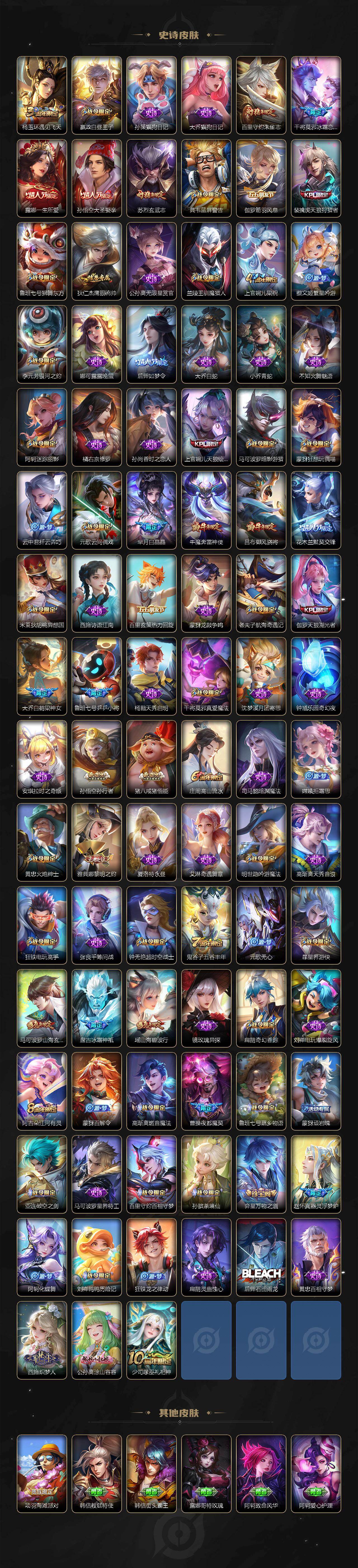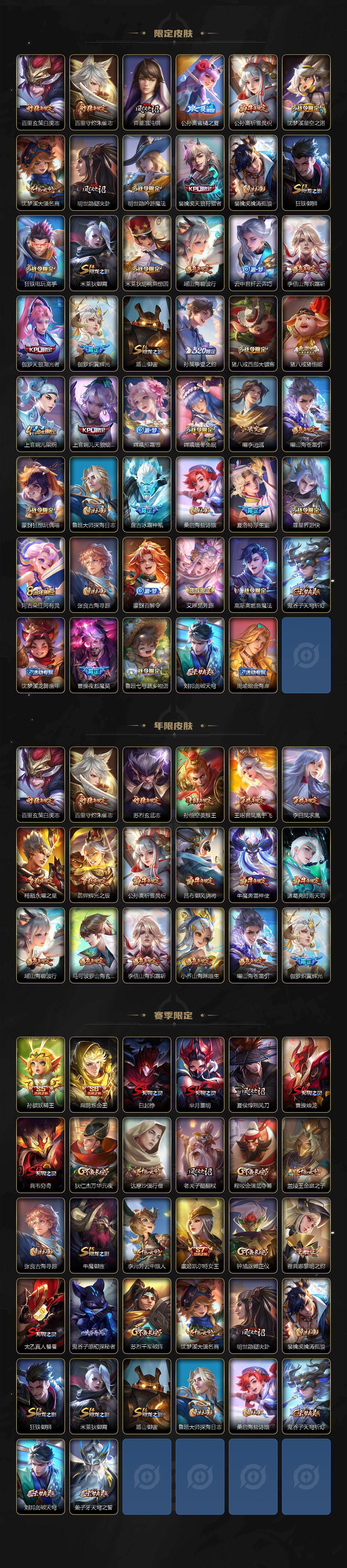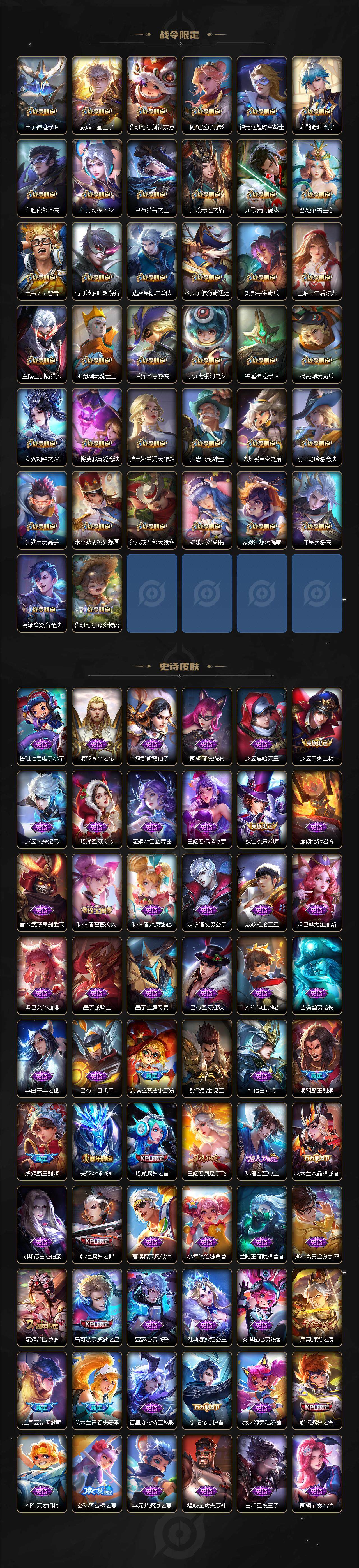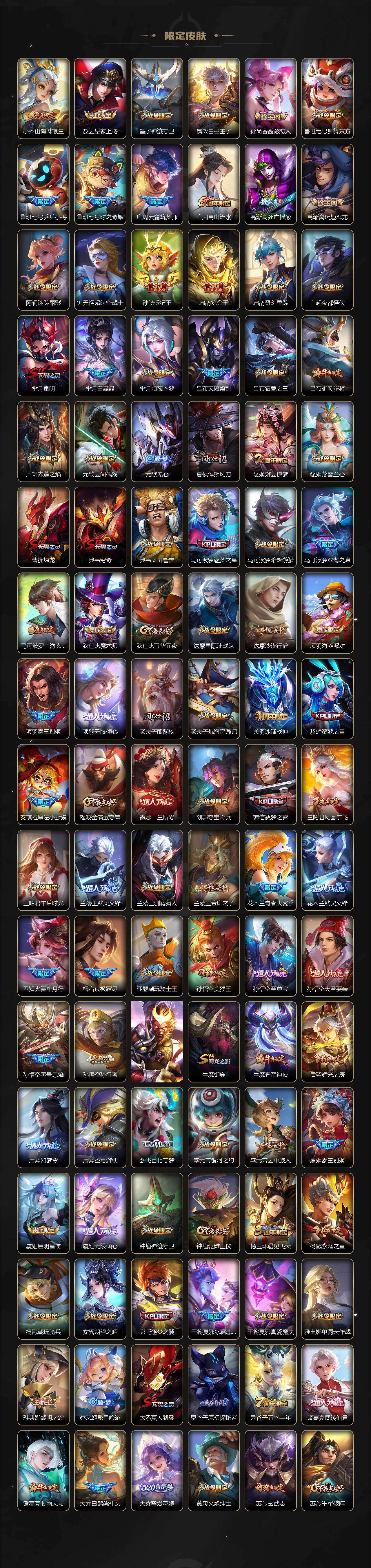 【限定皮肤】:白起狰,夏侯惇霜北刀,蒙犽顽岩魄,姜子牙天穹之誓,狄仁杰阴阳师,虞姬凯尔特女王,小乔山海琳琅生,赵云皇家上将,墨子神迹守卫,嬴政白昼王子,孙尚香蔷薇恋人,鲁班七号狮舞东方,鲁班七号乒乒小将,鲁班七号时之奇旅,庄周云端筑梦师,庄周高山流水,高渐离死亡摇滚,高渐离玩趣恶龙,阿轲迷踪丽影,钟无艳超时空战士,孙膑妖精王,扁鹊炼金王,扁鹊奇幻香踪,白起夜都怪侠,芈月重明,芈月白晶晶,芈月幻夜卜梦,吕布天魔缭乱,吕布猎兽之