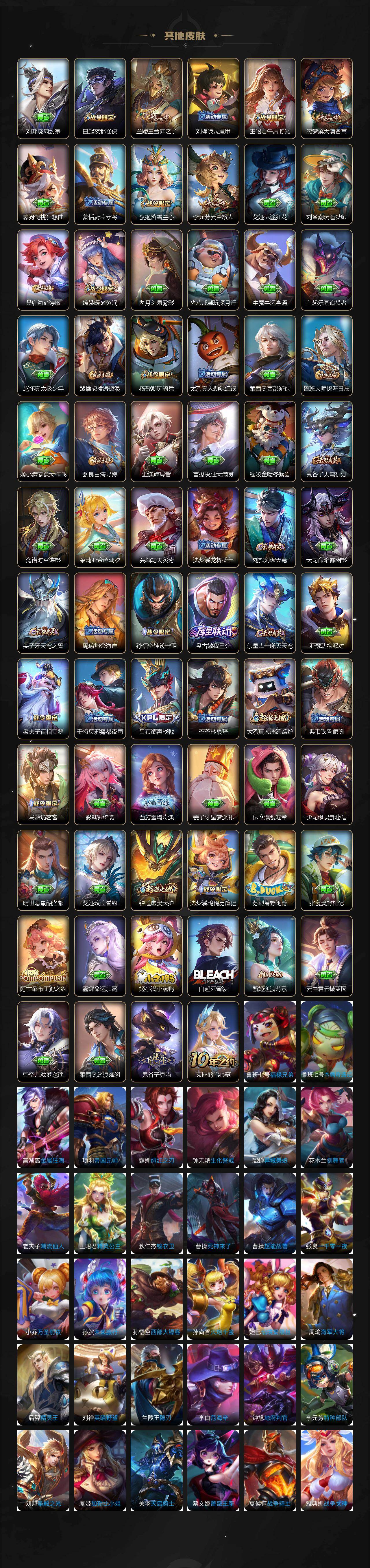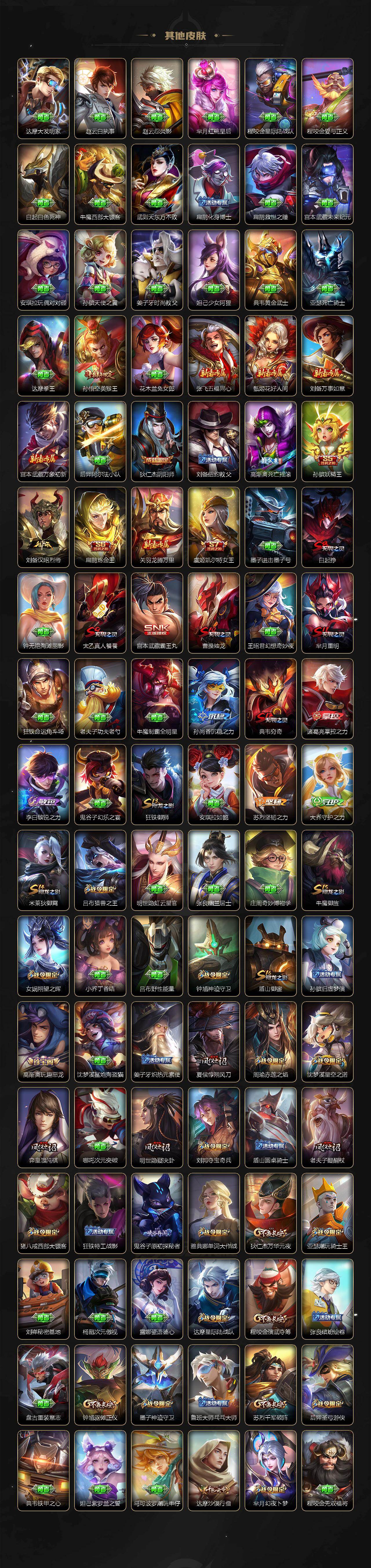 孙膑妖精王,扁鹊炼金王,虞姬凯尔特女王,白起狰,太乙真人饕餮,曹操烛龙,芈月重明,典韦穷奇,狂铁御狮,米莱狄御霄,牛魔御旌,盾山御銮,夏侯惇朔风刀,明世隐疑决卦,老夫子醍醐杖,鬼谷子原初探秘者,狄仁杰万华元夜,程咬金演武夺筹,钟馗驱傩正仪,苏烈千军破阵,吕布猎兽之王,嬴政白昼王子,女娲朔望之晖,典韦蓝屏警告,钟馗神迹守卫,鲁班七号狮舞东方,沈梦溪星空之诺,李元芳银河之约,刘邦夺宝奇兵,马可波罗暗影游猎,蒙犽狂想玩偶喵,元歌云间偶戏,弈星混沌棋,达摩沙漠行僧,兰陵王金庭之子,沈梦溪大漠名商,李元芳云中旅人,桑启海盐诗旅,裴擒虎擒涛扼浪,鲁班大师探海日志,张良古海寻踪