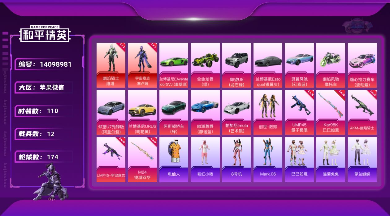 [14098981]载具多!苹果 微信-2神装-1粉装-5特效枪-12载具-6粉色飞行器-69650热力值-7王牌印记-110套装-174枪皮