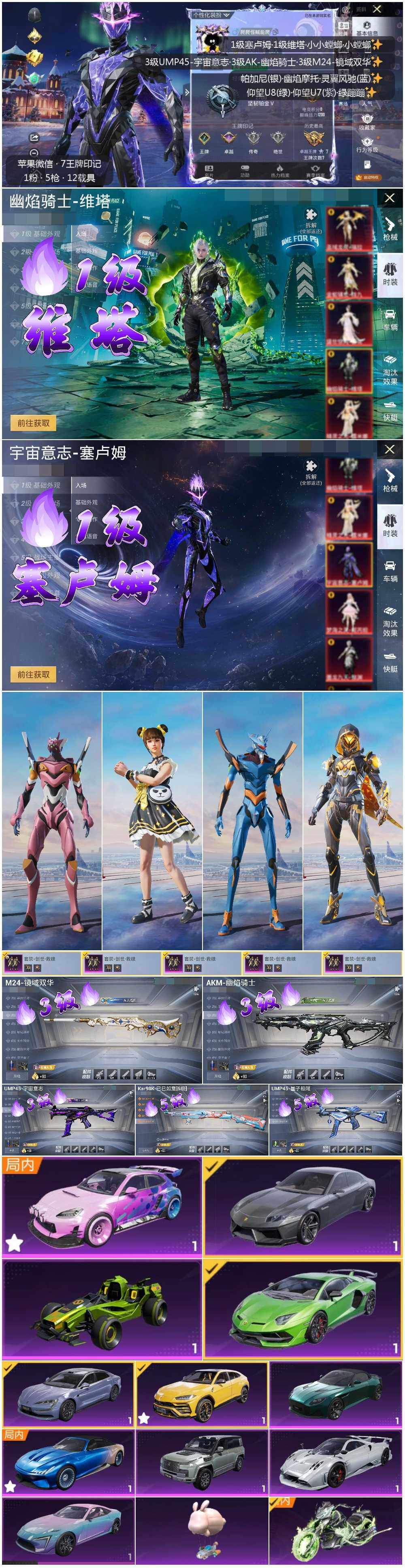 [14098981]载具多!苹果 微信-2神装-1粉装-5特效枪-12载具-6粉色飞行器-69650热力值-7王牌印记-110套装-174枪皮 【红色神装等级】:幽焰骑士-维塔(一级),宇宙意志-塞卢姆(一级) 【红色角色神装】:幽焰骑士-维塔,宇宙意志-塞卢姆 【热门品类】:套装-龟仙人,套装-浪漫波比,套装-粉红小猪,角色-8号机,角色-Mark.06 【粉色载具】:兰博基尼Aventador SVJ(翡翠绿),兰博基尼Estoque(银翼灰),兰博基尼URUS(明艳黄),阿斯顿马丁DBS(绿),仰望U7(阿盖尔紫),仰望U8(龙石绿),帕加尼imola(艺术银),灵翼风驰(幻彩蓝),幽澜尊爵(静谧蓝),合金龙骨(绿),糖心拉力赛车(波动紫),幽焰风驰摩托车,僚机-萌兔起飞 【粉色套装】:套装-创世·救赎 【粉色枪皮等级】:AKM-幽焰骑士(三级),UMP45-量子极限(五级),UMP45-宇宙意志(三级),Kar98K-巳巳如意(五级),M24-镜域双华(三级) 【粉色枪皮】:AKM-幽焰骑士,UMP45-量子极限,UMP45-宇宙意志,Kar98K-巳巳如意,M24-镜域双华 【粉色飞行器】:沙丘之主天马,镜域双华-灵镜之阶,龙翔九天飞行器,初号机 觉醒Ver.飞行器,深渊漩涡飞行器,幽焰列车飞行器 【粉色降落伞】:至尊龙雀降落伞,春暖花开降落伞,四圣焕新降落伞,绿意幻情降落伞,天之羽翼降落伞,翩跹演武降落伞,暗夜鎏金降落伞,创世·救赎降落伞,金丰海韵降落伞,宇宙意志降落伞,时空协奏降落伞,幽焰骑士降落伞,脆鲨七海降落伞,幻彩电音降落伞,冷漠罗丽降落伞 【稀有套装】:套装-龟仙人,套装-巳巳如意,套装-雏菊兔兔,套装-萝兰蝴蝶,套装-小熊娃娃,套装-糖糖葫芦,套装-青团波波,套装-棉花软糖,角色-许七安,角色-怀庆长公主,套装-燕燕于飞,套装-鱼渊荷华,套装-云朵鹅,套装-雪绒豹 【稀有枪皮】:AKM-四圣焕新,AKM-彩虹符号,AKM-恐龙拽拽,AKM-虎虎生威,AKM-龙的传人,M16A4-甜心亚梦,SCAR-L-炫彩节奏,SCAR-L-玉兔迎春,SCAR-L-碧影闪光,SCAR-L-红色方程式,M416-红色方程式,M416-蓝色火焰,GROZA-异彩先驱,GROZA-田园牧歌,GROZA-蓝莓炮弹,AUG-天降萌叽,AUG-耀粉歌者,QBZ-原初圣火,QBZ-彩虹符号