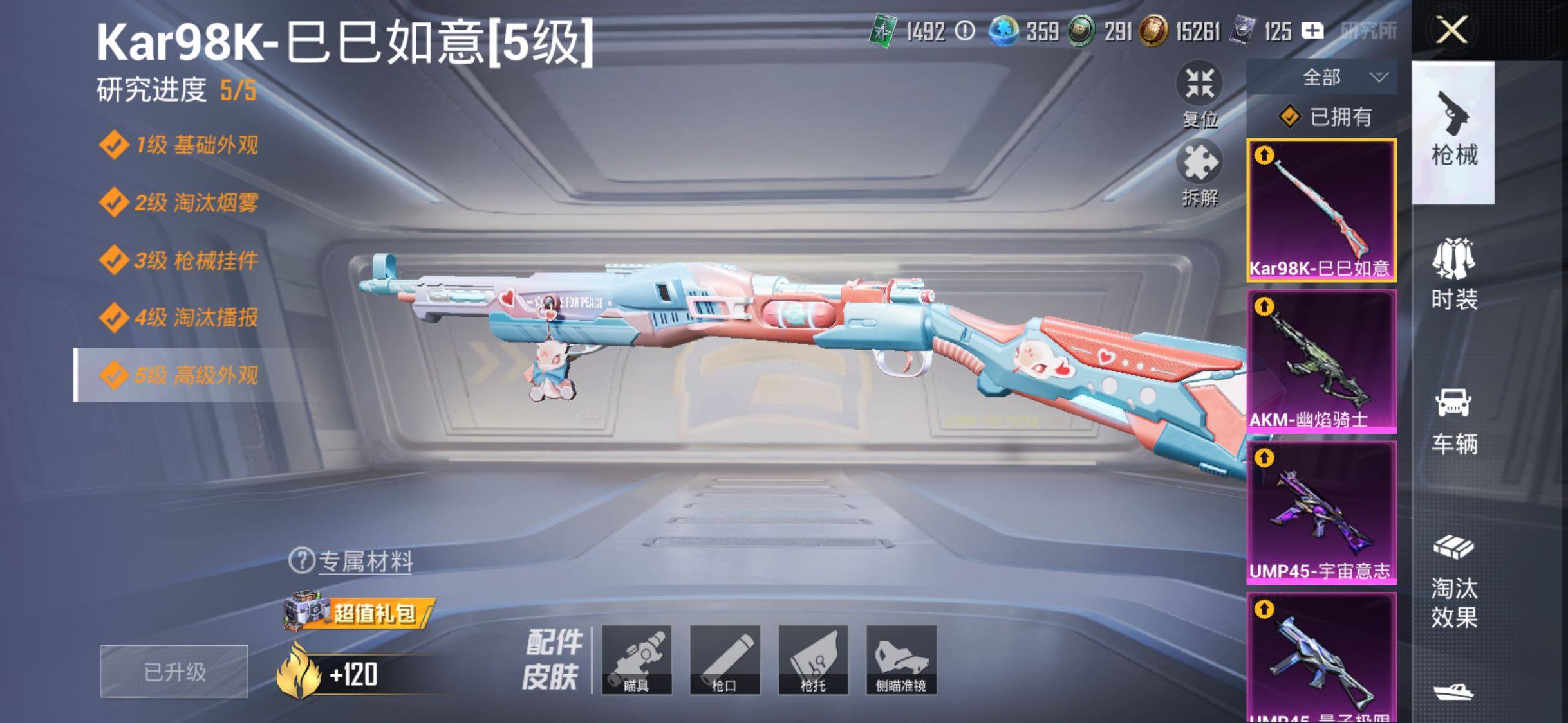 【粉色枪皮等级】:AKM-幽焰骑士(三级),UMP45-量子极限(五级),UMP45-宇宙意志(三级),Kar98K-巳巳如意(五级),M24-镜域双华(三级)