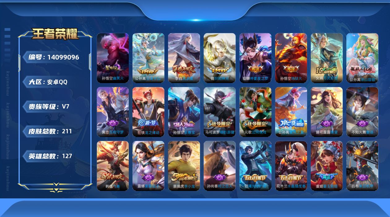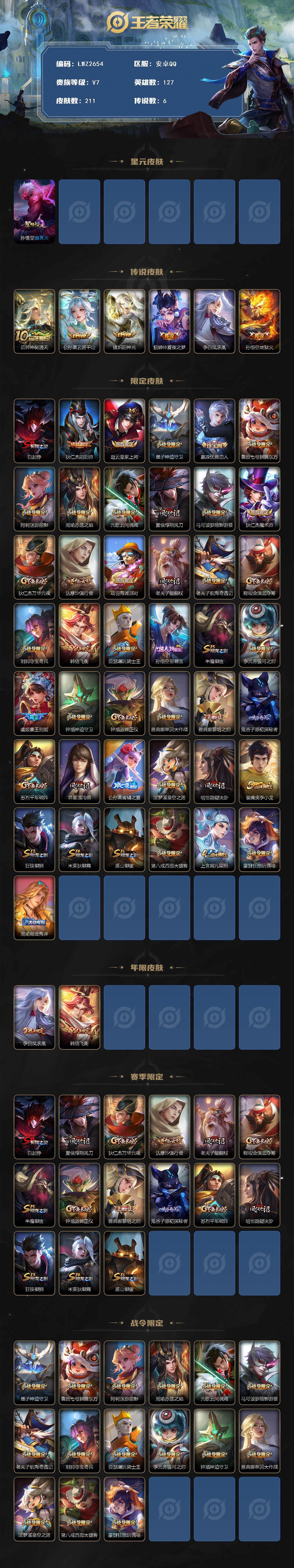 - [11626722]V7 2典藏 12传说 123英雄 190皮肤 可修改实名 优质装备:鸣剑·曳影,银白咏叹调(倪克斯侍卫),一念神魔,地狱火,乞巧织情,时之恋人-刘备(电焊工),无双飞将,山海·炽霜斩(李信年限),山海·苍雷引(电光曜子),澜逐花归海 传说皮:乘龙·铭钟鼎(赵云年限),乘龙·淬吴钩(孙策年限),落雪白狼 珍宝阁皮:妄想食味,玩趣恶龙 限定皮:愿照·九州拓(澜年限),逐霄战戟,神威(电光马子),五谷丰年,梁祝,李小龙,大圣娶亲,山海·玄木吟(马可年限) 史诗皮:器灵·浮梦炉,星界特工,茶境仙,埋骨钱,怒海争锋,百相守梦-百里守约,紫霞仙子,电玩小子(小书包),黄金分割率,特工魅影,千年之狐,永昼,江河有灵,百解令(蒙犽),高渐离燃音魔法,偶像歌手,冰冠公主,末日机甲-吕布,猫狗日记-孙策,节奏热浪,修罗,女仆咖啡,水果甜心,星夜王子,心灵骇客,德古拉伯爵,暗隐猎兽者,鬼剑武藏,天秀·启明,地狱岩魂,诗语江南,拒霜思,乘风破浪,水晶猎龙者,曙光守护者,金属风暴,圣诞狂欢,鹰眼统帅,魅力维加斯,赏金猎手,无心