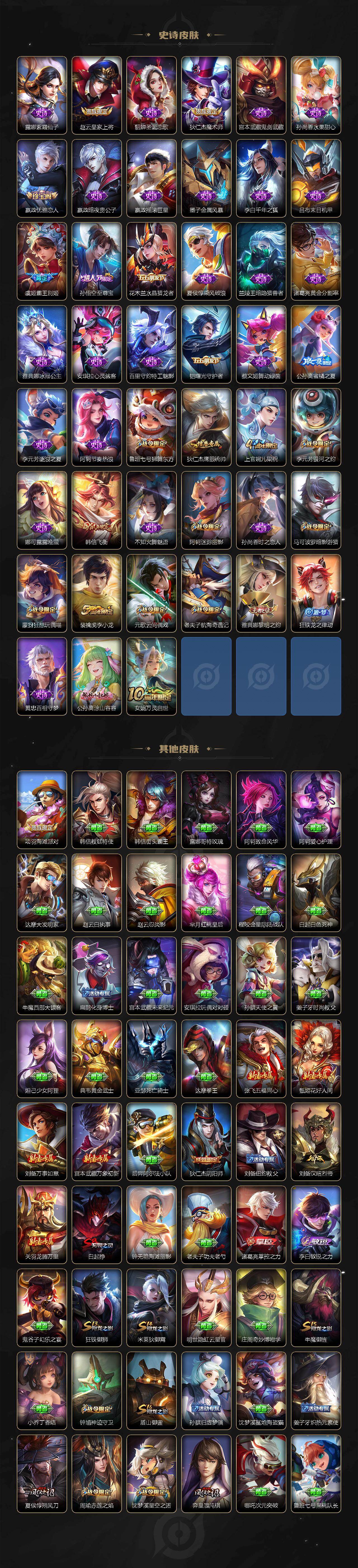 【史诗皮肤】:露娜紫霞仙子,赵云皇家上将,貂蝉圣诞恋歌,狄仁杰魔术师,宫本武藏鬼剑武藏,孙尚香水果甜心,嬴政优雅恋人,嬴政暗夜贵公子,嬴政摇滚巨星,墨子金属风暴,李白千年之狐,吕布末日机甲,虞姬霸王别姬,孙悟空至尊宝,花木兰水晶猎龙者,夏侯惇乘风破浪,兰陵王暗隐猎兽者,诸葛亮黄金分割率,雅典娜冰冠公主,安琪拉心灵骇客,百里守约特工魅影,铠曙光守护者,蔡文姬舞动绿茵,公孙离蜜橘之夏,李元芳逐浪之夏,阿轲节奏热浪,鲁班七号狮舞东方,狄仁杰鹰眼统帅,上官婉儿梁祝,李元芳银河之约,娜可露露晚萤,韩信飞衡,不知火舞魅语,阿轲迷踪丽影,孙尚香时之恋人,马可波罗暗