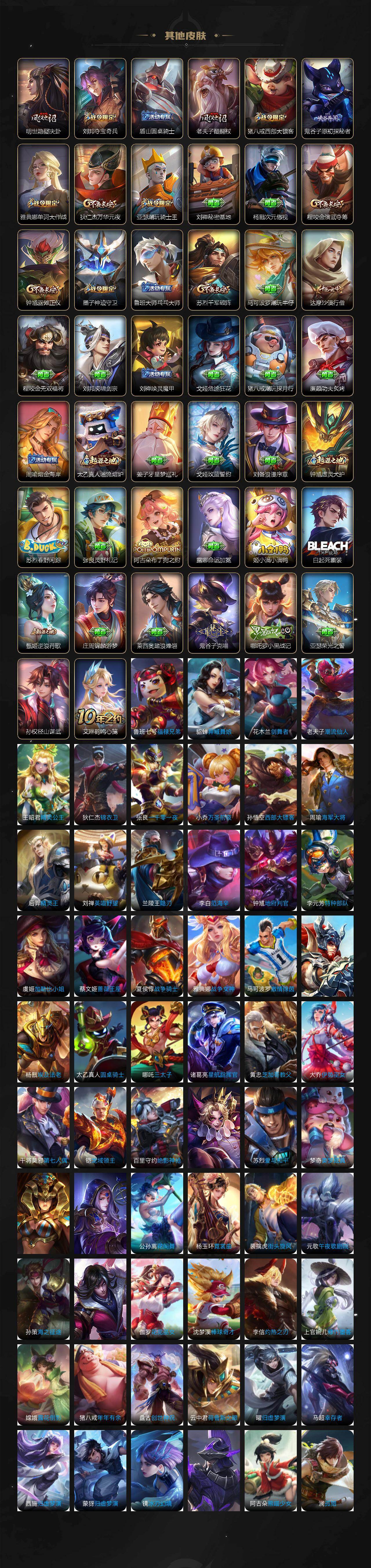 【限定皮肤】:白起狰,狄仁杰阴阳师,赵云皇家上将,墨子神迹守卫,嬴政优雅恋人,鲁班七号狮舞东方,阿轲迷踪丽影,周瑜赤莲之焰,元歌云间偶戏,夏侯惇朔风刀,马可波罗暗影游猎,狄仁杰魔术师,狄仁杰万华元夜,达摩沙漠行僧,项羽海滩派对,老夫子醍醐杖,老夫子航海奇遇记,程咬金演武夺筹,刘邦夺宝奇兵,韩信飞衡,亚瑟潮玩骑士王,孙悟空至尊宝,牛魔御旌,李元芳银河之约,虞姬霸王别姬,钟馗神迹守卫,钟馗驱傩正仪,雅典娜单词大作战,雅典娜黎明之约,鬼谷子原初探秘者,苏烈千军破阵,弈星混沌棋,公孙离蜜橘之夏,沈梦溪星空之诺,明世隐疑决卦,裴擒虎李小龙,狂铁御狮,米莱狄御霄,盾山御銮,猪八戒西部大镖客,上官婉儿梁祝,蒙犽狂想玩偶喵,周瑜熔金海岸
