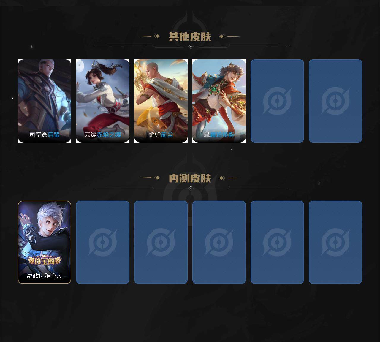 【赛季限定】:白起狰,夏侯惇朔风刀,狄仁杰万华元夜,达摩沙漠行僧,老夫子醍醐杖,程咬金演武夺筹,牛魔御旌,钟馗驱傩正仪,雅典娜黎明之约,鬼谷子原初探秘者,苏烈千军破阵,弈星混沌棋,明世隐疑决卦,狂铁御狮,米莱狄御霄,盾山御銮