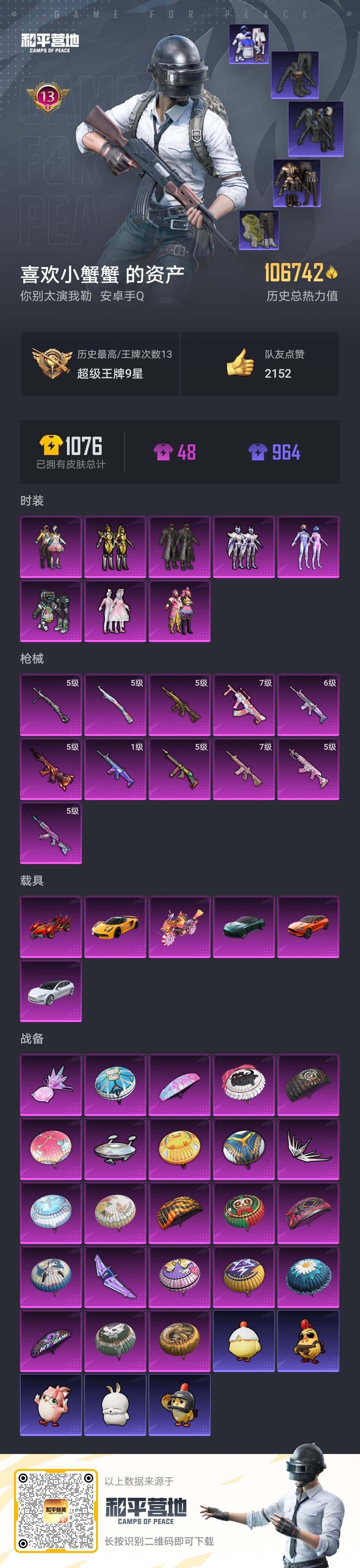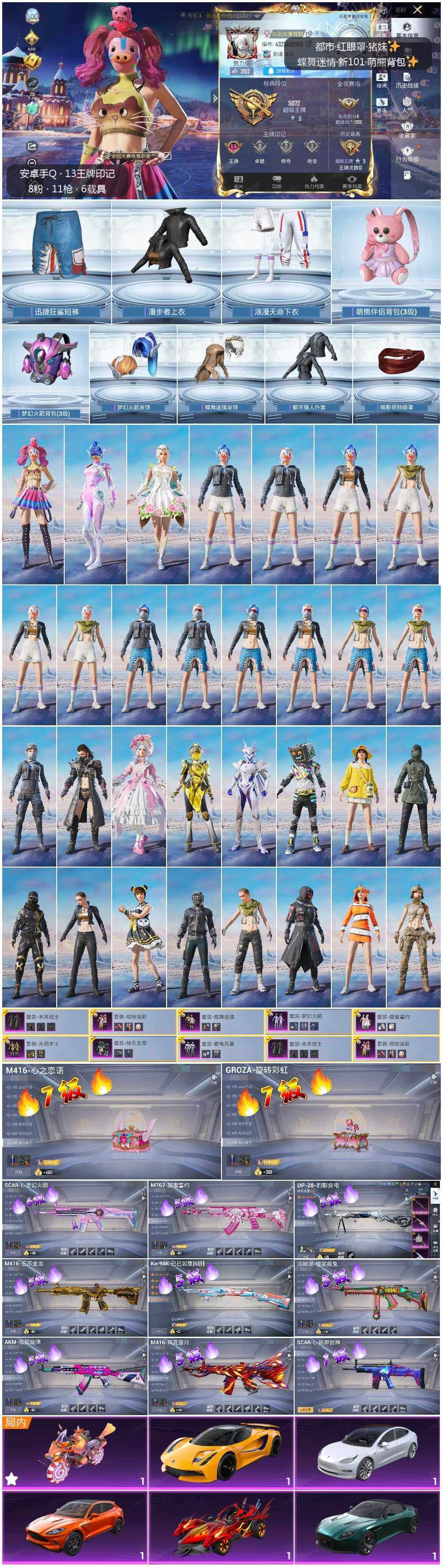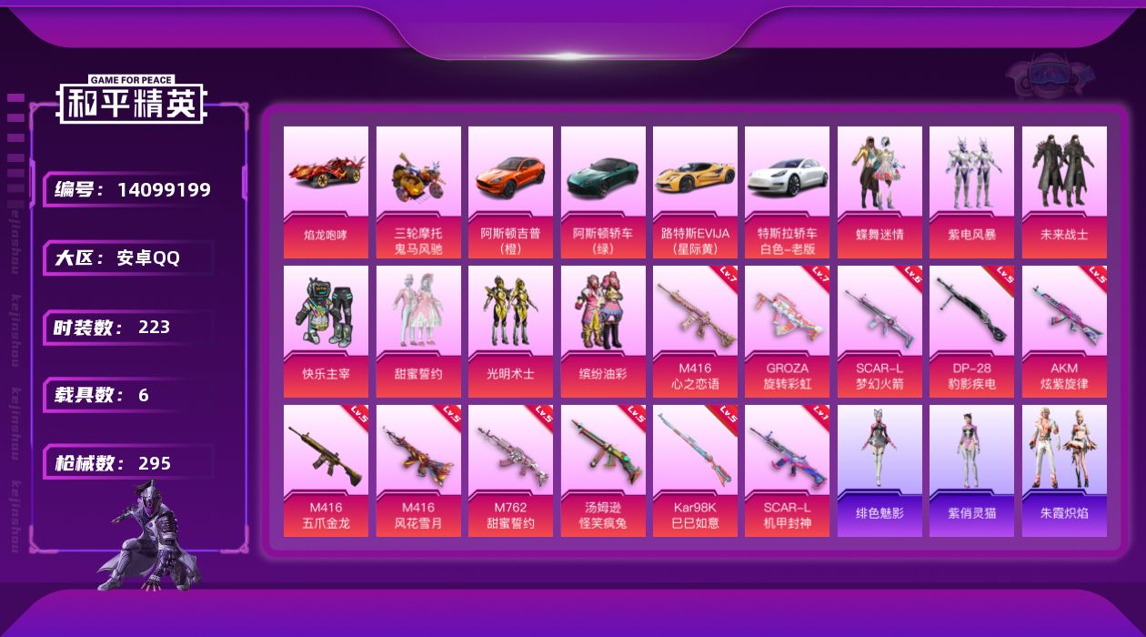 - PX_2090776- 安卓手Q-15王牌印记-14粉装-6特效枪-3载具-97808热力值-233套装-279枪皮-2卓越印记-0传奇印记 【14粉装】,缤纷油彩,狂魇小丑,光极星,霓虹漫游,飓风飞鹰,星云暗核,炫光之旅,金属狂野,月影灵韵,智能音符,炙焰牛王,数码大师,未来战士,脉冲星 【6特效枪】SCAR-L-锦绣绵绵-5级 M416-电玩时刻-5级 M416-至情至圣-9级 AUG-圣斗士