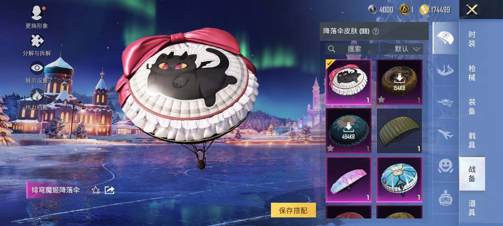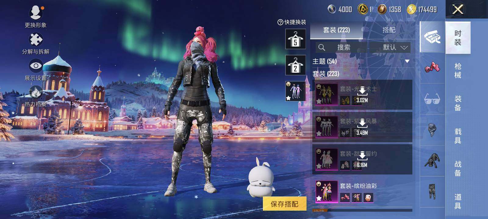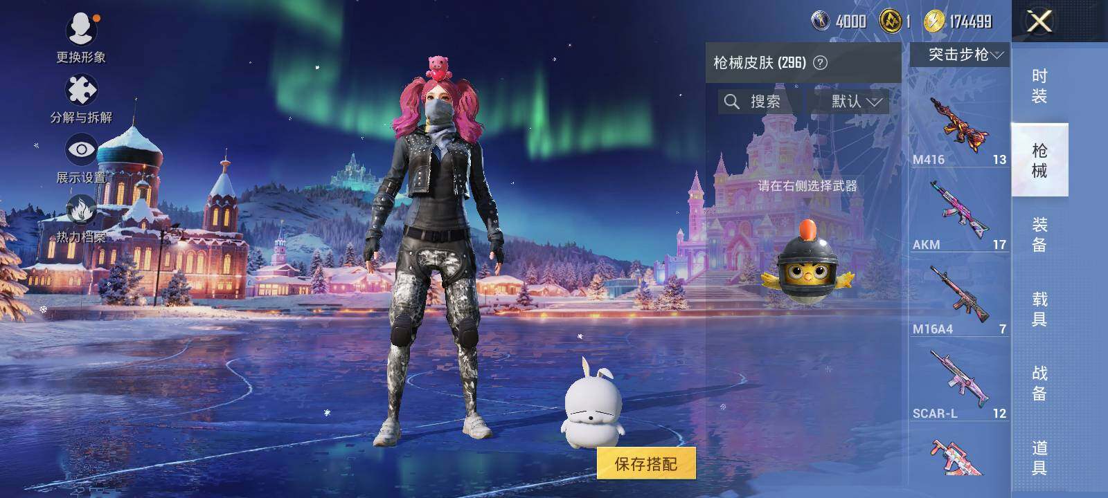 AKM-炫紫旋律,SCAR-L-梦幻火箭,SCAR-L-机甲封神,M416-五爪金龙,M416-心之恋语,M416-风花雪月,GROZA-旋转彩虹,M762-甜蜜誓约,汤姆逊-怪笑疯兔,Kar98K-巳巳如意