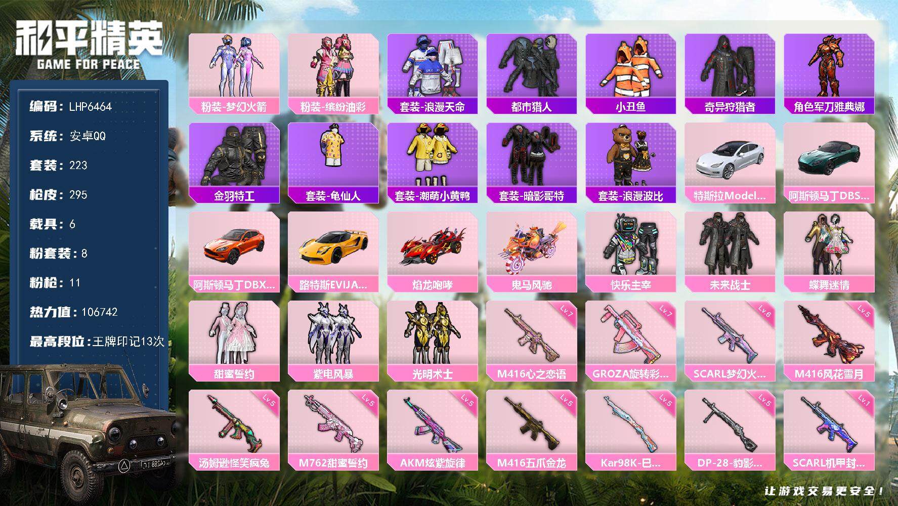 [14099199]【店主推荐捡漏号!可直接换绑】/素材身法号 安卓 手Q-8粉装-11特效枪-6载具-4粉色飞行器-10.6w热力值-13王牌印记-223套装-295枪皮【热门品类】:粉装-梦幻火箭,粉装-缤纷油彩,套装-浪漫天命,套装-都市猎人,套装-小丑鱼,套装-奇异狩猎者,角色-军刀雅典娜,套装-金羽特工,套装-龟仙人,套装-潮萌小黄鸭,套装-暗影哥特,套装-浪漫波比【粉色载具】:特斯拉Model 3(珍珠白),阿斯顿马丁DBS(绿),阿斯顿马丁DBX(橙),路特斯EVIJA(星际黄),焰龙咆哮,鬼马风驰【粉色套装】:粉装-快乐主宰,粉装-未来战士,粉装-蝶舞迷情,粉装-梦幻火箭,粉装-缤纷油彩,粉装-甜蜜誓约,粉装-紫电风暴,粉装-光明术士【粉色枪皮等级】:AKM-炫紫旋律(五级),SCAR-L-梦幻火箭(六级),SCAR-L-机甲封神(一级),M416-五爪金龙(五级),M416-心之恋语(七级),M416-风花雪月(五级),GROZA-旋转彩虹(七级),M762-甜蜜誓约(五级),汤姆逊-怪笑疯兔(五级),Kar98K-巳巳如意(五级),DP-28-豹影疾电(五级)【粉色飞行器】:梦幻火箭飞行器,闪光银龙飞行器,千面幻镜飞行器