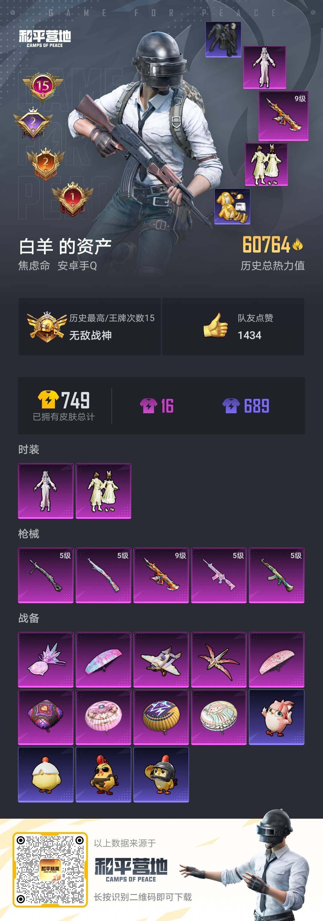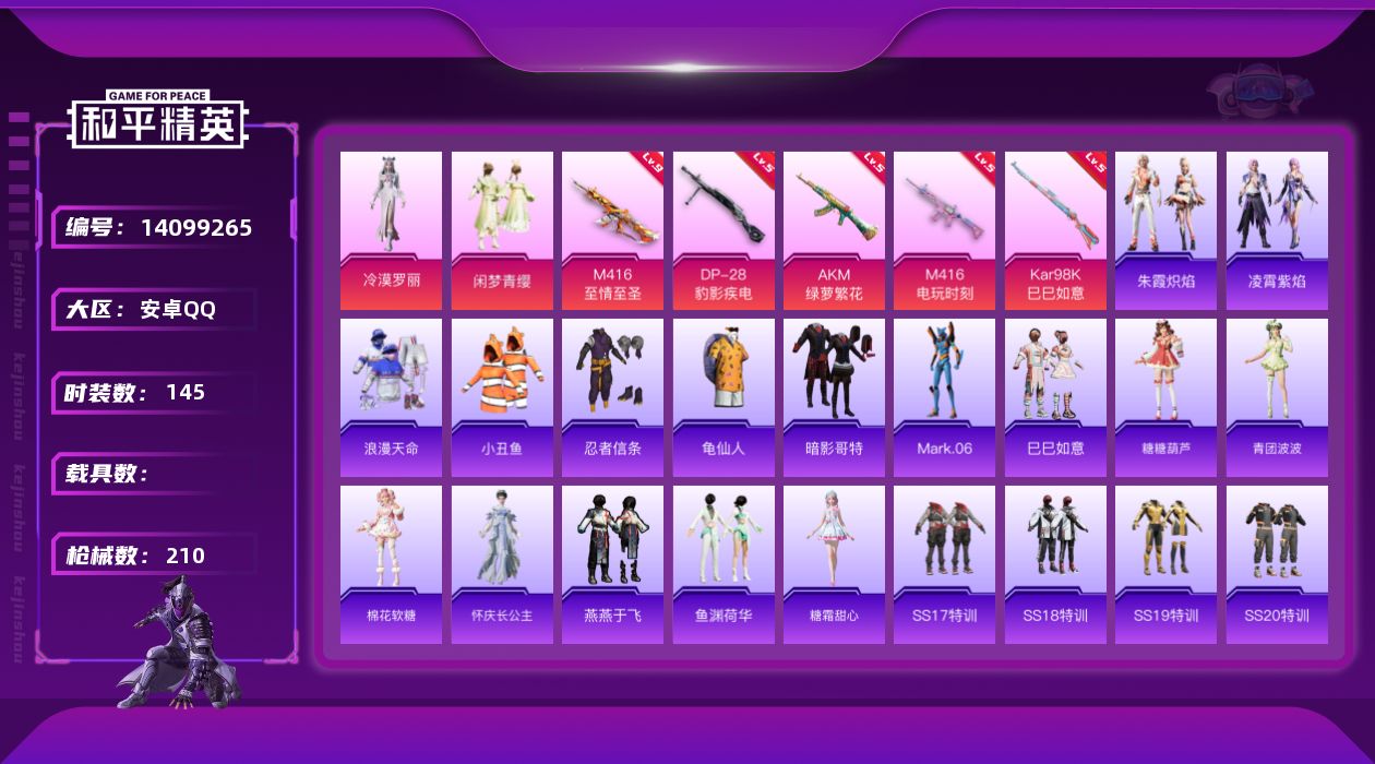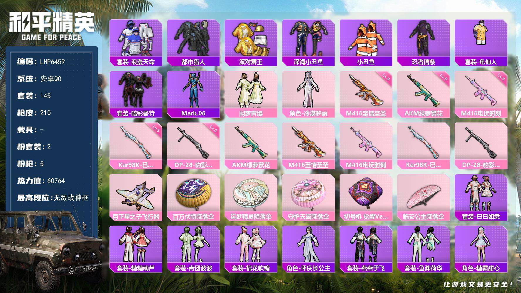 - [12844255]安卓 手Q-8粉装-8特效枪-0载具-3粉色飞行器-89450热力值-13王牌印记-237套装-295枪皮 【热门品类】:旭日初心兜帽大衣,套装-龟仙人,小恶魔头饰 【粉色套装】:粉装-深海曼妙,粉装-冰霜白皇,粉装-炙焰红王,粉装-王牌四分卫,角色-洛天依,玩偶服-猪猪侠,粉装-雪月幻音,角色-智耀战神 【粉色枪皮等级】:M416-风花雪月(七级),GROZA-镜光银凌(五级),AUG-暖羊咩咩(五级),Kar98K-巳巳如意(五级),SKS-碧影闪光(四级),Mk14-樱桃泡泡(六级),AMR-炫光之旅(六级),DP-28-豹影疾电(四级) 【粉色枪皮】:M416-风花雪月,GROZA-镜光银凌,AUG-暖羊咩咩,Kar98K-巳巳如意,SKS-碧影闪光,Mk14-樱桃泡泡,AMR-炫光之旅,DP-28-豹影疾电 【粉色飞行器】:春暖花开飞行器,庄周梦蝶飞行器,戏水时光飞行器 【粉色降落伞】:神秘黑猫降落伞,古堡领主降落伞,四圣焕新降落伞,星之彼岸降落伞,古战神甲降落伞,洛神天依降落伞,红伞翩翩降落伞,蓝莓炮弹降落伞,忍者神龟降落伞,临安公主降落伞,月影灵韵降落伞,雪月幻音降落伞 【稀有套装】:套装-龟仙人,套装-巳巳如意,套装-糖糖葫芦,套装-青团波波,角色-临安公主,角色-俏兔智灵,套装-燕燕于飞,套装-鱼渊荷华,套装-风舞幻音,套装-粉恋花,套装-紫幽梦,套装-蓝冰羽 【稀有枪皮】:AKM-夜灯,AKM-彩虹符号,AKM-影袭,AKM-灼热熔岩,AKM-生命誓言,AKM-百万伏特,AKM-破晓战魂,AKM-缤纷海域,AKM-萌趣颜团子,AKM-虎虎生威,AKM-霓虹街区,AKM-龙的传人,M16A4-凝视深渊,M16A4-夜灯,M16A4-幻世战舞者,M16A4-生命誓言,M16A4-红色方程式,M16A4-蓝色火焰,SCAR-L-夜灯,SCAR-L-炫彩节奏,SCAR-L-玉兔迎春,SCAR-L-甜蜜誓约,SCAR-L-繁花小夜曲,SCAR-L-红色方程式,M416-夜灯,M416-彩虹嘻嘻猴,M416-潮汐统领,M416-神秘黑猫,M416-糯团青竹,M416-红色方程式,M416-蓝色火焰,M416-诡夜天鹅,GROZA-异彩先驱,GROZA-彩虹符号,GROZA-影袭,GROZA-恐龙拽拽,GROZA-懵萌河马,GROZA-春暖花开,GROZA-
