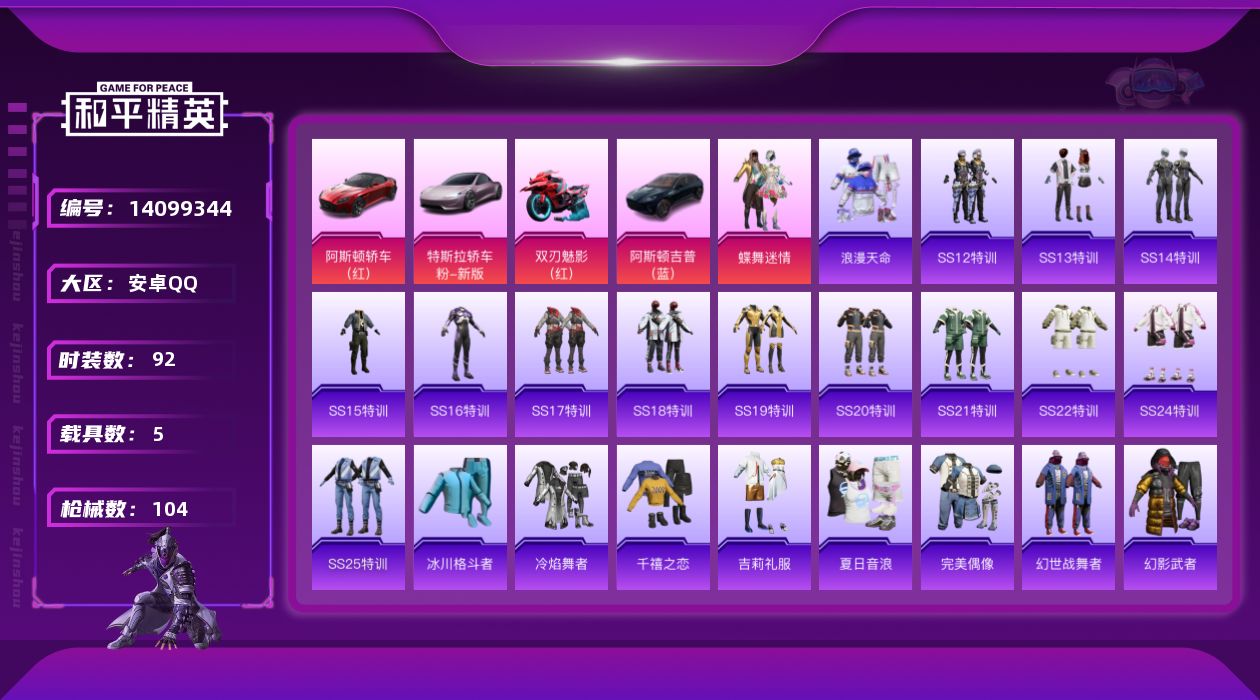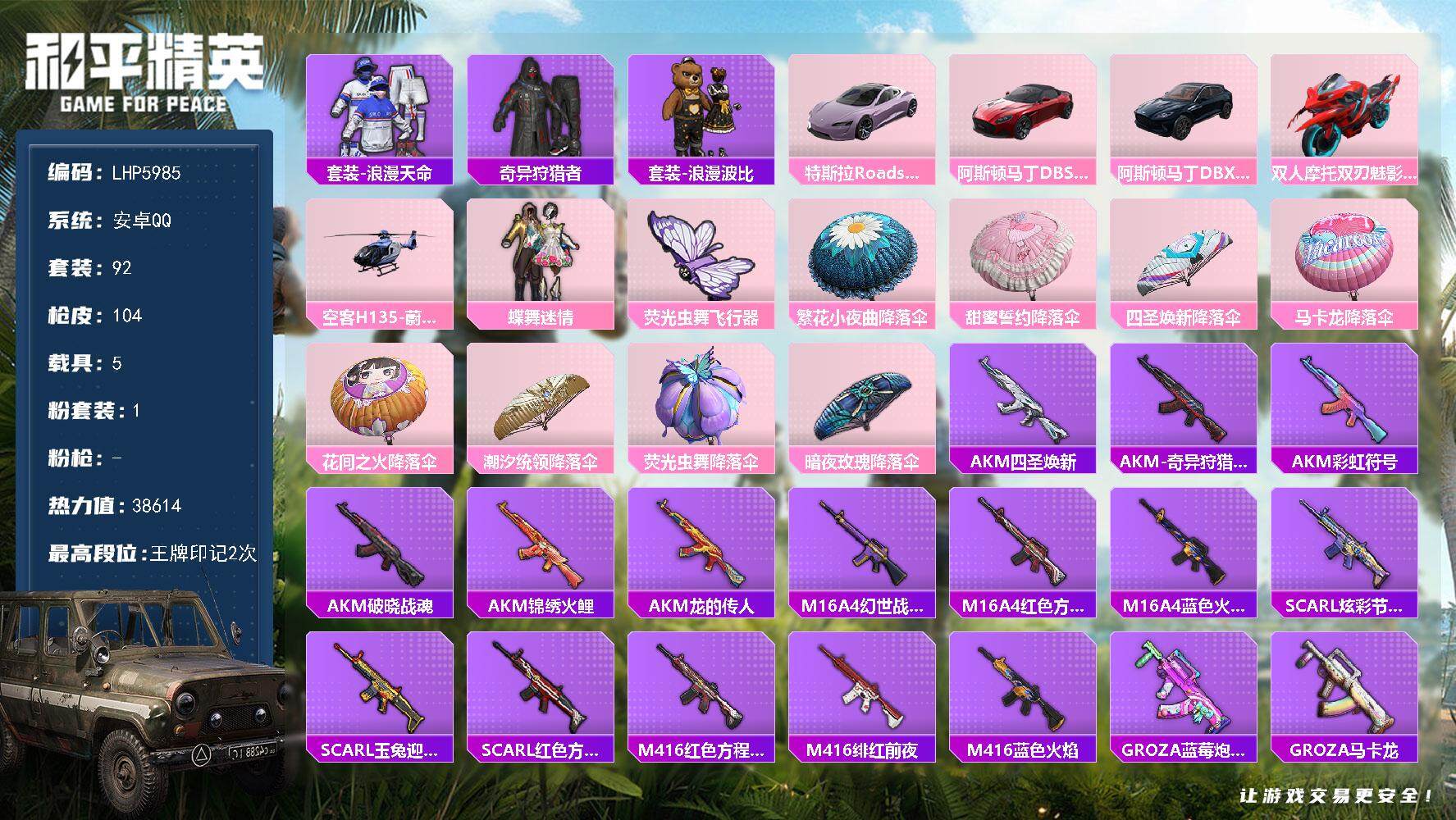 [14099344]可二次【店主推荐捡漏号!可直接换绑】安卓 手Q-1粉装-5载具-1粉色飞行器-3.8w热力值-2王牌印记-92套装-104枪皮【热门品类】:套装-浪漫天命,套装-奇异狩猎者,套装-浪漫波比【粉色载具】:特斯拉Roadster(沁心粉),阿斯顿马丁DBS(红),阿斯顿马丁DBX(蓝),双人摩托-双刃魅影(红),空客H135-蔚蓝之翼【粉色套装】:粉装-蝶舞迷情【粉色飞行器】:荧光虫舞飞行器