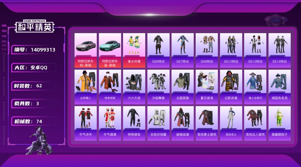 - [15080962]安卓 手Q-15粉装-12特效枪-3载具-3粉色飞行器-90573热力值-14王牌印记-184套装-231枪皮 【热门品类】:粉装-梦幻火箭,套装-浪漫天命,套装-都市猎人,套装-深海小丑鱼,套装-小丑鱼,套装-奇异狩猎者,套装-粉红小猪,角色-Mark.06 【粉色载具】:特斯拉Roadster(水滴蓝),兰博基尼Aventador SVJ(翡翠绿),兰博基尼URUS(明艳黄) 【粉色套装】:粉装-幻影战神,粉装-数码大师,粉装-未来战士,粉装-宝贝奶油派,粉装-梦幻火箭,粉装-新星烈龙,粉装-俏皮狐尾,粉装-绚金战神,粉装-海渊国主,粉装-青葱仙萝,粉装-碧影闪光,粉装-薄荷物语,粉装-橘柚倾心,角色-复仇流浪者,粉装-垂柳戏鸭 【粉色枪皮等级】:SCAR-L-青春物语(四级),M416-五爪金龙(二级),M416-心之恋语(一级),M416-风花雪月(三级),GROZA-香水柠檬(四级),AUG-星之彼岸(五级),M762-激战未来(四级),UMP45-恐龙拽拽(四级),Kar98K-巳巳如意(五级),M249-蓝莓炮弹(一级),DP-28-豹影疾电(五级),MG3-洛神天依(一级) 【粉色枪皮】:SCAR-L-青春物语,M416-五爪金龙,M416-心之恋语,M416-风花雪月,GROZA-香水柠檬,AUG-星之彼岸,M762-激战未来,UMP45-恐龙拽拽,Kar98K-巳巳如意,M249-蓝莓炮弹,DP-28-豹影疾电,MG3-洛神天依 【粉色飞行器】:王牌四分卫飞行器,星之彼岸飞行器 【粉色降落伞】:百万伏特降落伞,甜心宝贝降落伞,梦幻火箭降落伞,阿狸红降落伞,香水柠檬降落伞,星之彼岸降落伞,怪笑疯兔降落伞,烈焰拳霸降落伞,暗夜玫瑰降落伞,洛神天依降落伞,蓝莓炮弹降落伞,碧影闪光降落伞,青春物语降落伞,恐龙拽拽降落伞,筑梦精灵降落伞,圣光天使降落伞,闪光银龙降落伞,垂柳戏鸭降落伞,翩跹演武降落伞,彩虹甜喵降落伞,旋转彩虹降落伞,幻彩电音降落伞 【稀有套装】:套装-巳巳如意 【稀有枪皮】:AKM-夜灯,AKM-山经魅狐,AKM-彩虹符号,AKM-影袭,AKM-星之彼岸,AKM-灼热熔岩,AKM-王牌投手,AKM-环太平洋,AKM-百万伏特,AKM-破晓战魂,AKM-萌趣颜团子,AKM-虎虎生威,AKM-锦绣火鲤,AKM-霓虹街区,M16A4-夜灯,M1