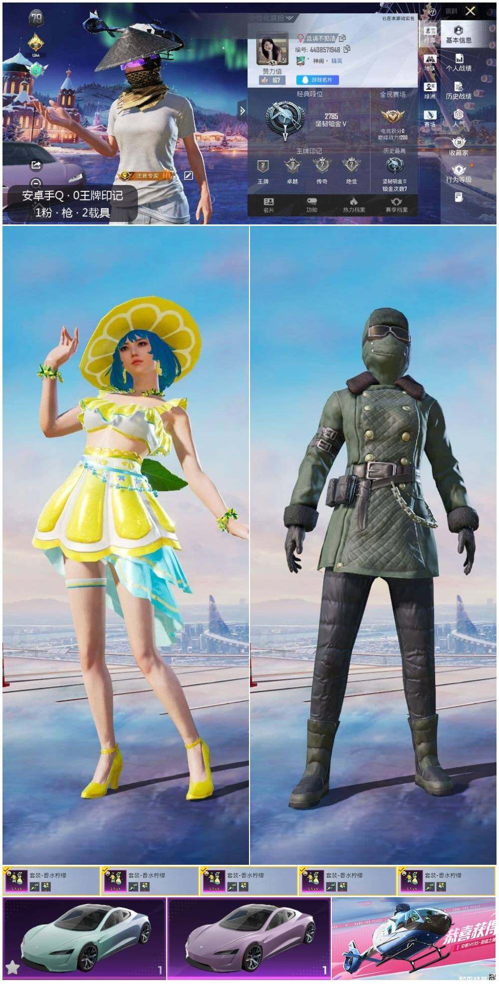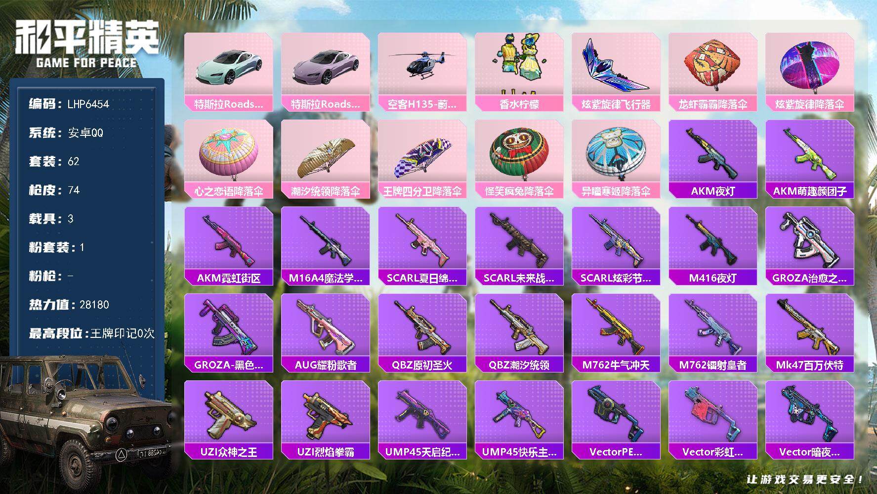[14099313]可二次【店主推荐捡漏号!可直接换绑】 安卓 手Q-1粉装-3载具-1粉色飞行器-2.8w热力值-0王牌印记-62套装-74枪皮【粉色载具】:特斯拉Roadster(水滴蓝),特斯拉Roadster(沁心粉),空客H135-蔚蓝之翼【粉色套装】:粉装-香水柠檬【粉色飞行器】:炫紫旋律飞行器