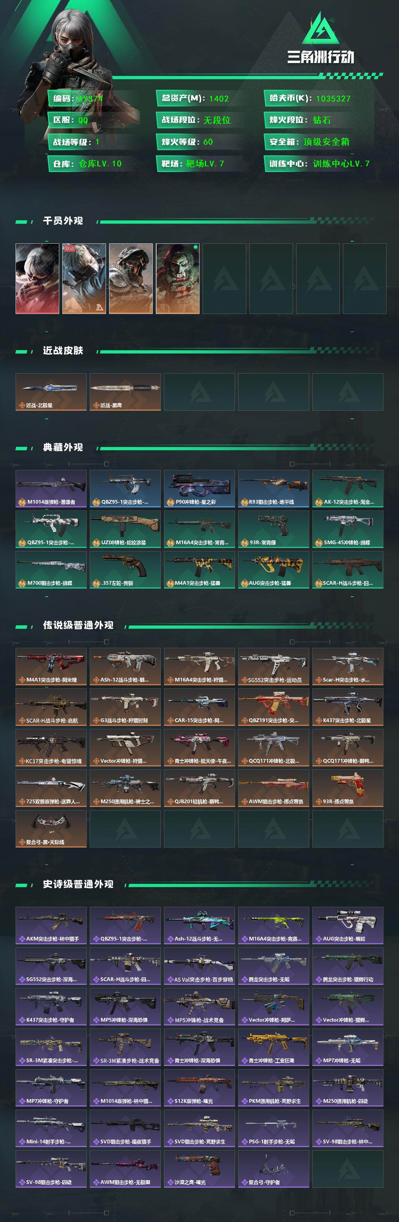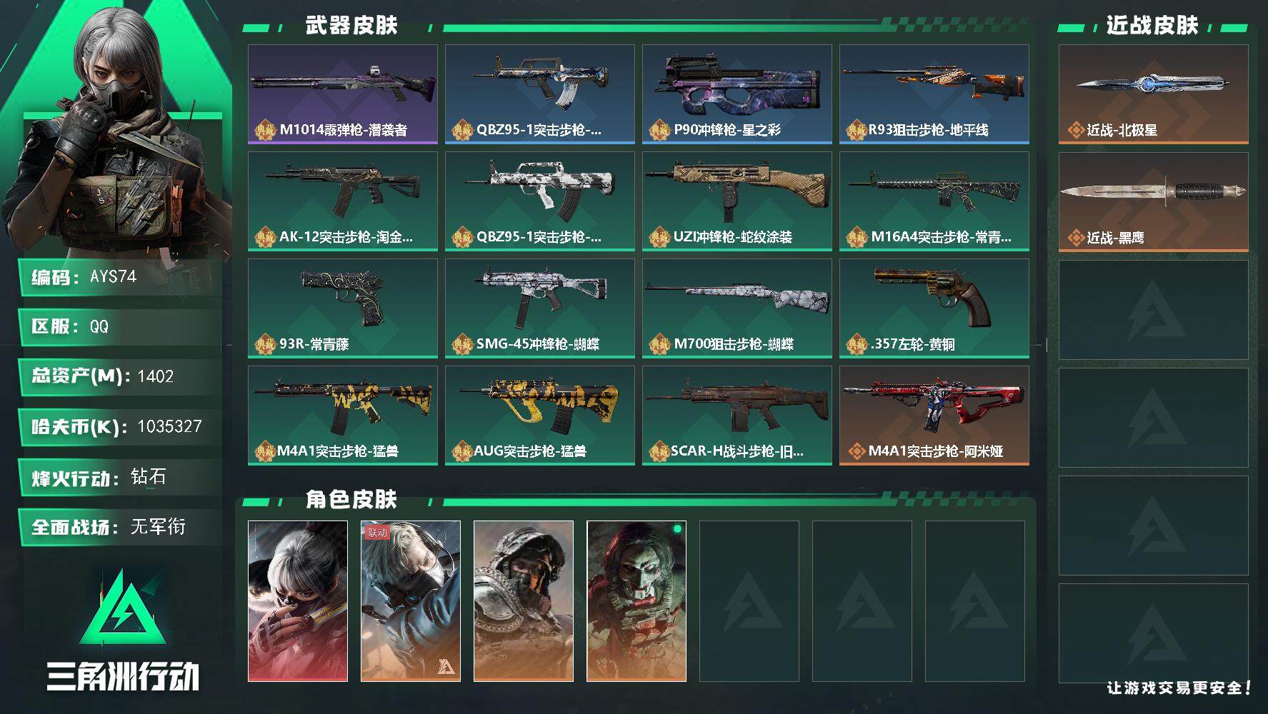 [14103742]总资产1.4b 可二次【店主推荐捡漏号!可直接换绑】1035327k哈伏币-1326m流动资产-60烽火等级-钻石-1战场等级-无军衔 【干员外观】:骇爪-水墨云图,蜂医-送葬人·无题密令,深蓝-不破誓约,红狼-电锯惊魂 【近战皮肤】:近战-北极星,近战-黑鹰 【典藏外观】:M1014霰弹枪-潜袭者,QBZ95-1突击步枪-花岗岩,P90冲锋枪-星之彩,R93狙击步枪-地平线,AK-12突击步枪-淘金者,QBZ95-1突击步枪-水墨迷彩,UZI冲锋枪-蛇纹涂装,M16A4突击步枪-常青藤,93R-常青藤,SMG-45冲锋枪-蝴蝶,M700狙击步枪-蝴蝶,.357左轮-黄铜,M4A1突击步枪-猛兽,AUG突击步枪-猛兽,SCAR-H战斗步枪-旧工业 【传说级普通外观】:M4A1突击步枪-阿米娅,ASh-12战斗步枪-鹅鸭杀,M16A4突击步枪-狩猎时刻,SG552突击步枪-运动员,SCAR-H战斗步枪-水墨云图,SCAR-H战斗步枪-启航,G3战斗步枪-狩猎时刻,G3战斗步枪-骑士,CAR-15突击步枪-阿米娅,腾龙突击步枪-捞点薯条,K437突击步枪-北极星,KC17突击步枪-电锯惊魂,Vector冲锋枪-狩猎时刻,勇士冲锋枪-能天使-午夜邮差,QCQ171冲锋枪-北极星,QCQ171冲锋枪-鹅鸭杀,725双管霰弹枪-送葬人-无题密令,M250通用机枪-骑士之心,QJB201轻机枪-鹅鸭杀,AWM狙击步枪-捞点薯条,93R-捞点薯条,复合弓-黑·天际线 【史诗级普通外观】:AKM突击步枪-林中猎手,QBZ95-1突击步枪-曙光,ASh-12战斗步枪-无极限,M16A4突击步枪-竞赛选手,AUG突击步枪-蝮蛇,SG552突击步枪-深海恐惧,SCAR-H战斗步枪-囚徒,AS Val突击步枪-百步穿杨,腾龙突击步枪-无垢,腾龙突击步枪-猎鳄行动,K437突击步枪-守护者,MP5冲锋枪-深海恐惧,MP5冲锋枪-战术竞备,Vector冲锋枪-阿萨拉文明,Vector冲锋枪-猎鳄行动,SR-3M紧凑突击步枪-荒野求生,SR-3M紧凑突击步枪-战术竞备,勇士冲锋枪-深海恐惧,勇士冲锋枪-工业狂潮,MP7冲锋枪-无垢,MP7冲锋枪-守护者,M1014霰弹枪-林中猎手,S12K霰弹枪-曙光,PKM通用机枪-荒野求生,M250通用机枪-囚徒,Mini-14射手步枪-守护者,SVD狙击