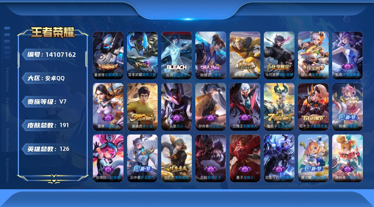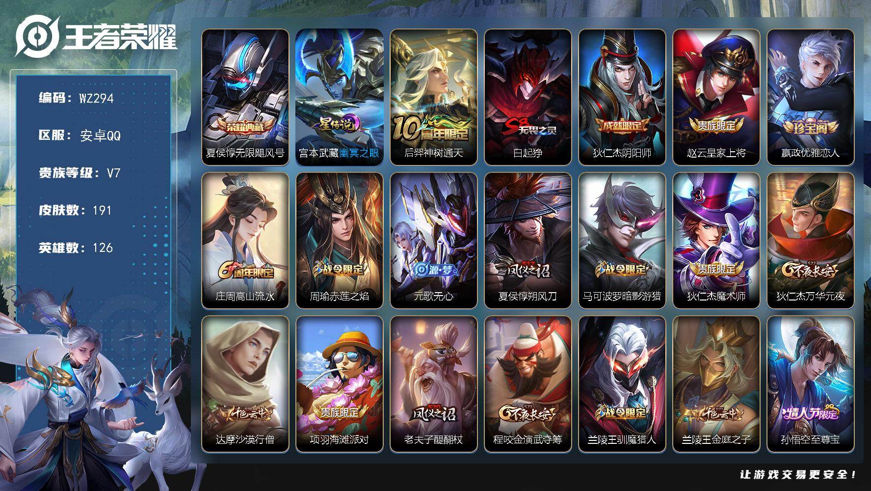 - [12075236]V7 16传说 123英雄 208皮肤 可修改实名 连体和平 优质装备:一念神魔,仲夏夜之梦(大飞蛾),地狱之眼,李逍遥,山海·炽霜斩(李信年限),浮生妄,琥珀纪元铠 传说皮:乘龙·淬吴钩(孙策年限),吕布曦玄引,幻光神枪 珍宝阁皮:胡桃夹子,玩趣恶龙 限定皮:愿照·九州拓(澜年限),愿照·岁时盈(虞姬年限),逐霄战戟,鸣野蒿,夏侯惇霜北刀,山海·碧波行(瑶年限),齐天大圣,怒海麟威,五谷丰年,青龙志(铠年限),游园惊梦,岱宗(典韦年限),朱雀志(守约年限),孙行者,匿光启智者,神器·万象笔,山海·玄木吟(马可年限) 史诗皮:龙之律动,怒海争锋,破空之剑,芈月浮光幕影,蔬乡物语(鲁班七号),百相守梦-黄忠,紫霞仙子,苍穹之光,白龙吟,特工魅影,千年之狐,江河有灵,无限星赏官,偶像歌手,猫狗日记-孙策,猫狗日记-大乔,节奏热浪,修罗,女仆咖啡,水果甜心,天才门将,星夜王子,心灵骇客,功夫厨神,德古拉伯爵,暗隐猎兽者,幽灵船长,鬼剑武藏,心灵战警,舞动绿茵,地狱岩魂,缤纷独角兽,逐浪之夏,曙光守护者,热力回旋,金属风暴,圣诞恋歌,鹰眼统帅,暗夜贵公子,魅力维加斯,无心,未来纪元-赵云