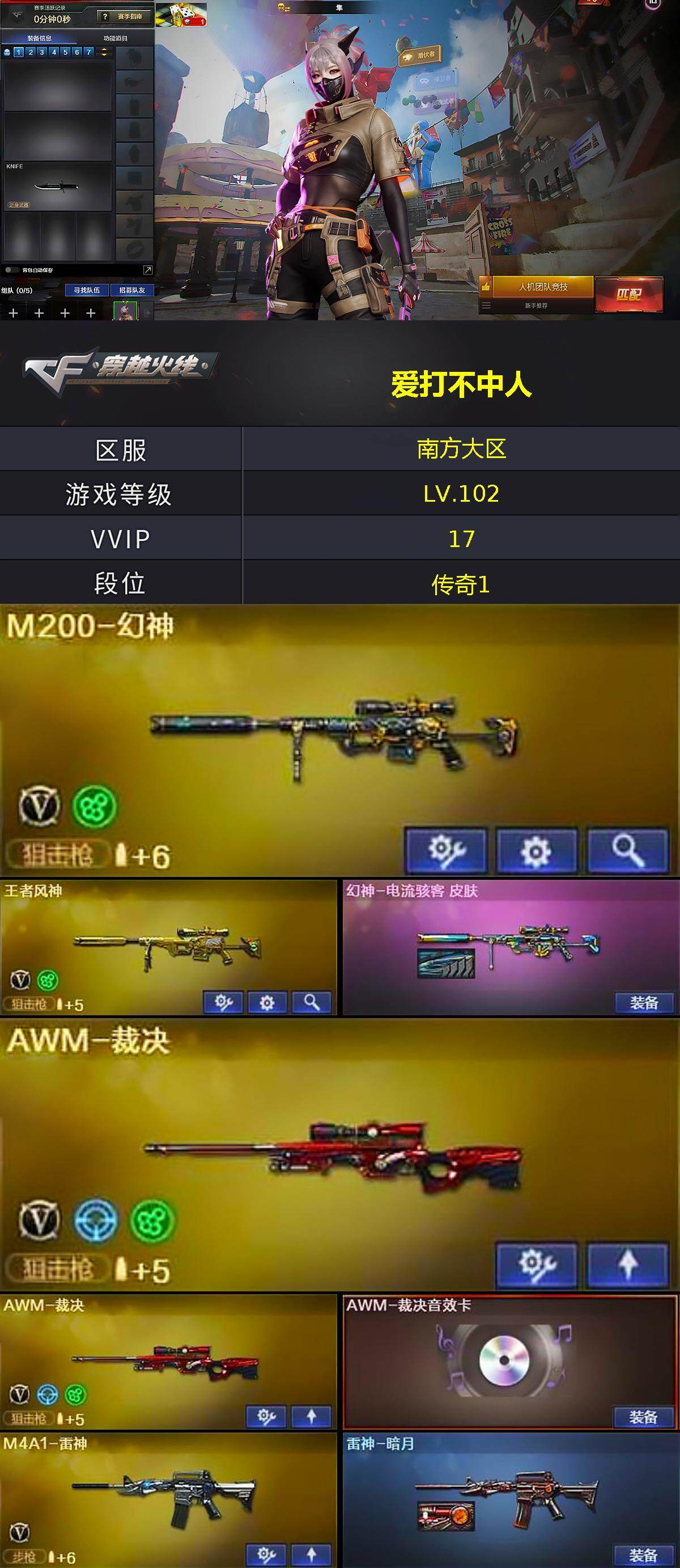 - [15411592]重庆一区-84V-5王者-1炫金 【传说武器】:传说暗裔 【热门武器】:传说暗裔,QBZ03-金色蔷薇,HK417-朱雀,死亡之眼,M4A1-黑骑士*6,汤姆逊-烈龙*6,RPK-盘龙*6,加特林-炼狱*2,COP-堕天神,沙鹰-修罗*3 【王者炫金武器】:王者之怒,炫金火麒麟 【音效卡】:Barrett-毁灭音效卡,炼狱-百战金芒-庆典舞曲音效卡 【皮肤】:汤姆逊-烈龙-末日皮肤,M4A1-