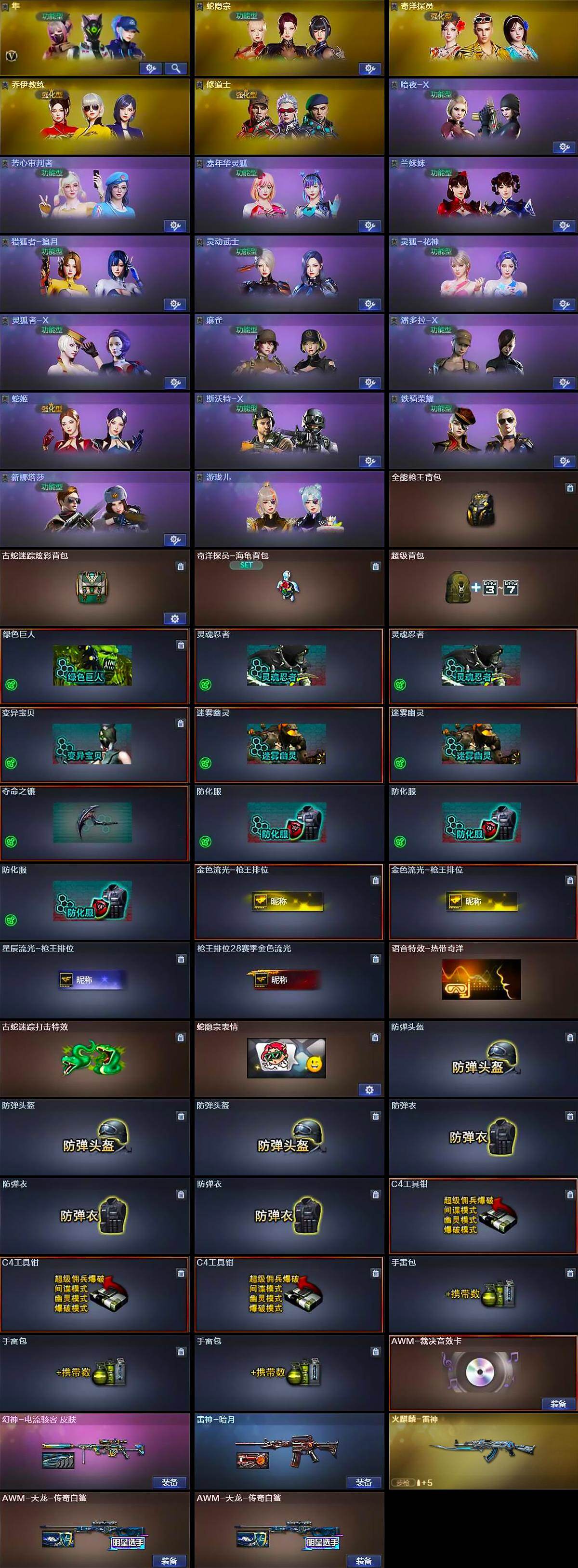【道具】:全能枪王背包,古蛇迷踪炫彩背包,奇洋探员-海龟背包,超级背包,绿色巨人,灵魂忍者*2,变异宝贝,迷雾幽灵*2,夺命之镰,防化服*3,金色流光-枪王排位*2,星辰流光-枪王排位,枪王排位28赛季金色流光,语音特效-热带奇洋,古蛇迷踪打击特效,蛇隐宗表情,防弹头盔*3,防弹衣*3,C4工具钳*3,手雷包*3