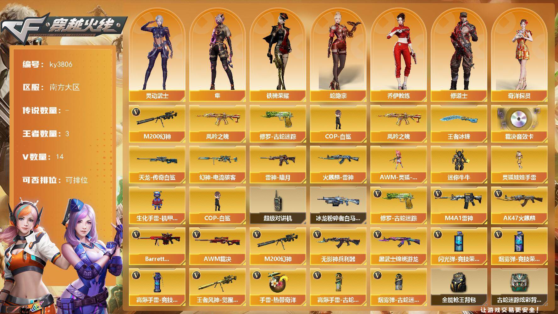 [14107181]南方大区-14V-3王者-0炫金 【热门武器】:M200-幻神,修罗-古蛇迷踪,凤吟之魄,COP-白鲨 【王者炫金武器】:凤吟之魄,王者冰锋 【音效卡】:AWM-裁决音效卡 【皮肤】:幻神-电流骇客 皮肤,雷神-暗月,火麒麟-雷神,AWM-天龙-传奇白鲨*2 【角色】:隼,蛇隐宗,奇洋探员,乔伊教练,修道士,暗夜-X,芳心审判者,嘉年华灵狐,兰妹妹,猎狐者-追月,灵动武士,灵狐-花神,灵狐者-X,麻雀,潘多拉-X,蛇姬,斯沃特-X,铁骑荣耀,新娜塔莎,游珑儿 【人偶武器】:COP-白鲨,AWM-灵狐-15周年嘉年华*2,迷你牛牛,生化手雷-机甲核心,灵狐娃娃手雷 【暴走生化】:超级对讲机 【挑战大师】:冰龙粉碎者-白马银枪 【英雄级武器】:AK47-火麒麟,M4A1-雷神,无影-神兵利器,黑武士-锦绣游龙,Barrett-极光,AWM-裁决*2,M200-幻神,王者风神-觉醒版,修罗-古蛇迷踪,高爆手雷-竞技荣光,手雷-热带奇洋,高爆手雷-古蛇迷踪,闪光弹-竞技荣光,烟雾弹-竞技荣光,烟雾弹-古蛇迷踪 【道具】:全能枪王背包,古蛇迷踪炫彩背包,奇洋探员-海龟背包,超级背包,绿色巨人,灵魂忍者*2,变异宝贝,迷雾幽灵*2,夺命之镰,防化服*3,金色流光-枪王排位*2,星辰流光-枪王排位,枪王排位28赛季金色流光,语音特效-热带奇洋,古蛇迷踪打击特效,蛇隐宗表情,防弹头盔*3,防弹衣*3,C4工具钳*3,手雷包*3 【特殊枪械】: