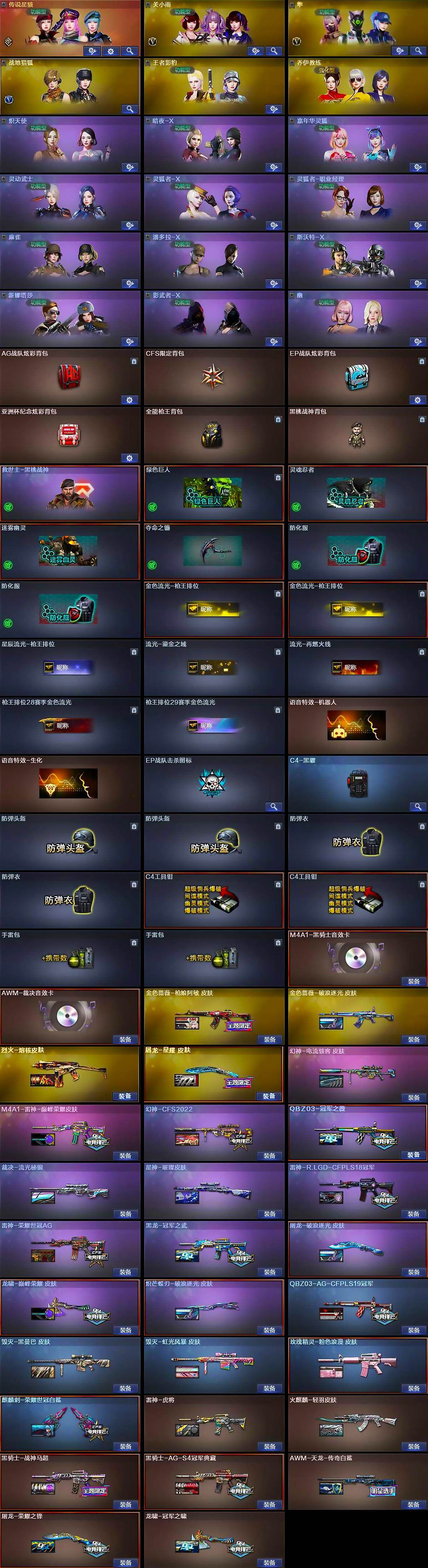 【皮肤】:幻神-CFS2022,幻神-电流骇客 皮肤,QBZ03-冠军之薇,QBZ03-AG-CFPLS19冠军,金色蔷薇-枪娘阿敏 皮肤,金色蔷薇-破浪逐光 皮肤,裁决-流光秘银,星神-璀璨皮肤,雷神-虎将,雷神-R.LGD-CFPLS18冠军,雷神-荣耀世冠AG,M4A1-雷神-巅峰荣耀皮肤,火麒麟-轻羽皮肤,毁灭-黑曼巴 皮肤,毁灭-虹光风暴 皮肤,黑龙-冠军之武,黑骑士-战神马超,黑骑士-AG-S4冠军典藏,玫瑰精灵-粉色浪漫 皮肤,烈火-熔核皮肤,AWM-天龙-传奇白鲨,屠龙-荣耀之锋,屠龙-星耀 皮肤,屠龙-破浪逐光 皮肤,龙啸-冠军之啸,龙啸-巅峰荣耀 皮肤,麒麟刺-荣耀世冠白鲨,炽芒蝶刃-破浪逐光 皮肤