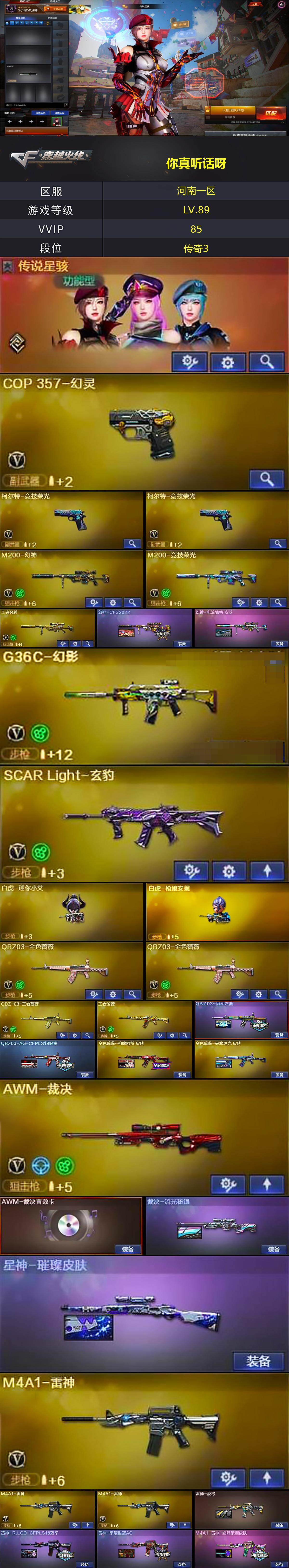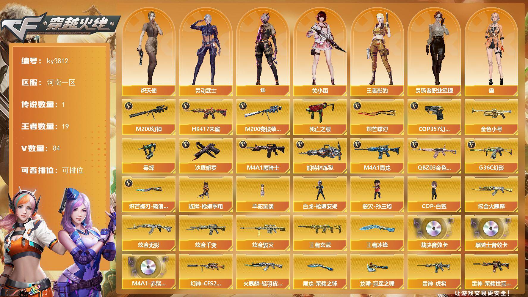 [14108410]河南一区-84V-19王者-4炫金 【传说角色】:传说星骇 【热门武器】:G36C-幻影,QBZ03-金色蔷薇*2,HK417-朱雀,M4A1-青龙,M200-幻神,M200-竞技荣光,死亡之眼,金色小号,毒蜂,M4A1-黑骑士,加特林-炼狱,炼狱-枪娘掣电,羊驼玩偶,白虎-枪娘安妮,毁灭-孙三炮,COP-白鲨,COP 357-幻灵,沙鹰-修罗*3,炽芒蝶刃,炽芒蝶刃-破浪逐光 皮肤 【王者炫金武器】:王者玄武,王者冰锋,炫金火麒麟,炫金无影,炫金千变,炫金毁灭 【音效卡】:M4A1-黑骑士音效卡,AWM-裁决音效卡,M4A1-赤狱骑士-怀旧音效卡 【皮肤】:幻神-CFS2022,幻神-电流骇客 皮肤,QBZ03-冠军之薇,QBZ03-AG-CFPLS19冠军,金色蔷薇-枪娘阿敏 皮肤,金色蔷薇-破浪逐光 皮肤,裁决-流光秘银,星神-璀璨皮肤,雷神-虎将,雷神-R.LGD-CFPLS18冠军,雷神-荣耀世冠AG,M4A1-雷神-巅峰荣耀皮肤,火麒麟-轻羽皮肤,毁灭-黑曼巴 皮肤,毁灭-虹光风暴 皮肤,黑龙-冠军之武,黑骑士-战神马超,黑骑士-AG-S4冠军典藏,玫瑰精灵-粉色浪漫 皮肤,烈火-熔核皮肤,AWM-天龙-传奇白鲨,屠龙-荣耀之锋,屠龙-星耀 皮肤,屠龙-破浪逐光 皮肤,龙啸-冠军之啸,龙啸-巅峰荣耀 皮肤,麒麟刺-荣耀世冠白鲨,炽芒蝶刃-破浪逐光 皮肤 【角色】:关小雨,隼,战地猎狐,王者影豹,乔伊教练,炽天使,暗夜-X,嘉年华灵狐,灵动武士,灵狐者-X,灵狐者-职业经理,麻雀,潘多拉-X,斯沃特-X,新娜塔莎,影武者-X,幽 【人偶武器】:COP-白鲨,毁灭-孙三炮,星神-炽天使,白虎-迷你小艾,白虎-枪娘安妮,炼狱-枪娘掣电,迷你律动酷熊,Scar Light-马枪,AWM-灵狐-15周年嘉年华,迷你牛魔王,迷你生化手雷*2,生化手雷-机甲核心,AK12-夜玫瑰 【暴走生化】:毒蜂,死亡之眼 【挑战大师】:冰龙粉碎者-白马银枪,神圣爆裂者-末日III 【英雄级武器】:AK47-火麒麟,M4A1-黑龙,M4A1-雷神*3,M4A1-黑骑士,AK12-天启,AN94-超新星,AK47-黑鲨,M4A1-龙血,M4A1-青龙,HK417-朱雀,无影-神兵利器,G36C-幻影,黑武士-锦绣游龙,SCAR Light-玄豹,M4A1-玫瑰精灵,QBZ03-金色