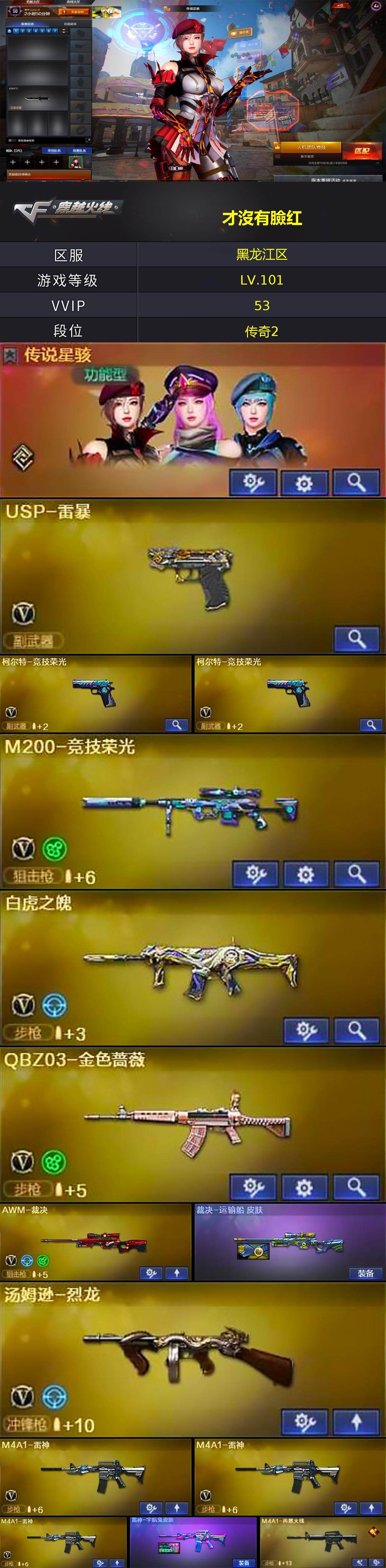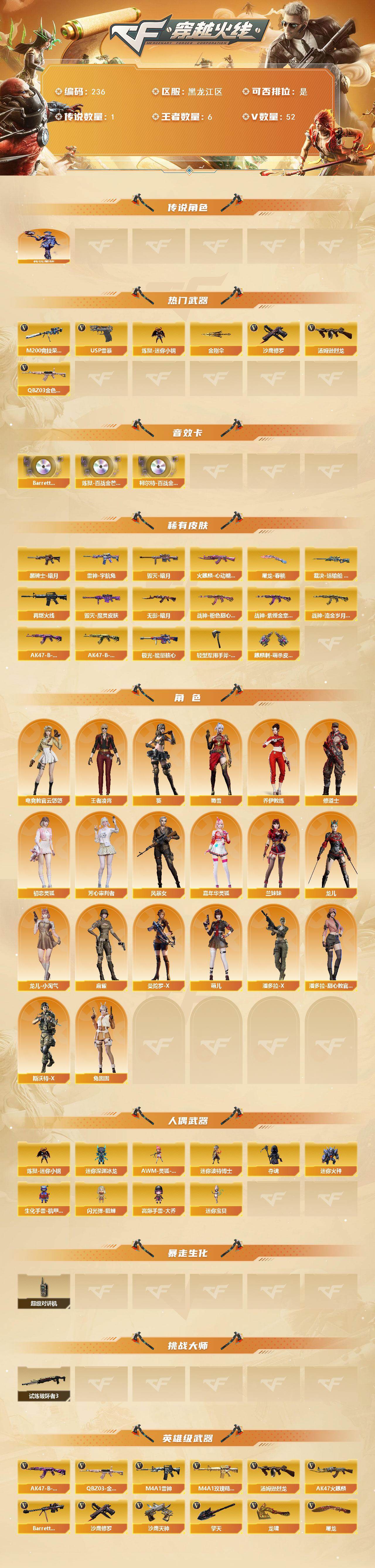 [14108769]黑龙江区-52V-6王者-0炫金 【传说角色】:传说星骇 【热门武器】:QBZ03-金色蔷薇,M200-竞技荣光,炼狱-迷你小钢,汤姆逊-烈龙,USP-雷暴,沙鹰-修罗,金刚伞 【音效卡】:Barrett-碧霄极光音效卡*2,炼狱-百战金芒-庆典舞曲音效卡,柯尔特-百战金芒-庆典舞曲音效卡 【皮肤】:裁决-运输船 皮肤,雷神-宇航兔皮肤,M4A1-再燃火线,火麒麟-心动糖果,毁灭-暗月,毁灭-魔灵皮肤,黑骑士-暗月,无影-暗月,战神-粉色甜心皮肤*2,战神-紫绶金章皮肤,战神-流金岁月皮肤,AK47-B-常胜将军-曹操,AK47-B-常胜将军-孙权*2,极光-能量核心,屠龙-春桃 皮肤,轻型军用手斧-再燃火线,麒麟刺-萌杀皮肤 【角色】:葵,电竞教官-云悠悠,王者凌霄,乔伊教练,修道士,初恋灵狐,芳心审判者,风暴女,嘉年华灵狐,兰妹妹,龙儿,龙儿-小淘气,麻雀,曼陀罗-X,萌儿,潘多拉-X,潘多拉-甜心教官,斯沃特-X,蜀雪,兔囡囡 【人偶武器】:炼狱-迷你小钢,迷你宝贝*2,AWM-灵狐-15周年嘉年华*2,迷你深渊冰龙*3,迷你波特博士,夺魂,迷你火种,生化手雷-机甲核心*2,闪光弹-貂蝉,高爆手雷-大乔 【暴走生化】:超级对讲机 【挑战大师】:试炼破坏者III 【英雄级武器】:AK47-火麒麟*3,M4A1-雷神*3,M4A1-武圣,无影-神兵利器,黑武士-锦绣游龙,M4A1-玫瑰精灵,QBZ03-金色蔷薇,烈火-动感闪耀,王者之武-觉醒版,王者之势-觉醒版,AK47-B-战神,AK47-B-常胜将军,白虎之魄-觉醒版,Barrett-毁灭,AWM-裁决,M200-竞技荣光,炼狱-百战金芒,汤姆逊-烈龙,沙鹰-修罗,沙鹰-天神*3,USP-雷暴,柯尔特-竞技荣光*2,Glock18-武圣,天神-动感闪耀,屠龙,龙啸,擎天,麒麟刺,擎天-竞技荣光,唐刀-神工天巧,屠龙-动感闪耀*2,麒麟刺-百战金芒,王者之啸-觉醒版,高爆手雷-竞技荣光,手雷-动感闪耀,闪光弹-竞技荣光,烟雾弹-竞技荣光,M4A1-赤狱骑士,M4A1-苍鸣雷神,Barrett-碧霄极光 【道具】:CFS限定背包,云山科技背包,亚洲杯纪念炫彩背包,全能枪王背包,战舰背包,炫彩背包-诺拉,炫彩背包,百战金芒炫彩背包,虎牙炫彩背包,超级背包,女皇终结者-魔龙之吻,救世主-黑桃战神,绿色巨人,灵魂忍者