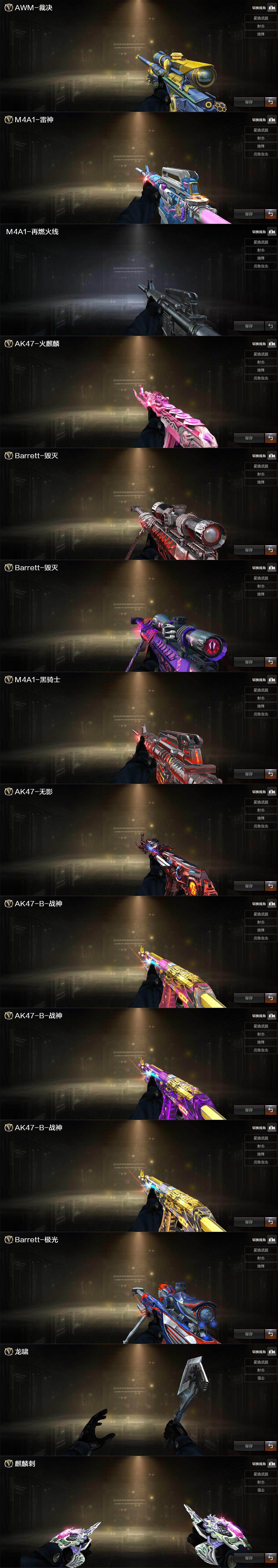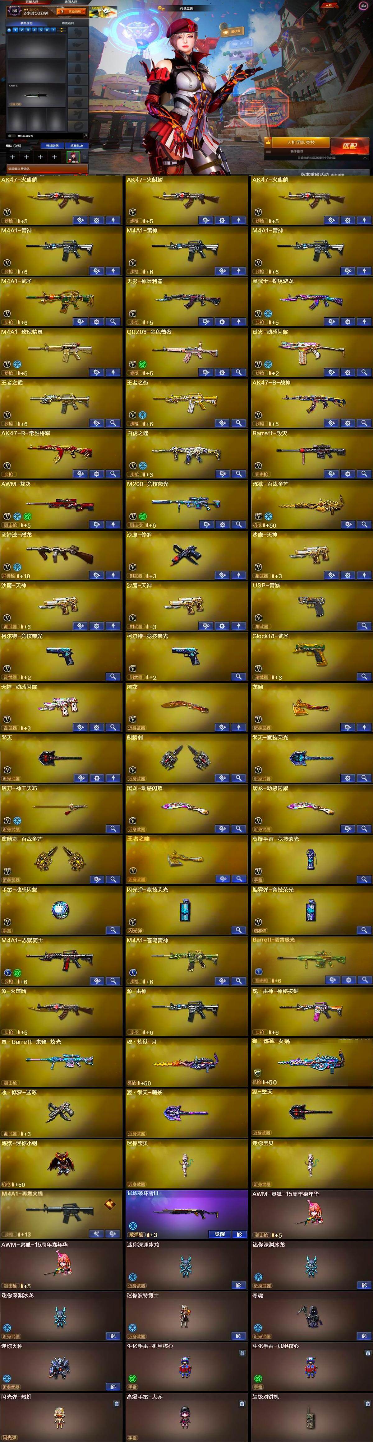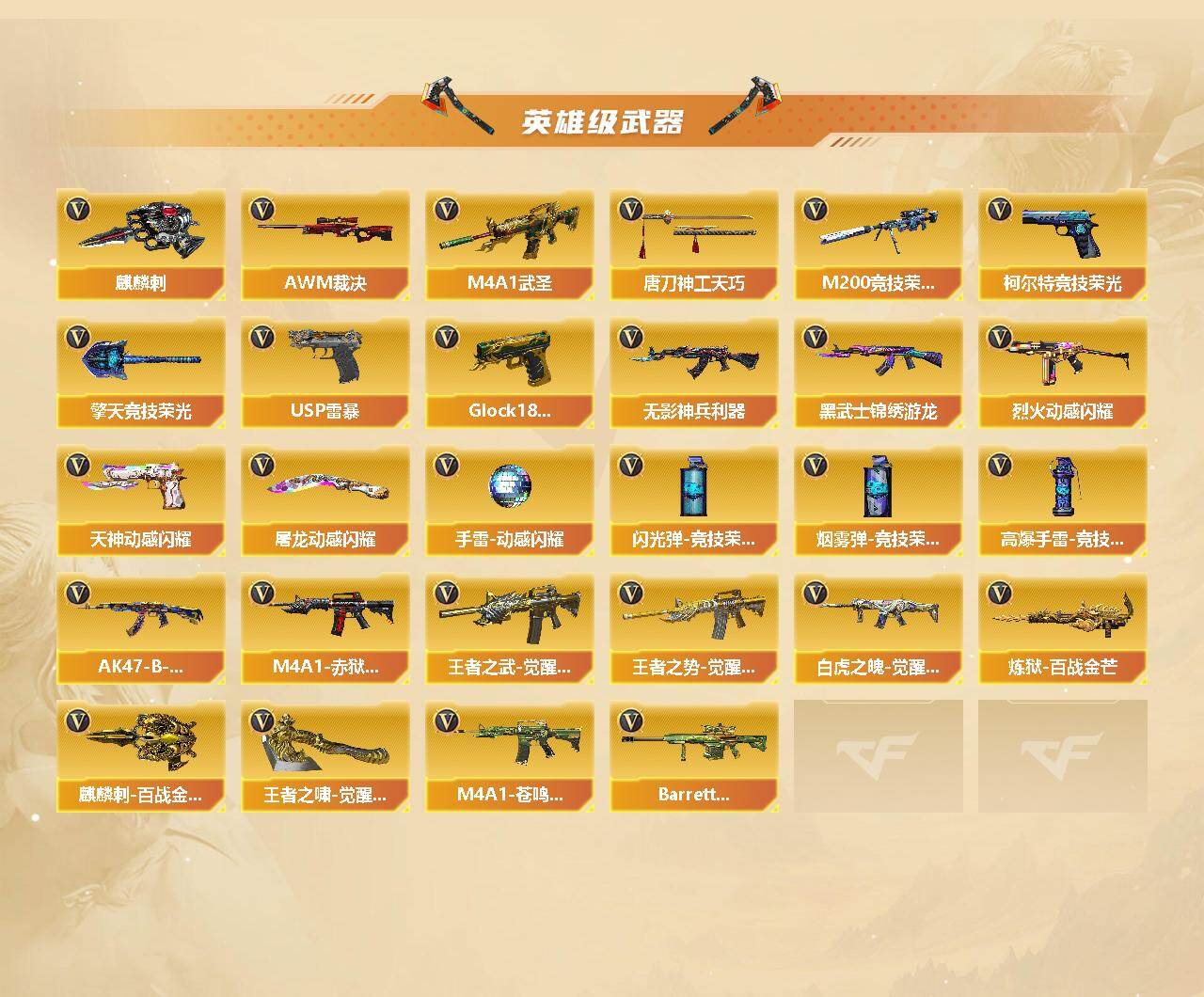 【英雄级武器】:AK47-火麒麟*3,M4A1-雷神*3,M4A1-武圣,无影-神兵利器,黑武士-锦绣游龙,M4A1-玫瑰精灵,QBZ03-金色蔷薇,烈火-动感闪耀,王者之武-觉醒版,王者之势-觉醒版,AK47-B-战神,AK47-B-常胜将军,白虎之魄-觉醒版,Barrett-毁灭,AWM-裁决,M200-竞技荣光,炼狱-百战金芒,汤姆逊-烈龙,沙鹰-修罗,沙鹰-天神*3,USP-雷暴,柯尔特-竞技荣光*2,Glock18-武圣,天神-动感闪耀,屠龙,龙啸,擎天,麒麟刺,擎天-竞技荣光,唐刀-神工天巧,屠龙-动感闪耀*2,麒麟刺-百战金芒,王者之啸-觉醒版,高爆手雷-竞技荣光,手雷-动感闪耀,闪光弹-竞技荣光,烟雾弹-竞技荣光,M4A1-赤狱骑士,M4A1-苍鸣雷神,Barrett-碧霄极光