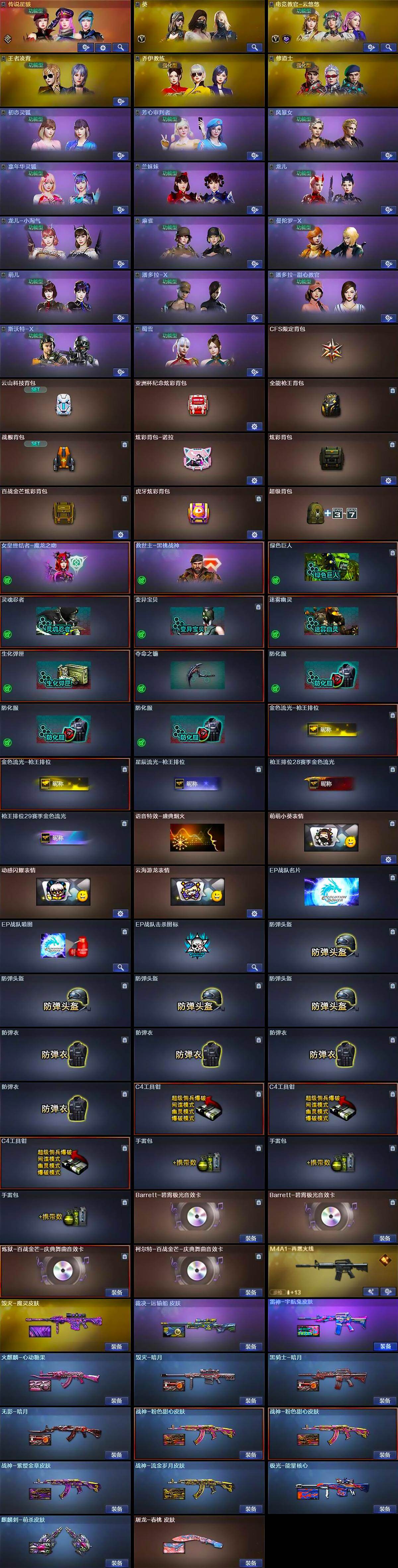【道具】:CFS限定背包,云山科技背包,亚洲杯纪念炫彩背包,全能枪王背包,战舰背包,炫彩背包-诺拉,炫彩背包,百战金芒炫彩背包,虎牙炫彩背包,超级背包,女皇终结者-魔龙之吻,救世主-黑桃战神,绿色巨人,灵魂忍者